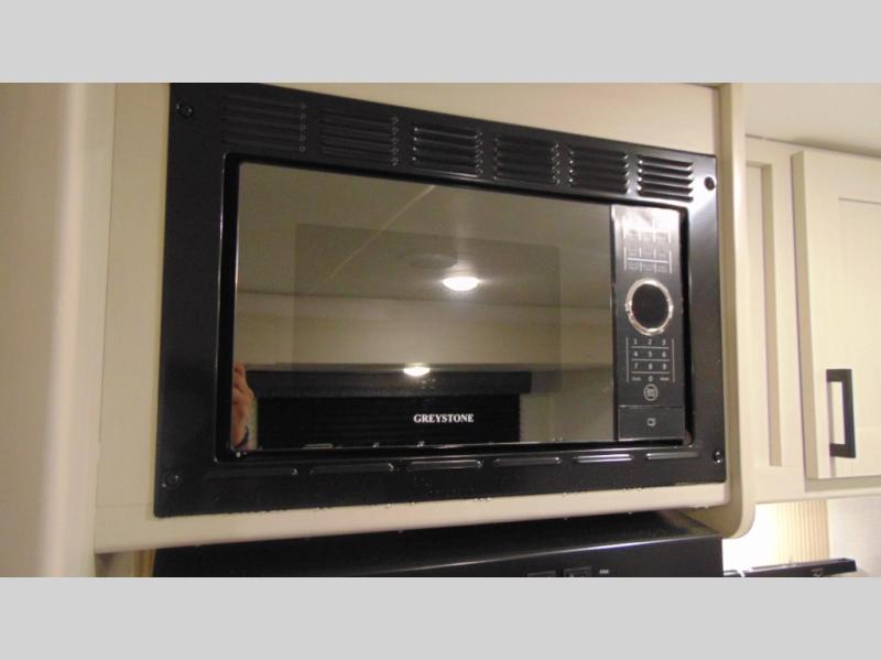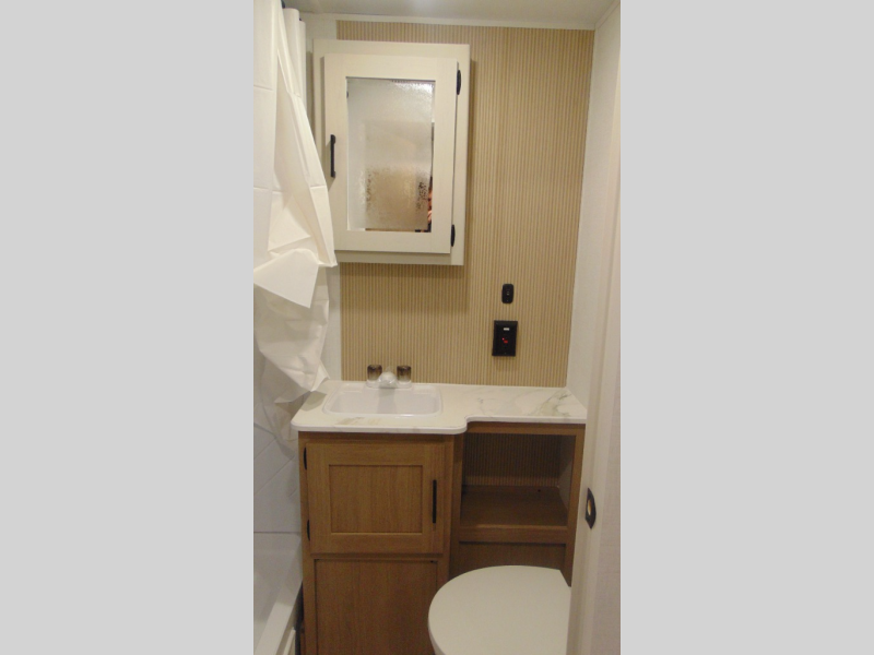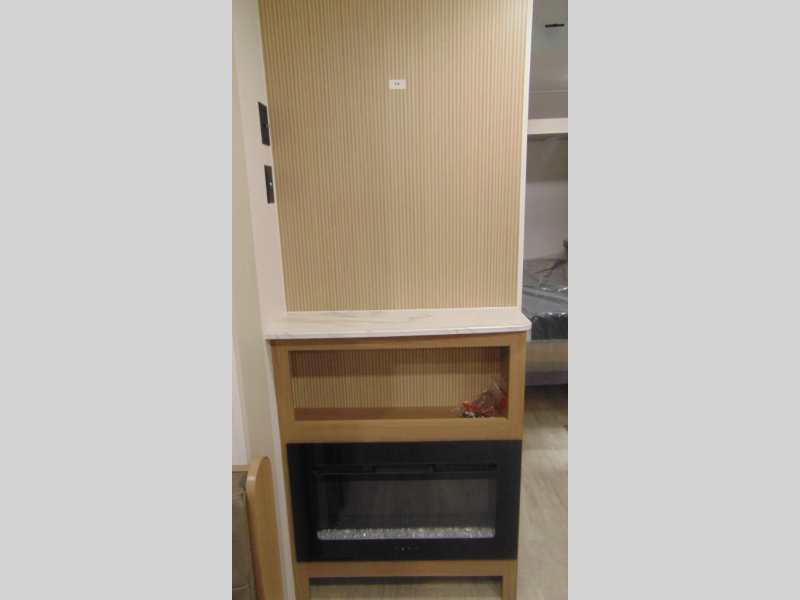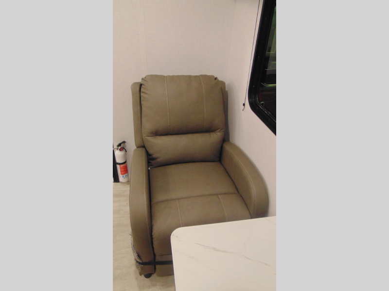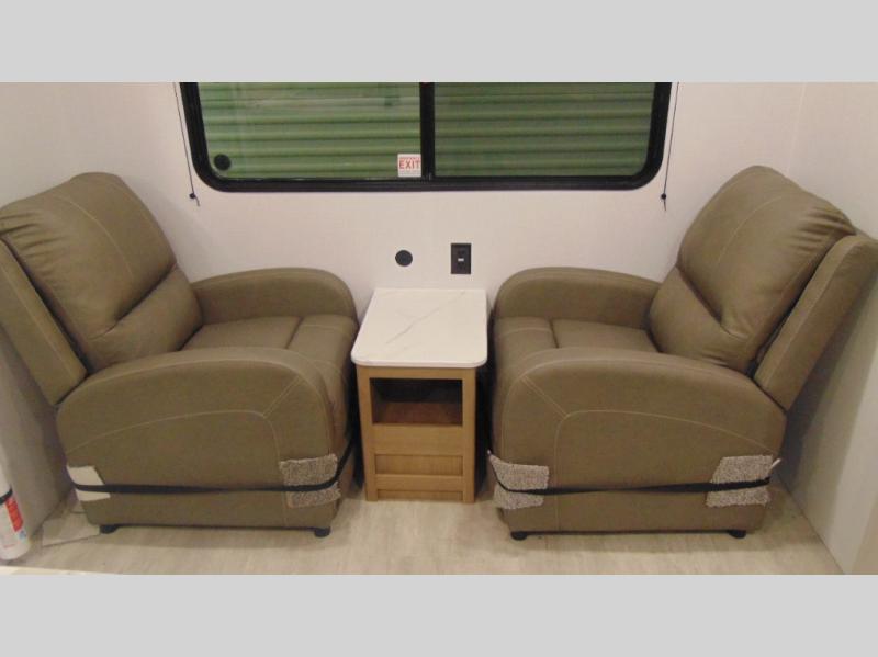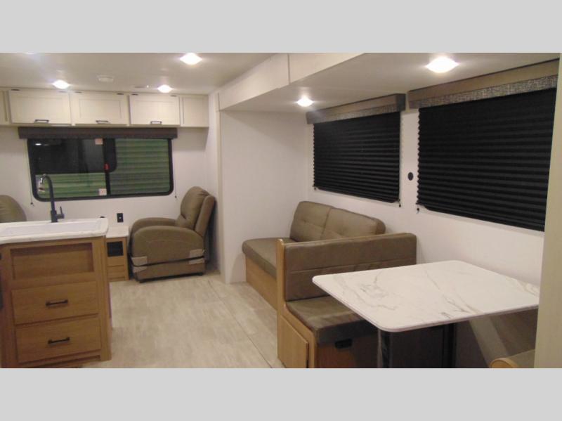 With dual entry doors, you can easily enter and exit this travel trailer! The jackknife sofa with footrest and booth dinette are next to each other near the fireplace, as well as two rear recliners allowing you to visit with other RVers or your family. The cook will have an oven and a microwave to make meals, and a 12V refrigerator for cold items, plus a galley sink to keep the dishes clean. Speaking of being clean, the full bathroom offers a shower with exhaust fan to eliminate unwanted steam as you clean yourself up after a fun day at the beach. The front private bedroom has a residential queen bed and one of the entrance/exit doors so you can slip out for an early morning fishing trip!