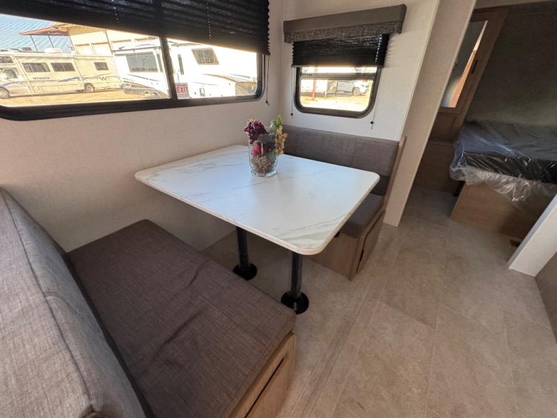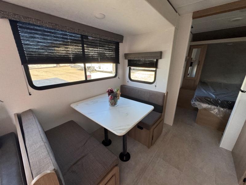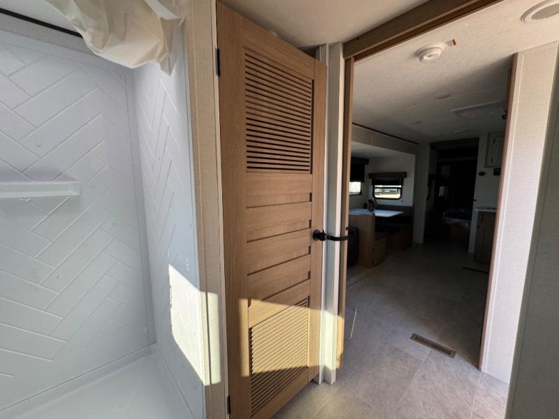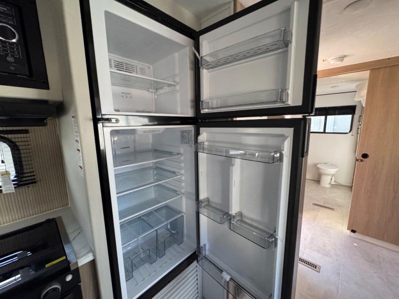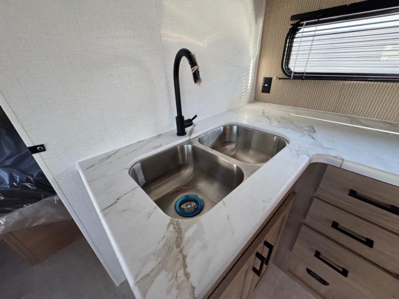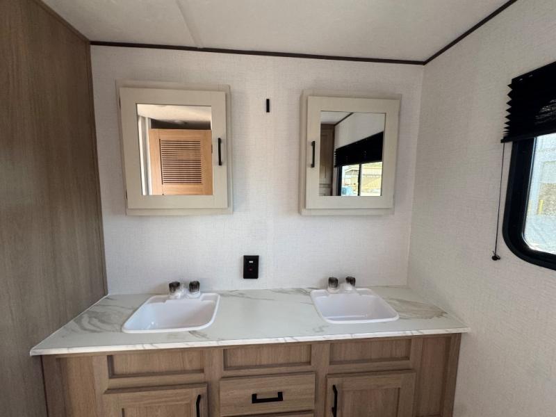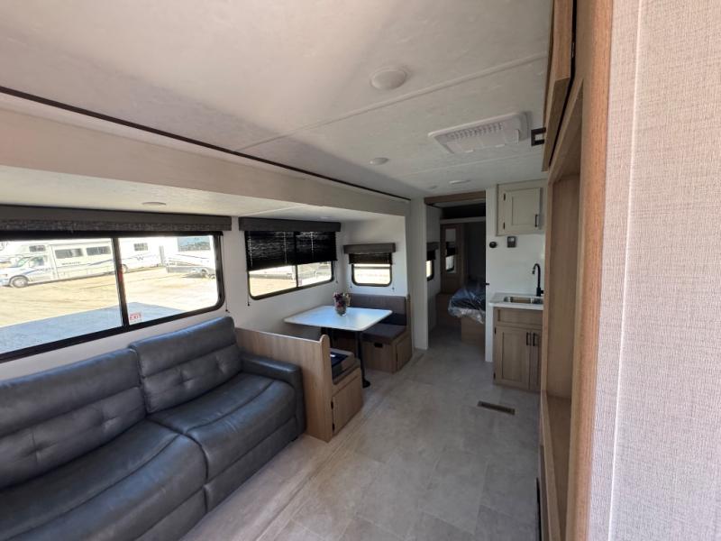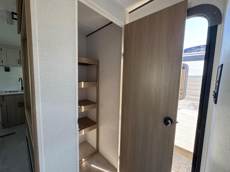 You'll love every minute spent in this spacious travel trailer! The front private bedroom includes a queen bed, dual closets, and an overhead shelf to keep your things organized. The U-shaped dinette and jack knife sofa within the large slide out in the living room can double as both seating space and sleeping space for guests. A full kitchen will let you make meals each day, and you'll appreciate the large pantry to keep snacks stocked. Head to the full rear bath to enjoy ample space to get ready, dual bath sinks, plus a linen closet with washer and dryer prep if you want to add these appliances.