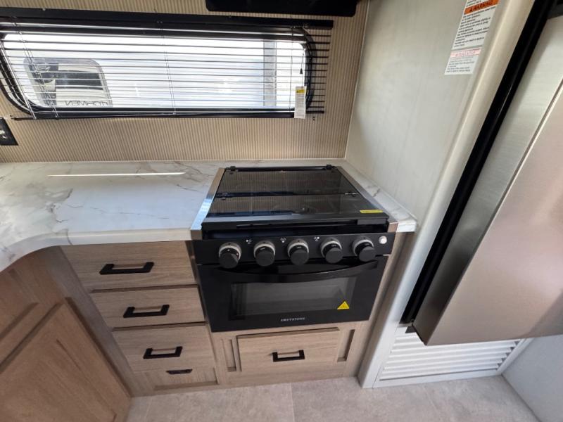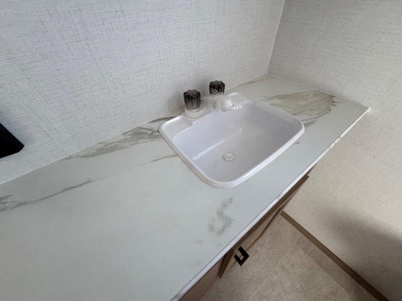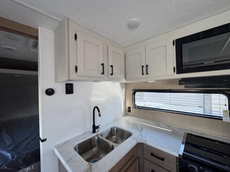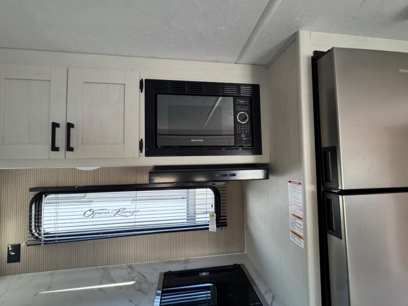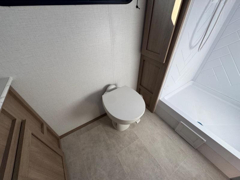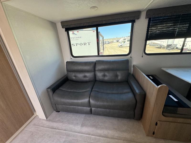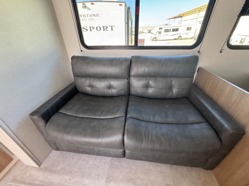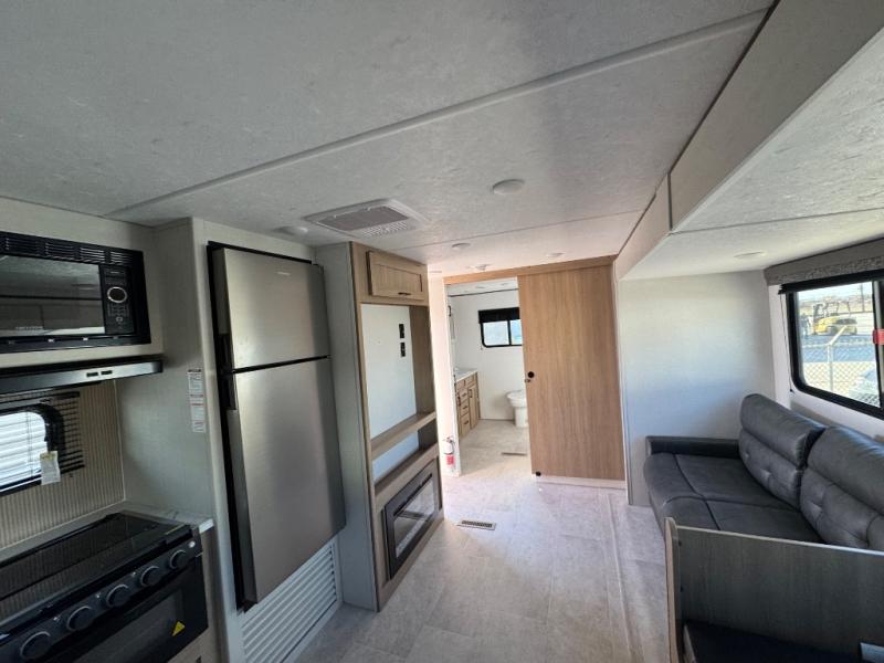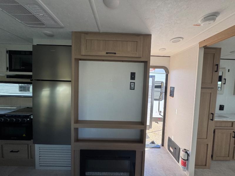 You'll love every minute spent in this spacious travel trailer! The front private bedroom includes a queen bed, dual closets, and an overhead shelf to keep your things organized. The U-shaped dinette and jack knife sofa within the large slide out in the living room can double as both seating space and sleeping space for guests. A full kitchen will let you make meals each day, and you'll appreciate the large pantry to keep snacks stocked. Head to the full rear bath to enjoy ample space to get ready, dual bath sinks, plus a linen closet with washer and dryer prep if you want to add these appliances.