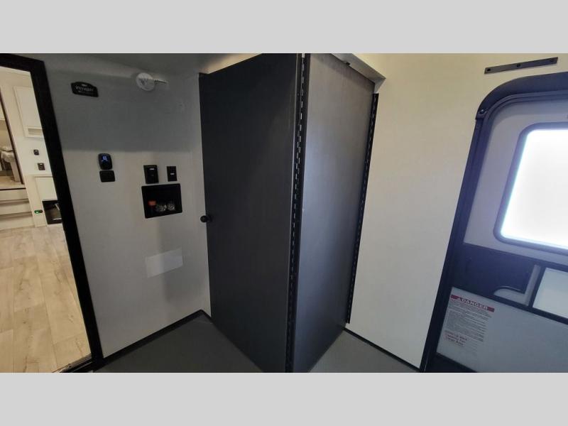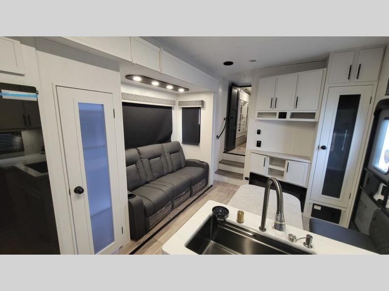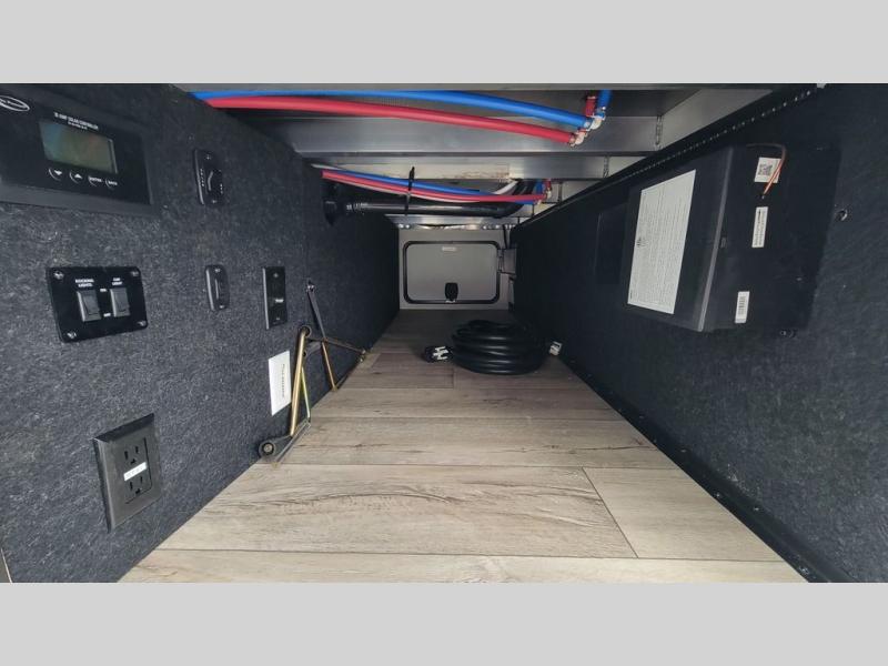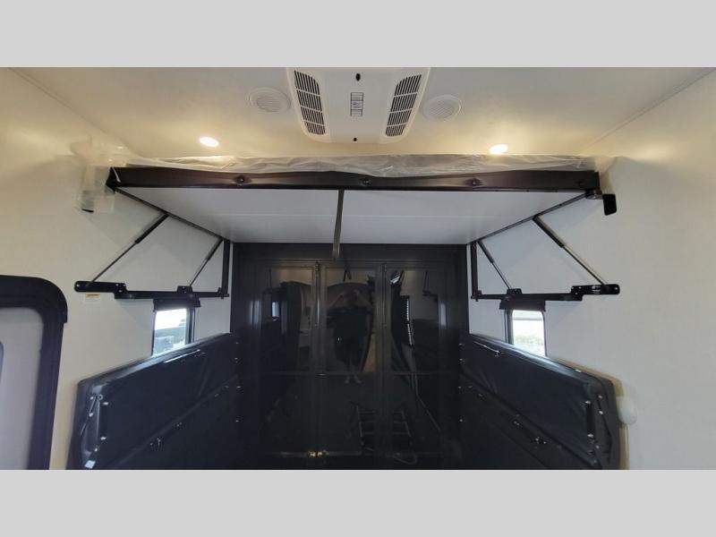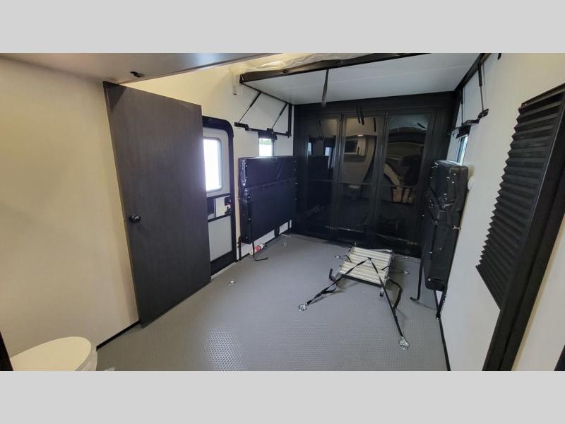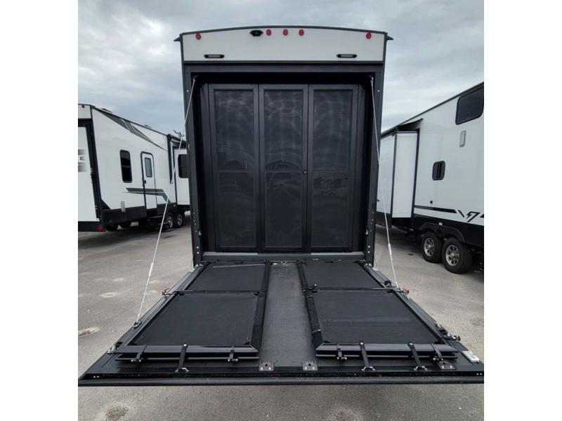 Load up your favorite off-road toys, grab a few friends and head out for a weekend of fun! This Voltage V-Series features a 14' garage with sleeping for seven or eight with the Bed Lift System over the dual sofas and dinette which convert to more sleeping in the garage area, a loft, and private front bedroom with queen bed. The main combined kitchen and living space features a reclining sofa with foot rest housed in the large slide that also includes a 16 cu. ft. 12V refrigerator and pantry for all of your food storage needs. There are full kitchen and bath amenities to keep you fueled and clean, and you will also enjoy the 40" TV and fireplace when relaxing inside. A 21' awning offers additional living space outside, and there is a Pac & Stack half bath in the garage for added convenience when coming in from a ride located beneath the loft. This unit also offers ample storage with a full pass-through compartment outside, and inside cabinets, pantry storage, plus wardrobe, dresser, and under bed storage as well.