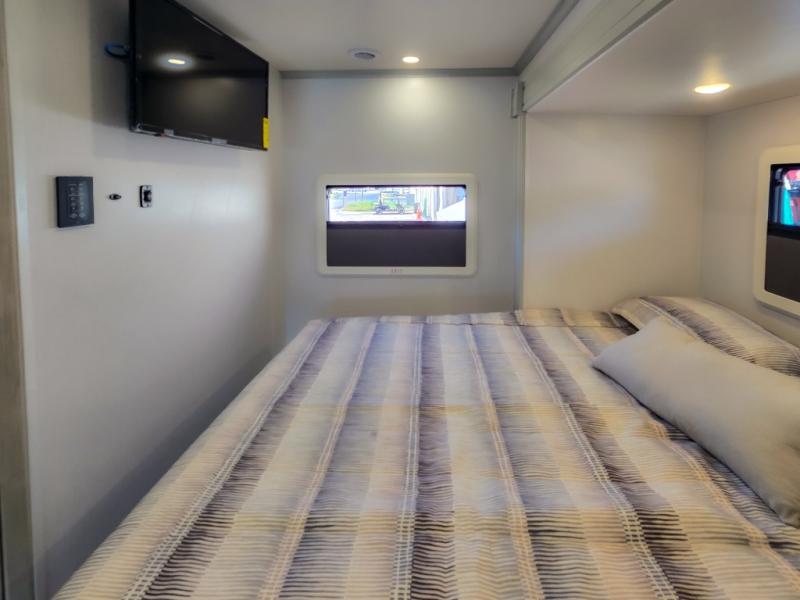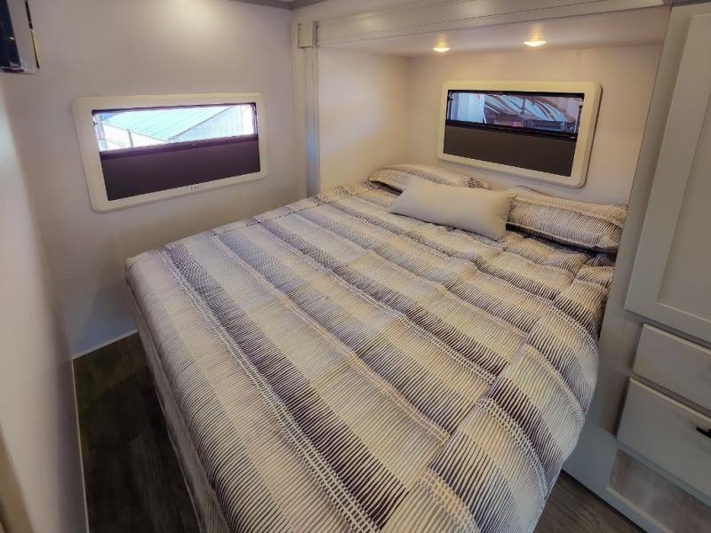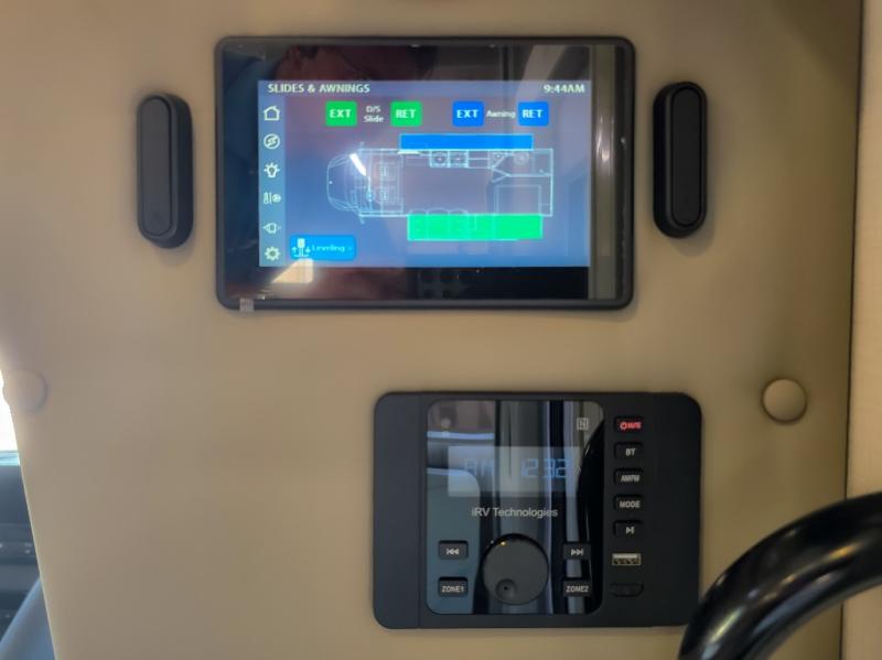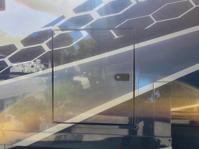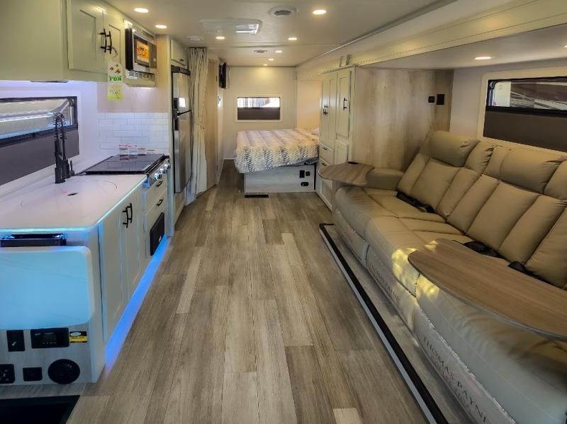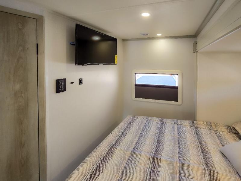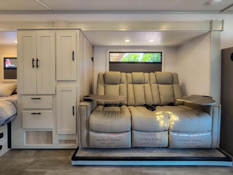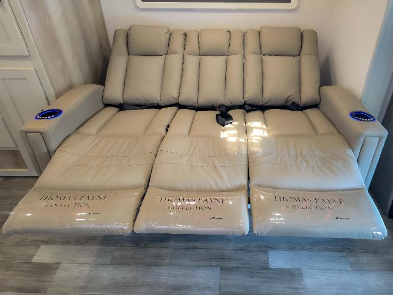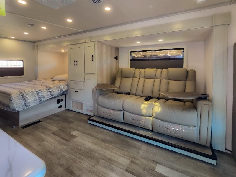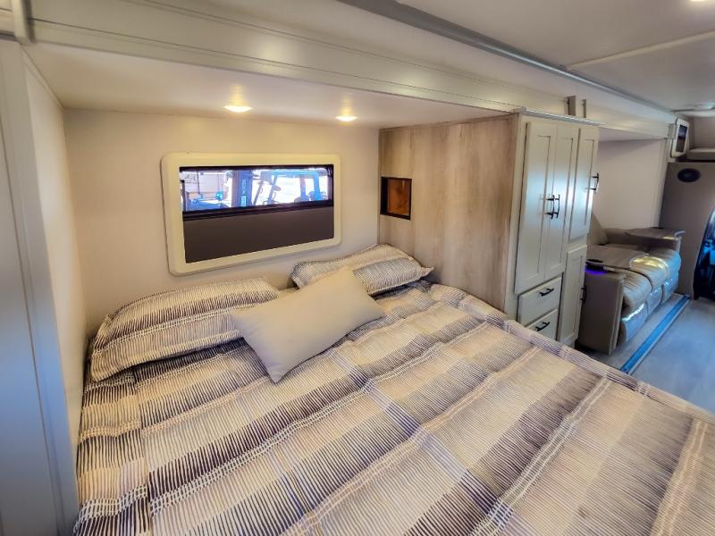 Take this motorhome on your greatest adventures yet! Start each morning feeling well rested after sleeping on the corner queen bed then head to the rear corner bathroom to freshen up in the shower with an Oxygenics body spa RV shower head and a skylight above for added headroom and natural lighting. Now that you're ready for the day, you can grab some eggs from the 8 cu. ft. two-door compressor-driven refrigerator and fry them up on the three burner cooktop, then enjoy them at the booth dinette. The kitchen also has a countertop extension for more meal prepping space and a convection microwave. This unit also includes a living room 32" LED Smart TV and a 32" LED smart TV across from the bed. You could even switch things up by replacing the booth dinette with an optional 3-seat power recliner, and adding a cab over bunk option!
