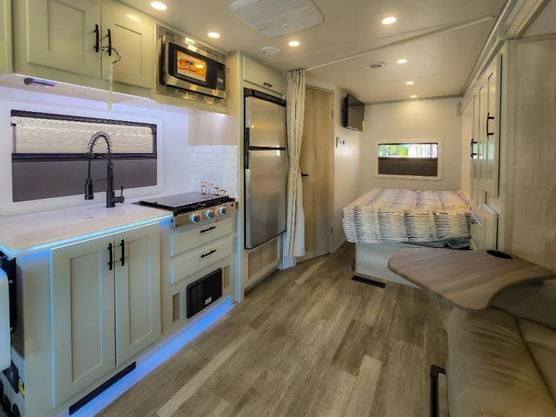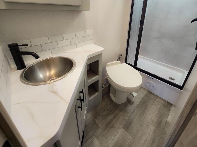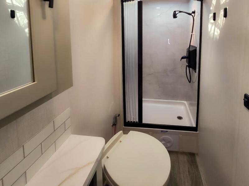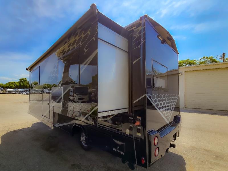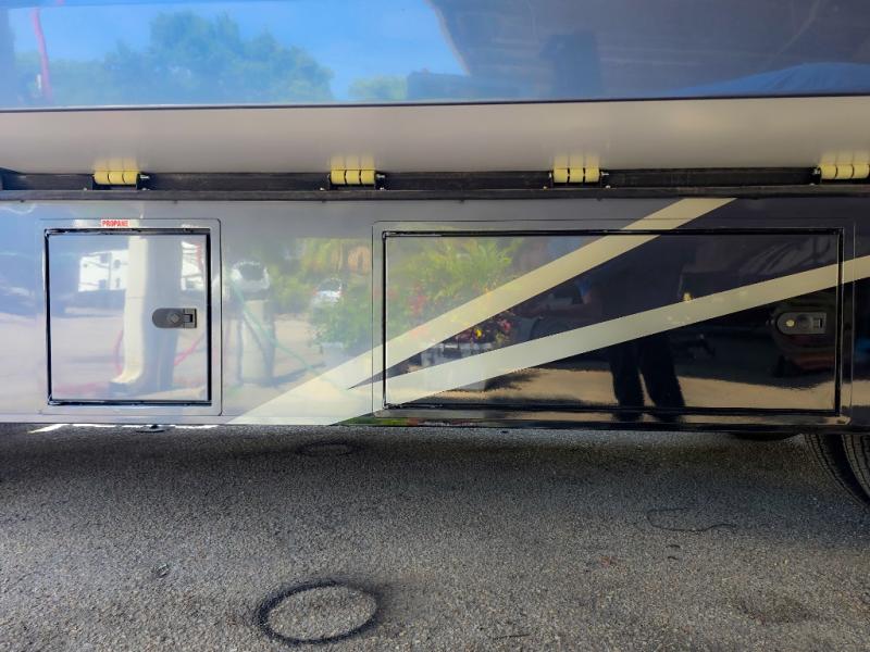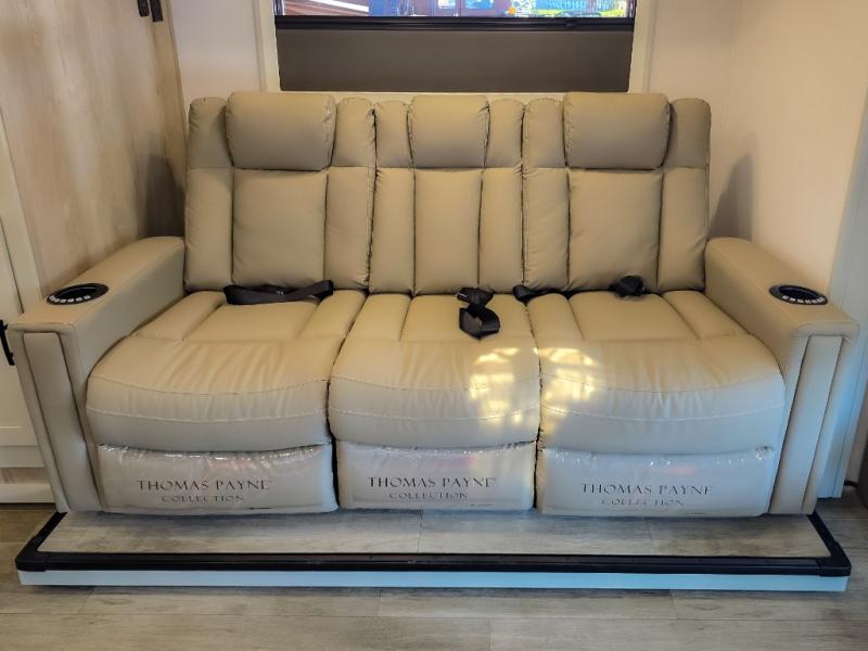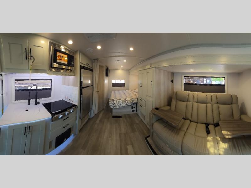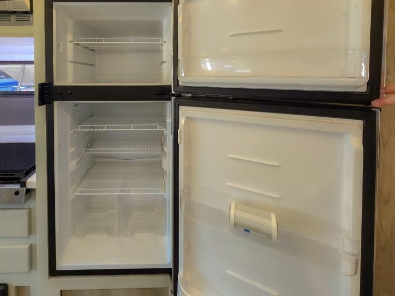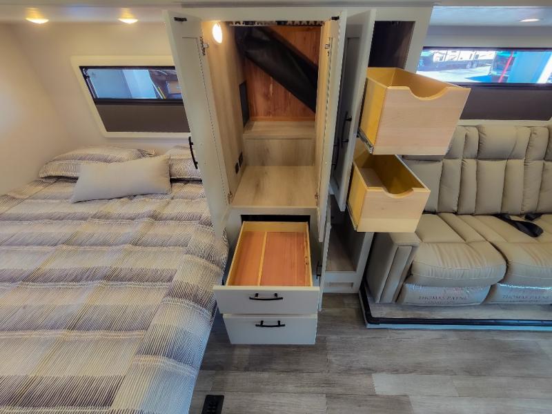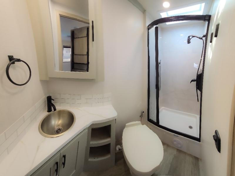 Take this motorhome on your greatest adventures yet! Start each morning feeling well rested after sleeping on the corner queen bed then head to the rear corner bathroom to freshen up in the shower with an Oxygenics body spa RV shower head and a skylight above for added headroom and natural lighting. Now that you're ready for the day, you can grab some eggs from the 8 cu. ft. two-door compressor-driven refrigerator and fry them up on the three burner cooktop, then enjoy them at the booth dinette. The kitchen also has a countertop extension for more meal prepping space and a convection microwave. This unit also includes a living room 32" LED Smart TV and a 32" LED smart TV across from the bed. You could even switch things up by replacing the booth dinette with an optional 3-seat power recliner, and adding a cab over bunk option!