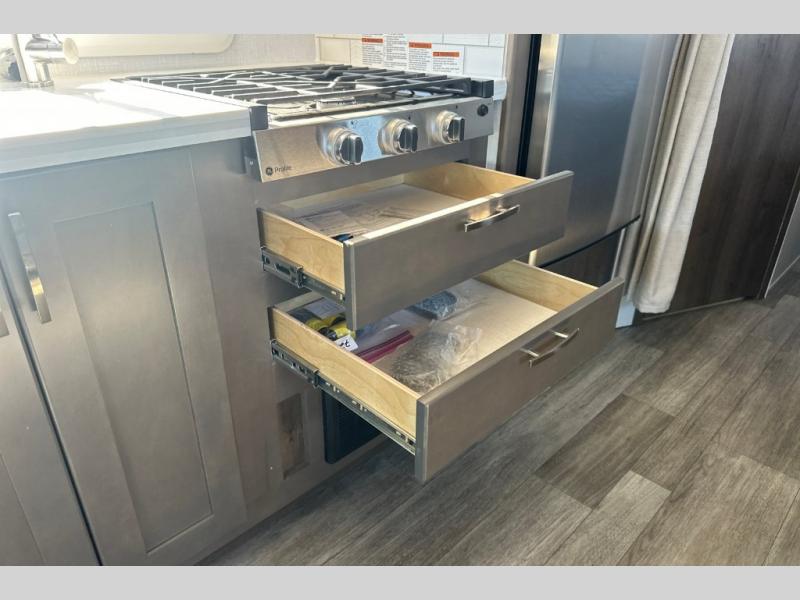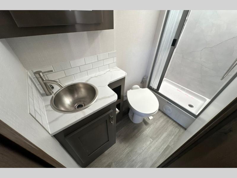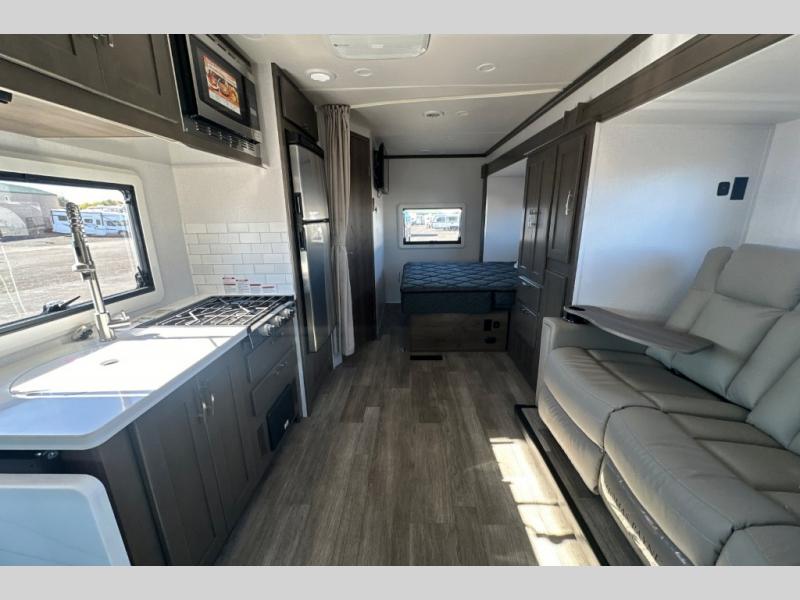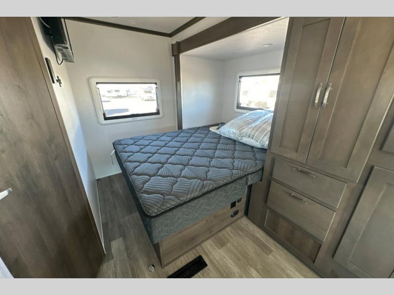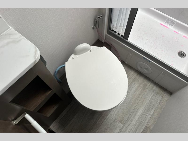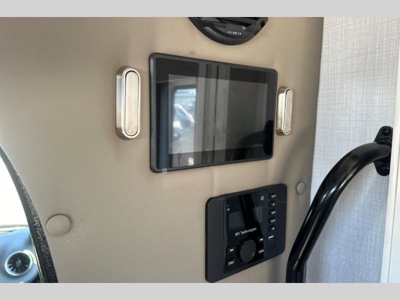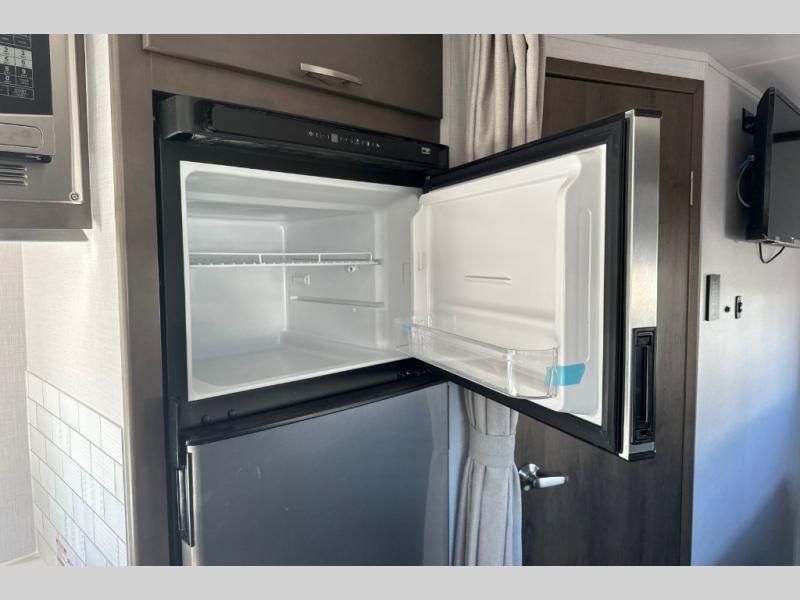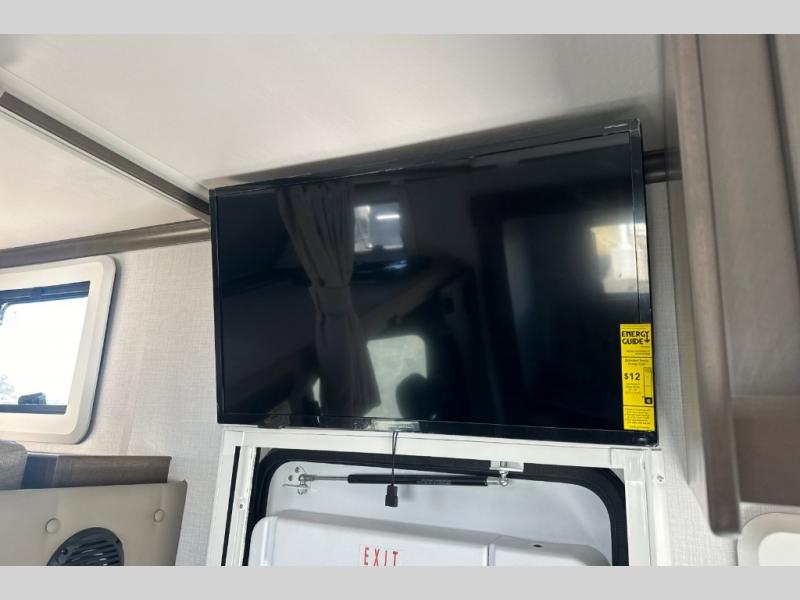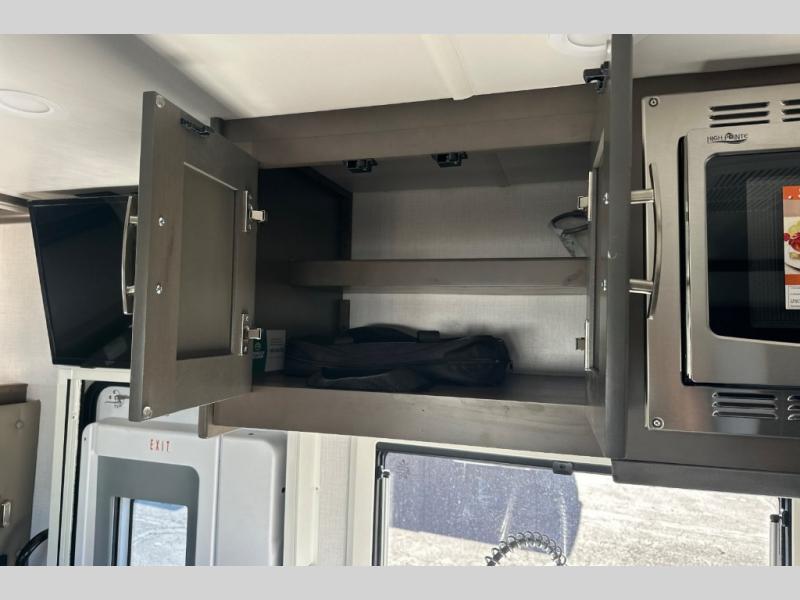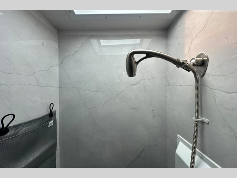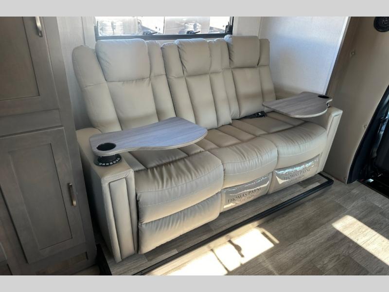 Take this motorhome on your greatest adventures yet! Start each morning feeling well rested after sleeping on the corner queen bed then head to the rear corner bathroom to freshen up in the shower with an Oxygenics body spa RV shower head and a skylight above for added headroom and natural lighting. Now that you're ready for the day, you can grab some eggs from the 8 cu. ft. two-door compressor-driven refrigerator and fry them up on the three burner cooktop, then enjoy them at the booth dinette. The kitchen also has a countertop extension for more meal prepping space and a convection microwave. This unit also includes a living room 32" LED Smart TV and a 32" LED smart TV across from the bed. You could even switch things up by replacing the booth dinette with an optional 3-seat power recliner, and adding a cab over bunk option!