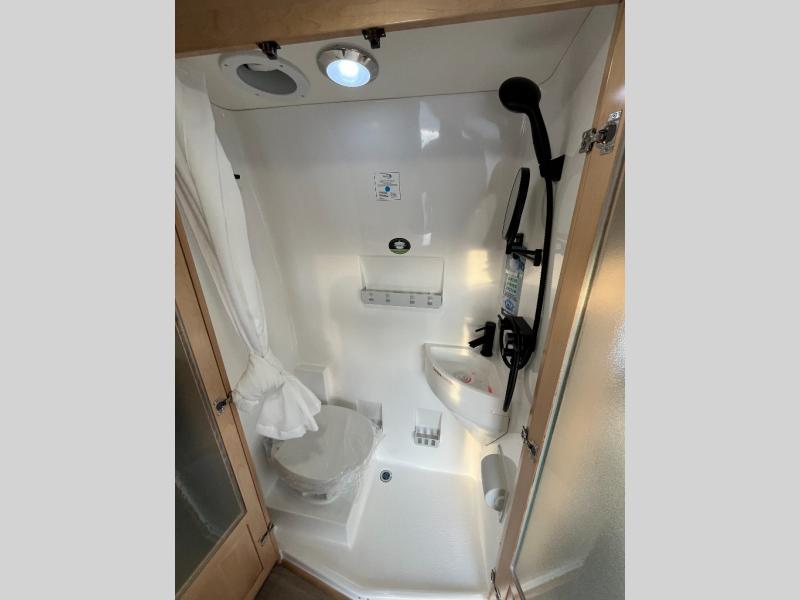 Enjoy a home away from home with this motorhome! The rear private bedroom has a queen bed slide for more interior space and privacy curtains to draw at night. If you need more sleeping space, just add the optional cab over bunk. The booth dinette slide is not only great for enjoying meals and play card games, but can also transform into an extra sleeping space. You could also switch it out for the optional theater seating to meet your specific needs. The bathroom has a shower with a skylight above for added natural lighting and an Oxygenics body spa RV shower head for a relaxing shower, and the vanity sink is just outside the bathroom so one person can get ready while another washes up. Store all of your outdoor gear in the exterior seamless rotocast storage compartment with LED lighting to see clearly at night too!