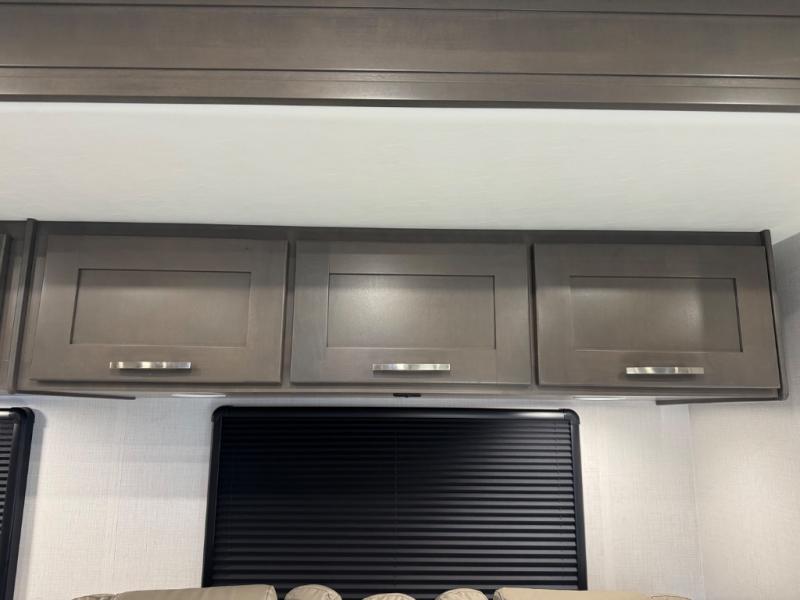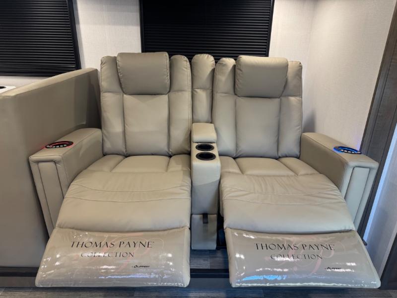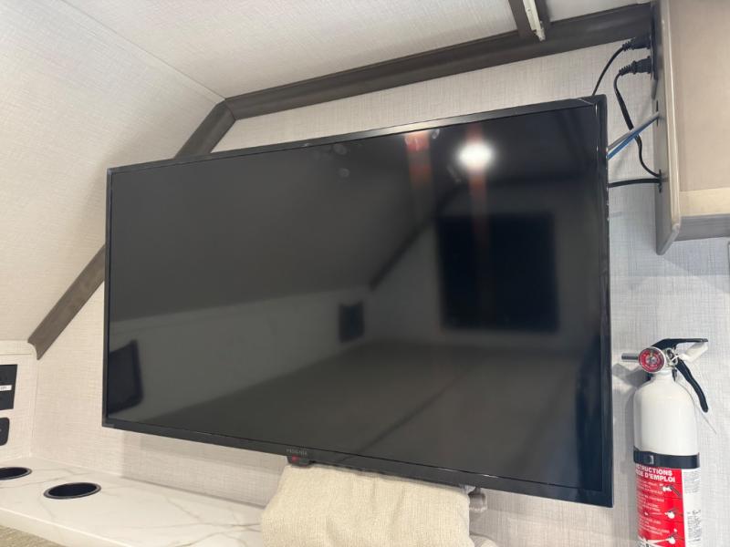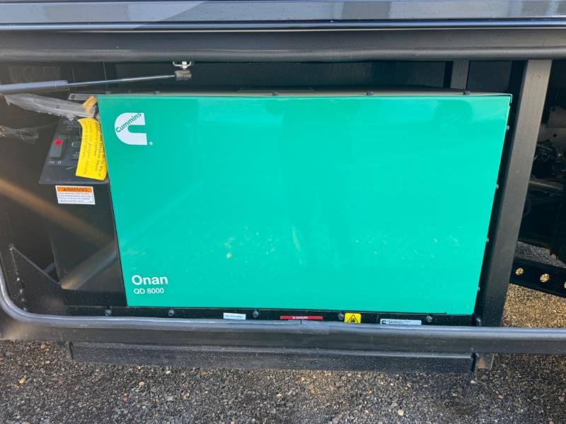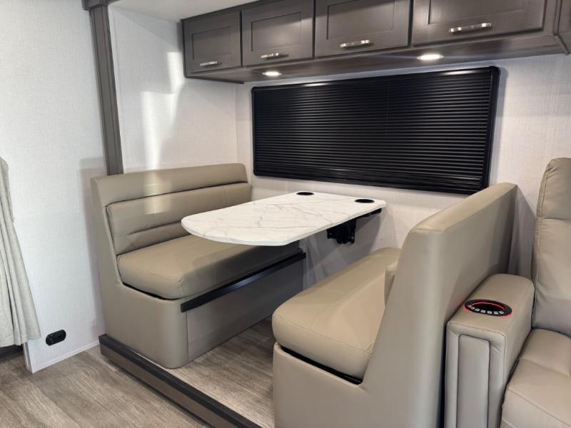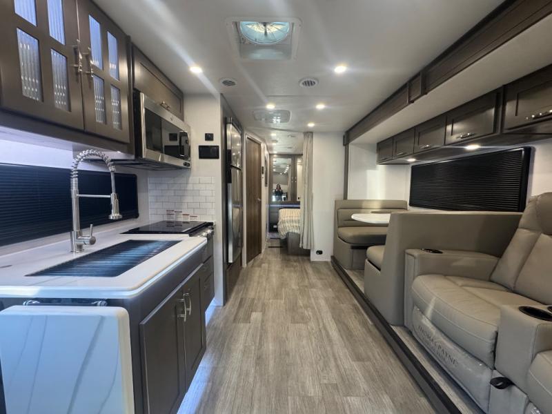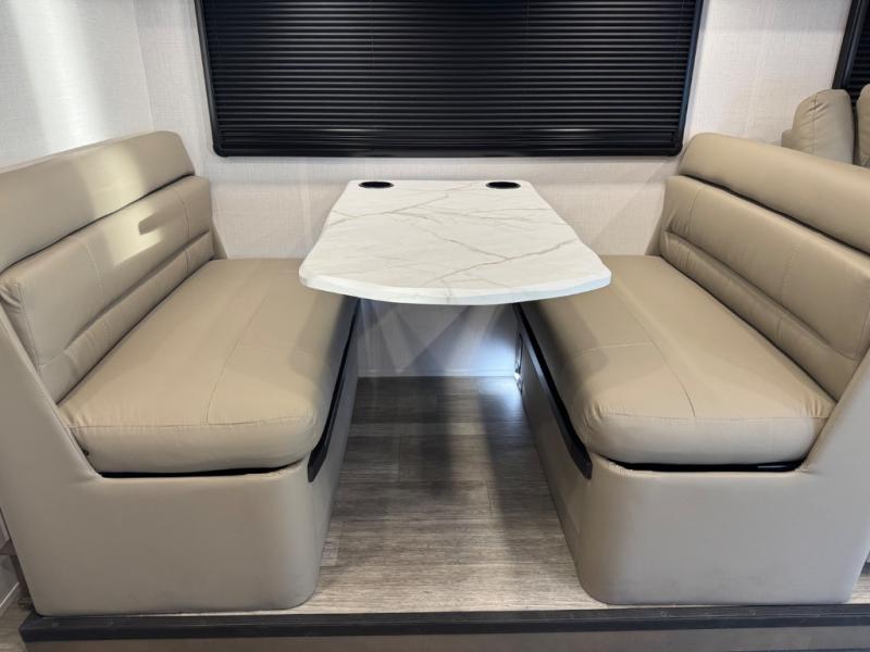 You will have plenty of space to walk about this motorhome with the dual slides! The booth dinette and sofa slide create an open concept living area and the sofa can be replaced for the optional theater seating if you prefer that instead. Freshen up after a long day of traveling in the rear corner bathroom with the designer shower that has a skylight above for more natural lighting and an Oxygenics body spa RV shower head for a more relaxing shower. Put on your comfy clothes stored in the wardrobe in the rear corner private bedroom then either lay on the 60" x 75" gel-infused memory foam mattress while you watch a movie on the 32" LED smart TV or head to the kitchen and whip up a meal with the three burner gas range and countertop extension. You could even head outside and watch a movie on the exterior 32" TV underneath the 16' dual-pitch armless awning!