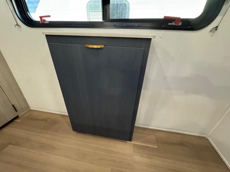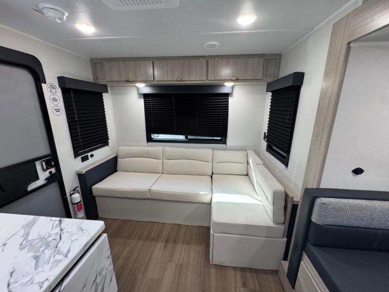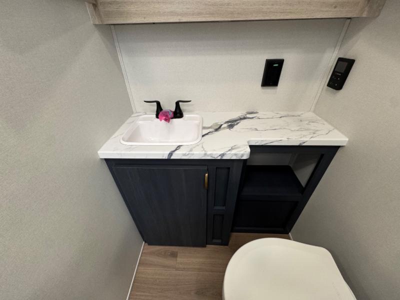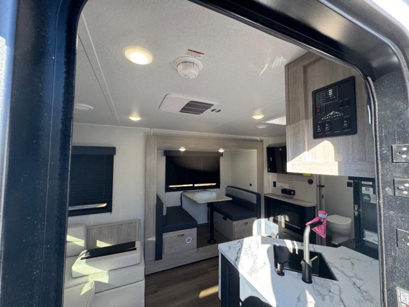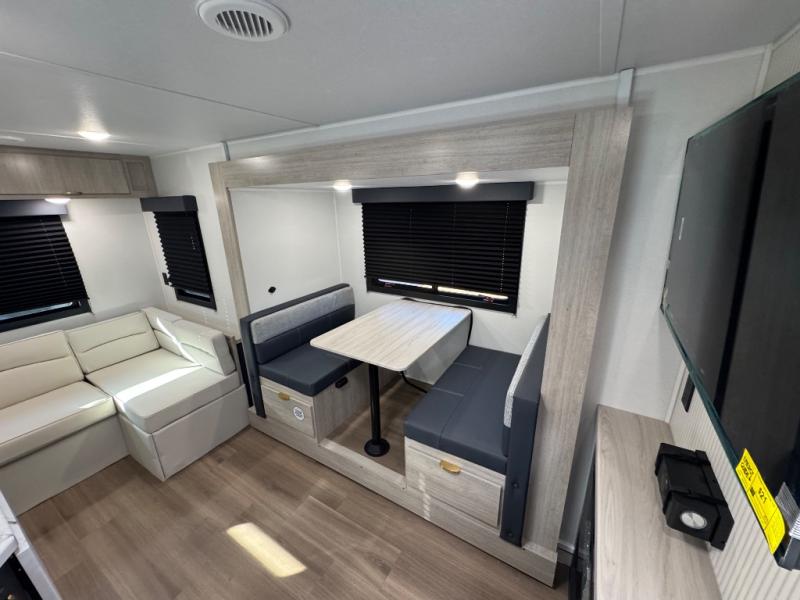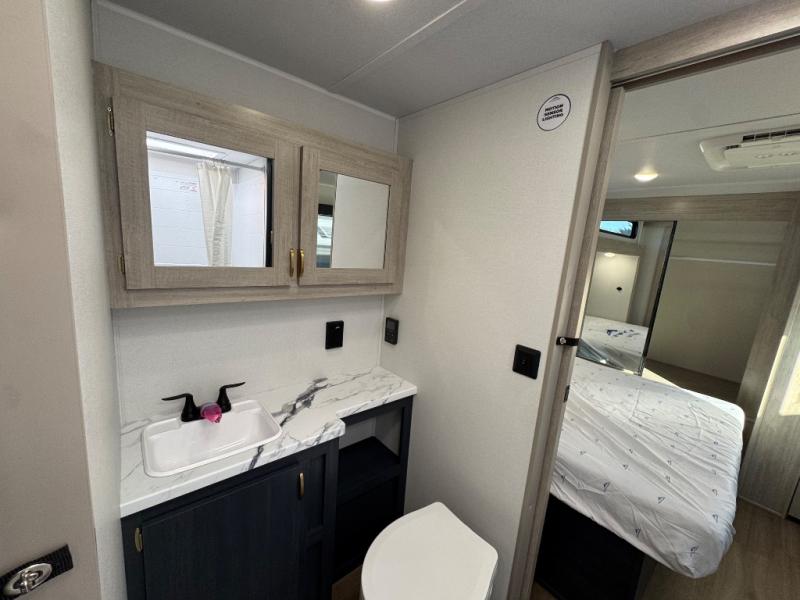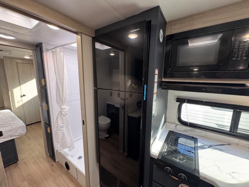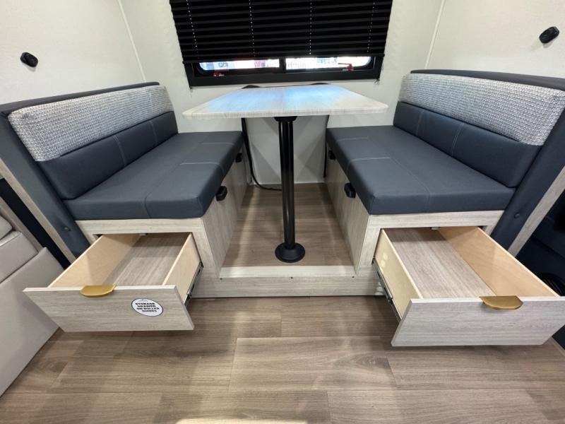 Chill in the plush jackknife sofa or gather around the booth dinette for epic game nights and laughter-filled meals. The countertop extension gives you extra space to whip up culinary masterpieces or tackle projects. The kitchen has everything you need: a sleek two-burner cooktop with a microwave below for speedy bites, a fridge to stash your faves, and overhead cabinets for clutter-free bliss. Furthermore, our walk-through bathroom is the perfect oasis, and you can get laundry sorted with washer/dryer prep and a handy hamper located in the bedroom. Also in the bedroom, you can sink into the front queen bed with heaps of storage underneath, and the wardrobe keeps your gear organized, so you can focus on making memories.