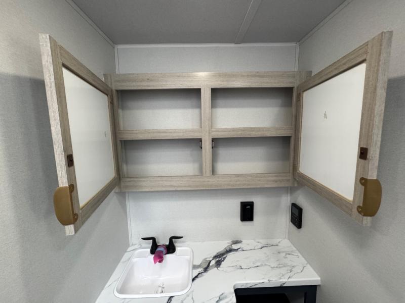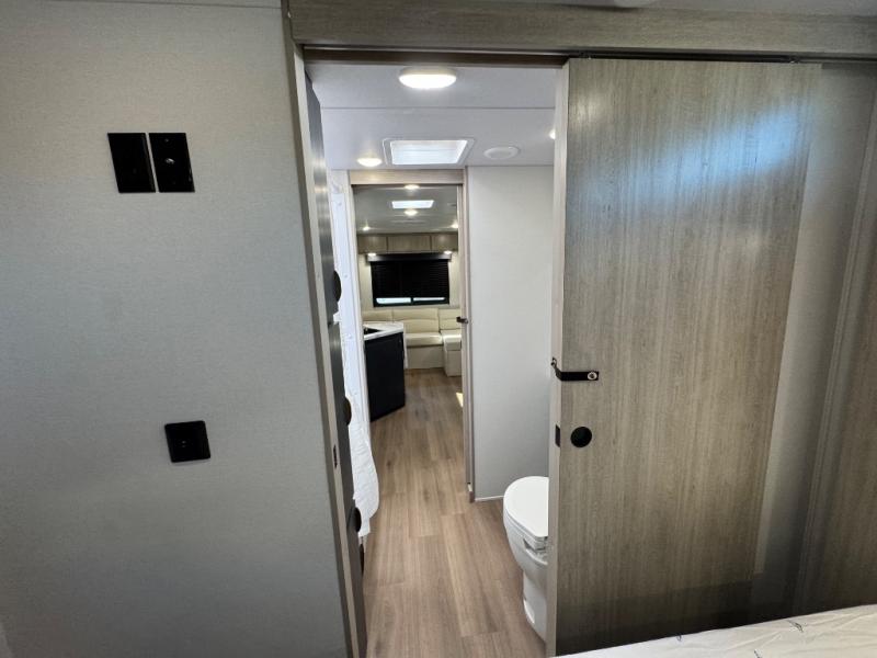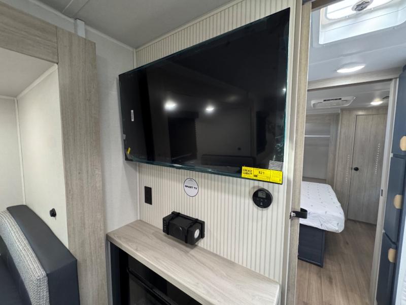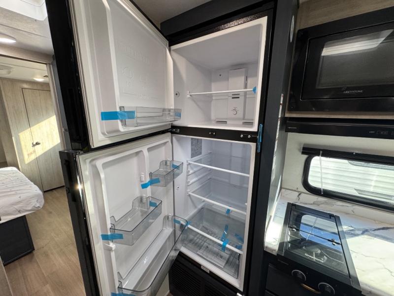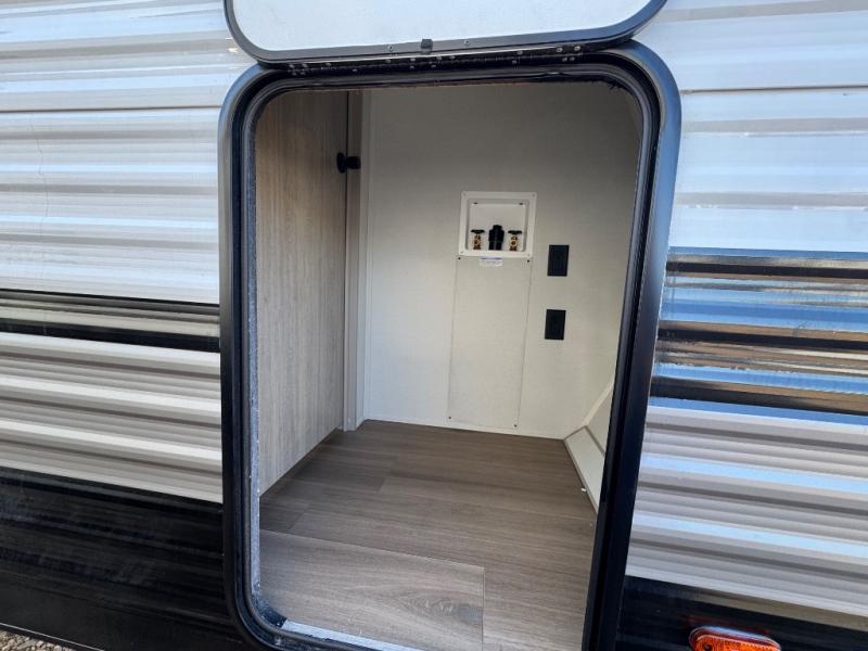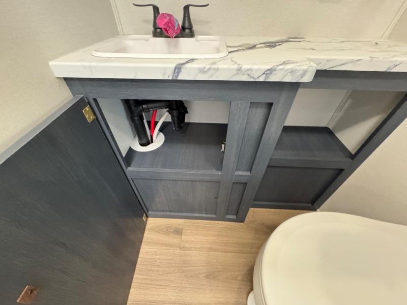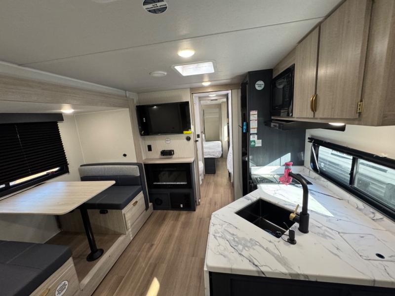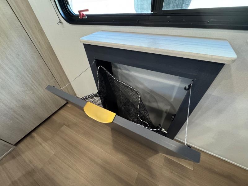 Chill in the plush jackknife sofa or gather around the booth dinette for epic game nights and laughter-filled meals. The countertop extension gives you extra space to whip up culinary masterpieces or tackle projects. The kitchen has everything you need: a sleek two-burner cooktop with a microwave below for speedy bites, a fridge to stash your faves, and overhead cabinets for clutter-free bliss. Furthermore, our walk-through bathroom is the perfect oasis, and you can get laundry sorted with washer/dryer prep and a handy hamper located in the bedroom. Also in the bedroom, you can sink into the front queen bed with heaps of storage underneath, and the wardrobe keeps your gear organized, so you can focus on making memories.
