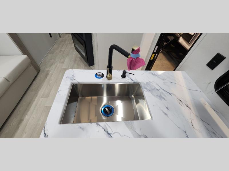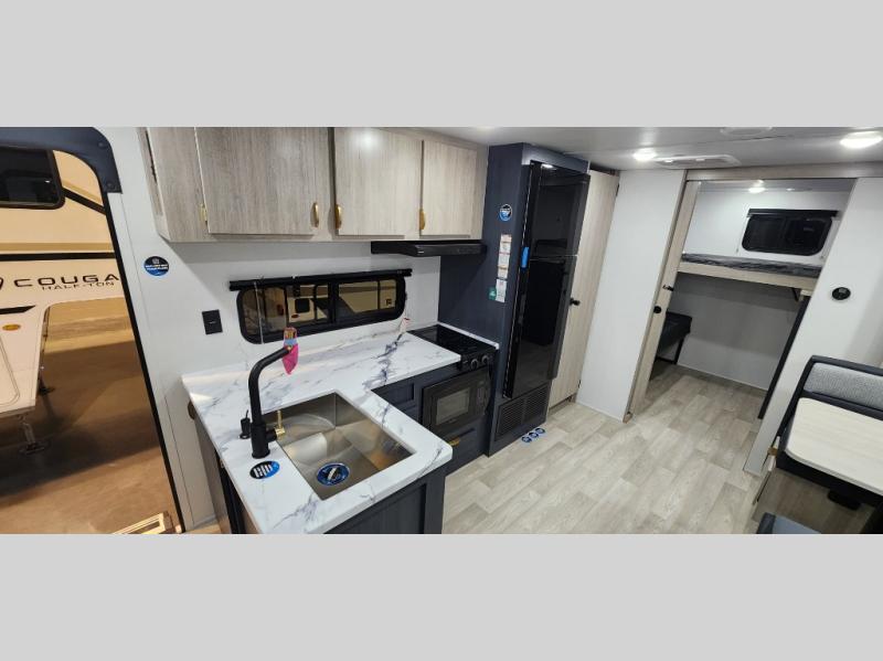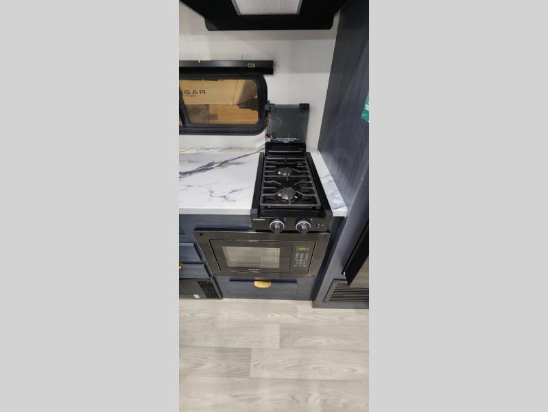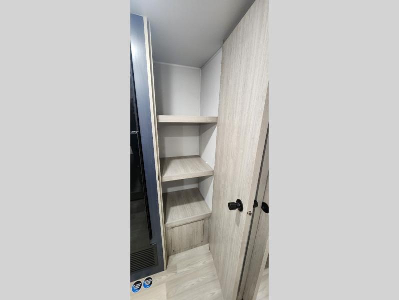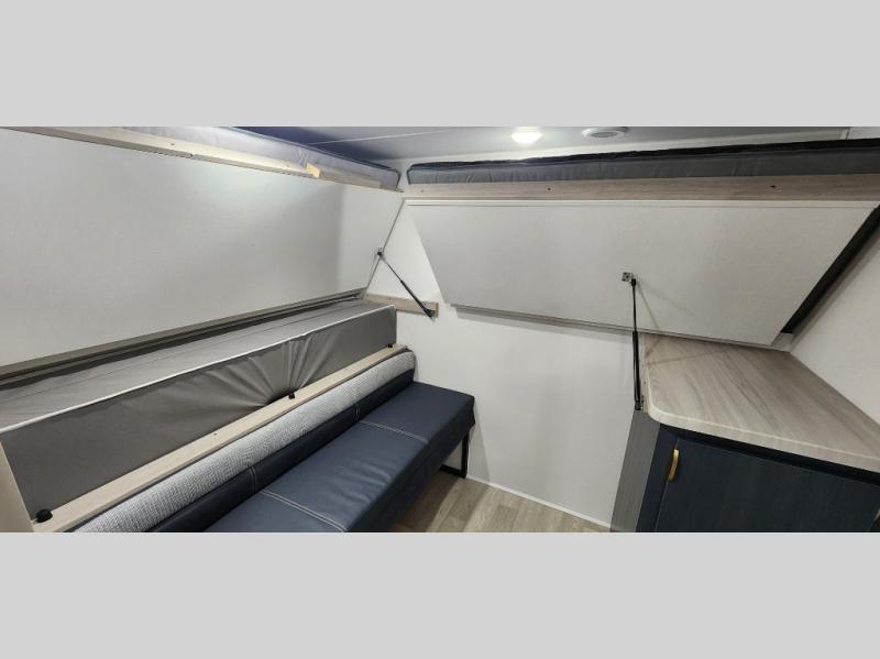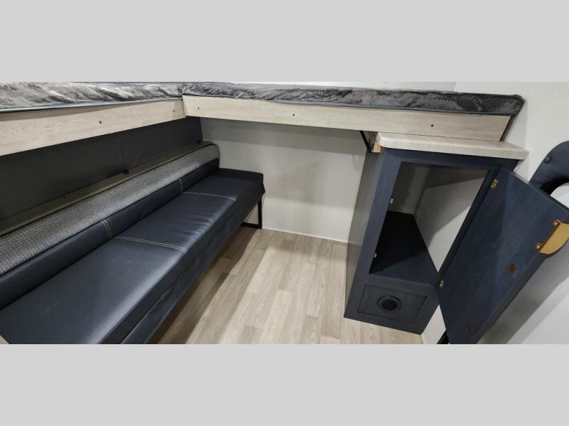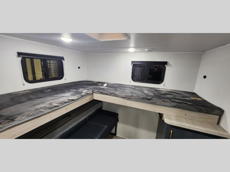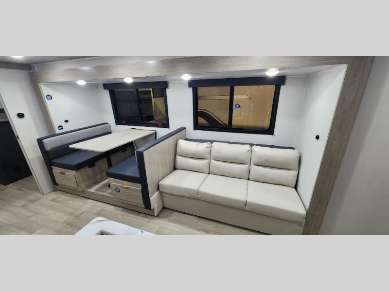 The rear bunkhouse is perfect for families or friends, with bunk beds for the kiddos, a comfy queen bed, and a wardrobe to stash gear. Plus, the front bedroom’s a grown-up retreat with a king bed, ample wardrobes, and handy nightstands. In the heart of the unit, the booth dinette is great for meals, games, or planning adventures, and the jackknife sofa is a comfy spot to lounge. The kitchen has all essentials: a pantry for snacks, a fridge for chilled goodies, and a microwave for quick bites.