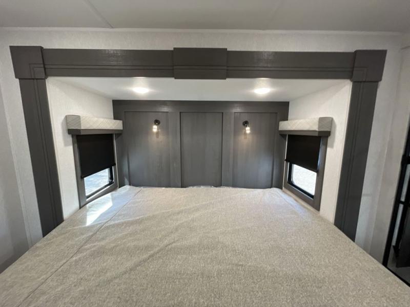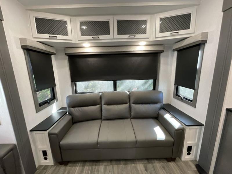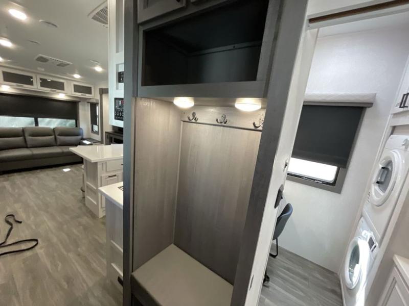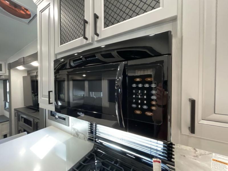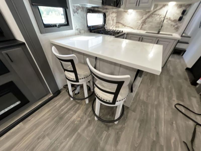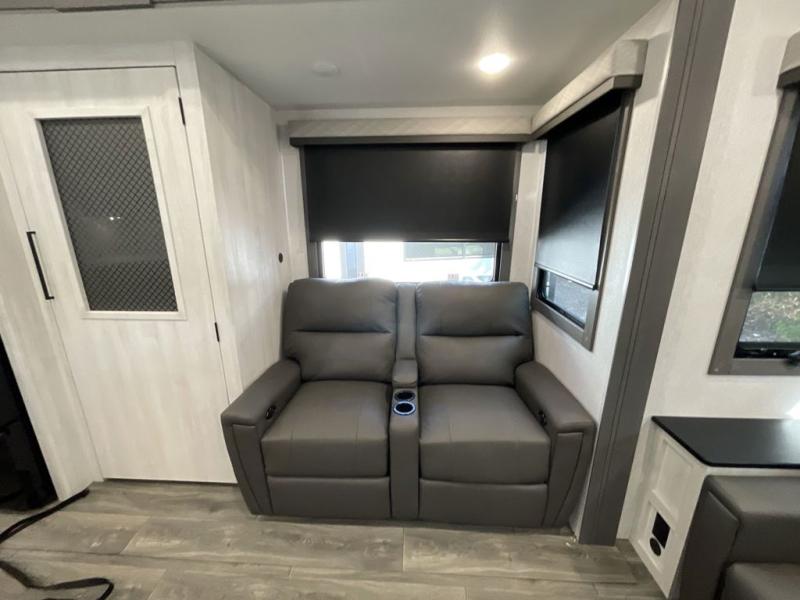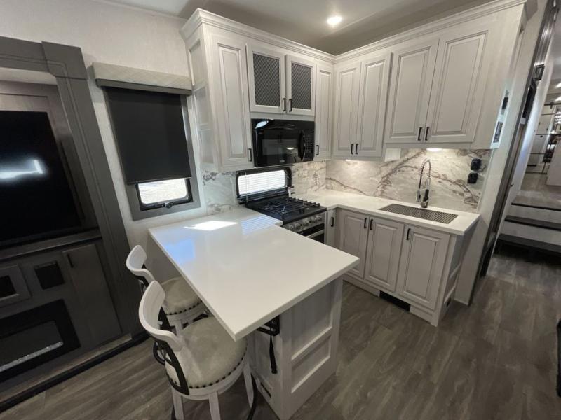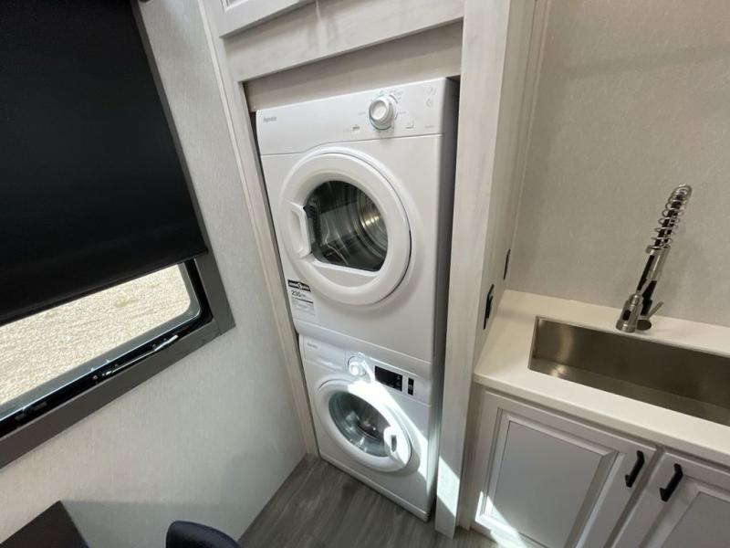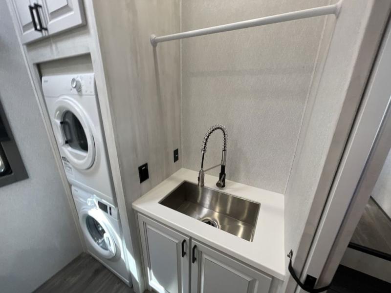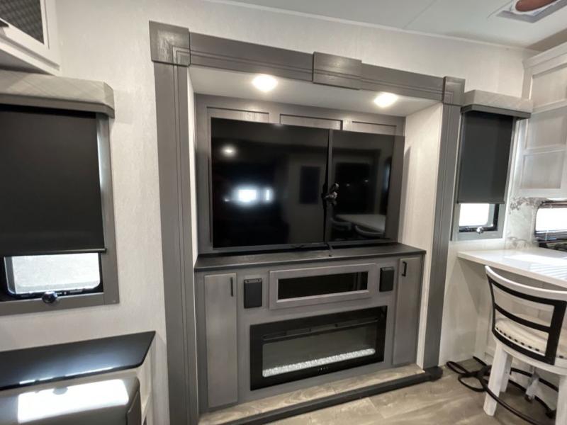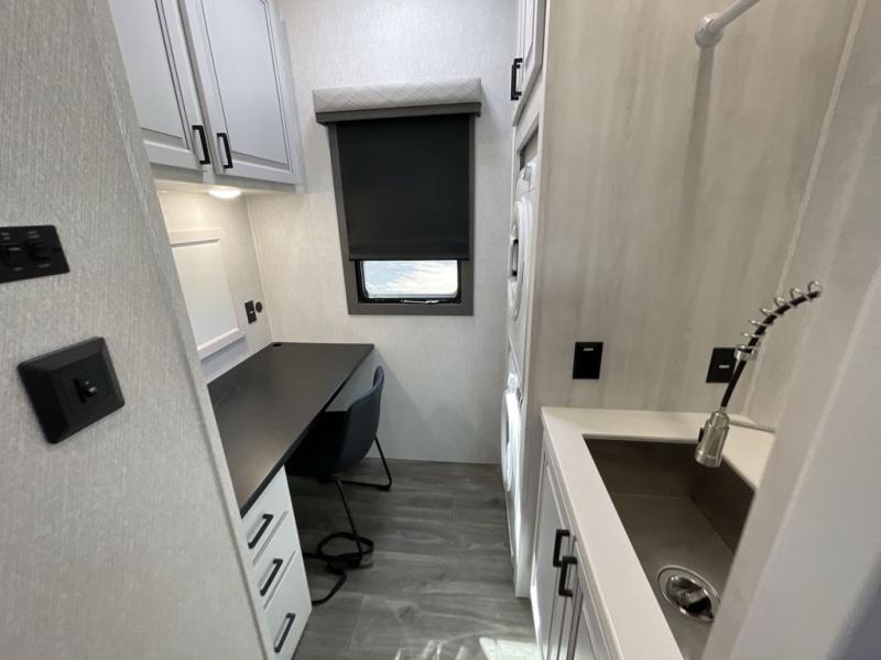 Head to the lake in this spacious fifth wheel for four! You will love the front private bedroom with a king bed slide out, sliding dresser top with hidden storage, and front closet to keep your clothes organized. The full bath is right next to the bedroom for easy access at night, and you're going to love having the utility room in this unit. There is stackable washer and dryer prep, a desk or laundry table, plus a sink with a mirror, making this room multi-functional! A full kitchen includes a u-shaped counter, a four burner range and an over-the-range microwave, plus a 16 cu. ft. refrigerator and walk-in pantry with a coffee bar and shelves. There is also a breakfast bar with seating here where you can visit with the chef while dinner is being made. Last but not least, the rear living area will be a favorite place to hang out with theater seating, a rear 78" EZ out sofa, and a TV with a fireplace!