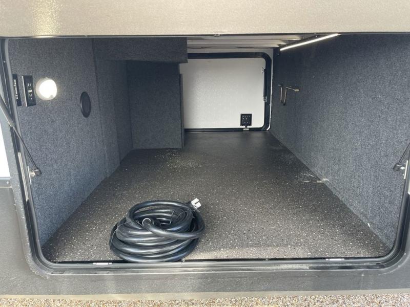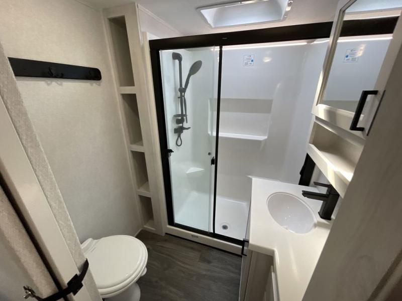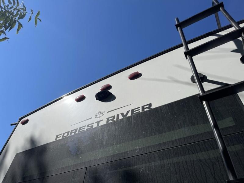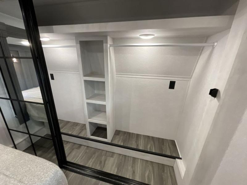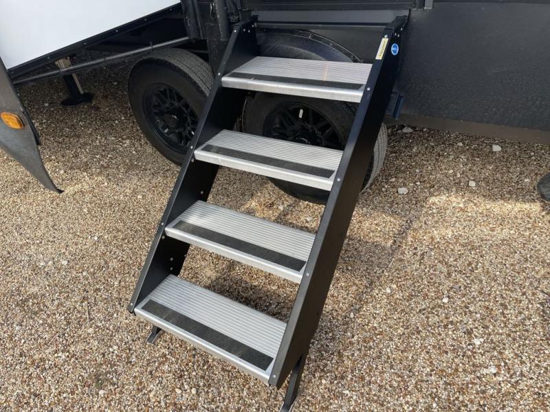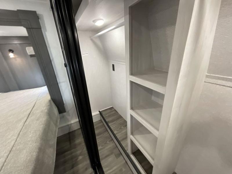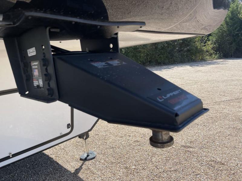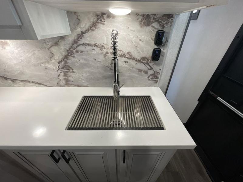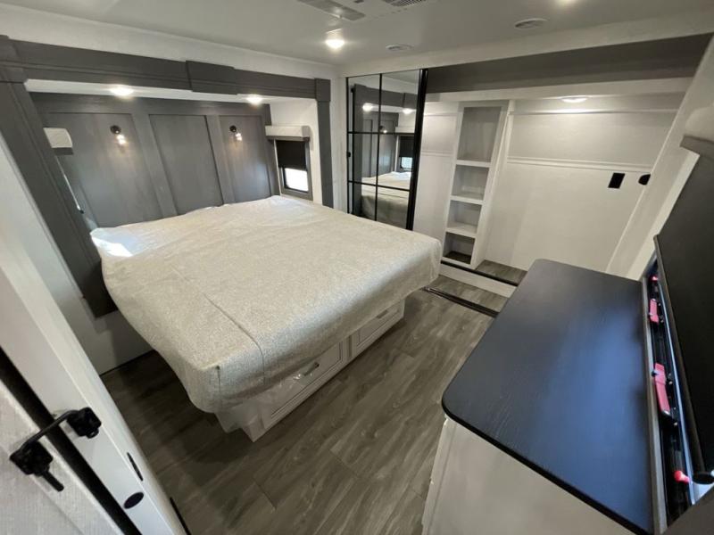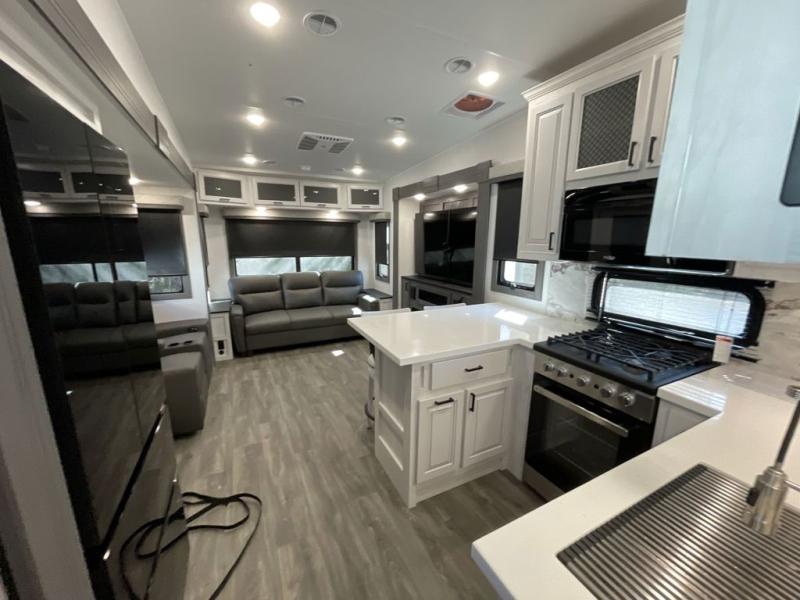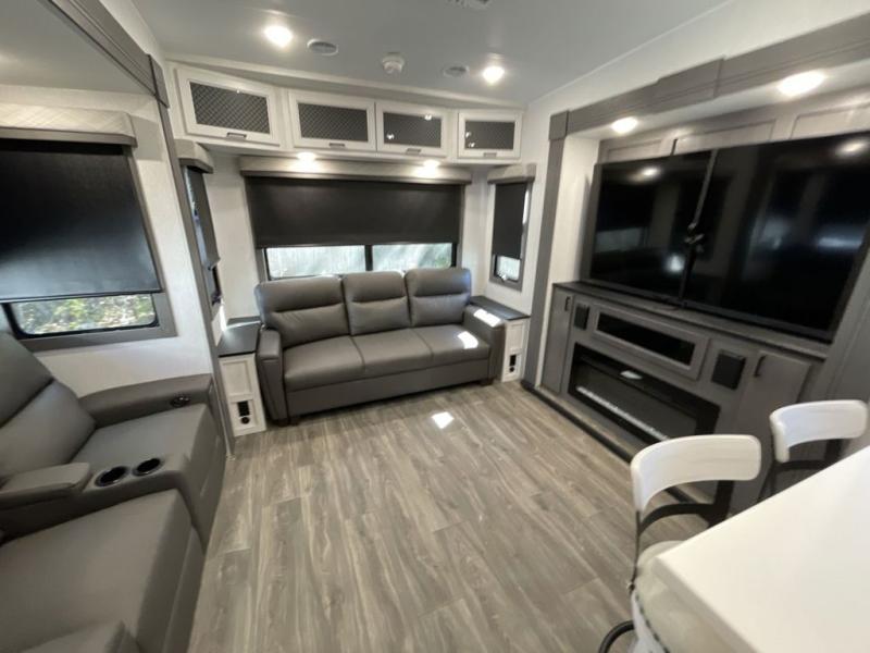 Head to the lake in this spacious fifth wheel for four! You will love the front private bedroom with a king bed slide out, sliding dresser top with hidden storage, and front closet to keep your clothes organized. The full bath is right next to the bedroom for easy access at night, and you're going to love having the utility room in this unit. There is stackable washer and dryer prep, a desk or laundry table, plus a sink with a mirror, making this room multi-functional! A full kitchen includes a u-shaped counter, a four burner range and an over-the-range microwave, plus a 16 cu. ft. refrigerator and walk-in pantry with a coffee bar and shelves. There is also a breakfast bar with seating here where you can visit with the chef while dinner is being made. Last but not least, the rear living area will be a favorite place to hang out with theater seating, a rear 78" EZ out sofa, and a TV with a fireplace!