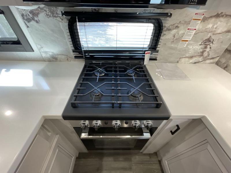 There is just too much luxury to name on the EAST TO WEST Ahara fifth wheel! These units are quite impressive, and once you see them, you'll know what we mean. The Ahara first grabs your attention with its fully painted aerodynamic fiberglass front cap, 102" wide-body chassis, and deep tint square frameless windows. For towing, you'll find a MORryde CRE 3000 suspension, LED marker lights, LED taillights with back-up lights, and rear view camera prep. Traveling in different climates is also made easy with the high-efficiency triple A/C system, 40,000 BTU high-capacity furnace, plus heated, insulated, and enclosed underbelly found within the Climate Package. Head inside to enjoy Slow Rise roller shades, a flush floor kitchen slide to help prevent trips, and solid surface countertops in the kitchen and bath to name a few luxuries!