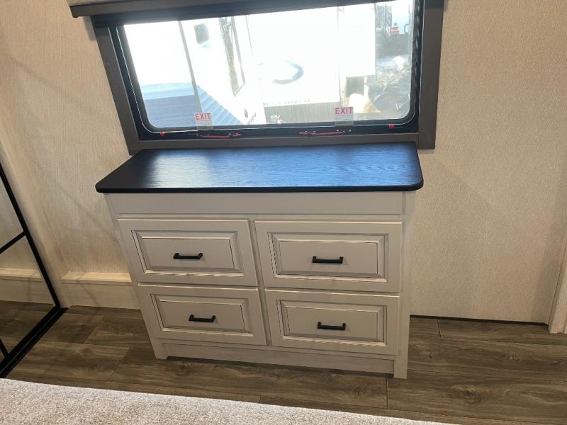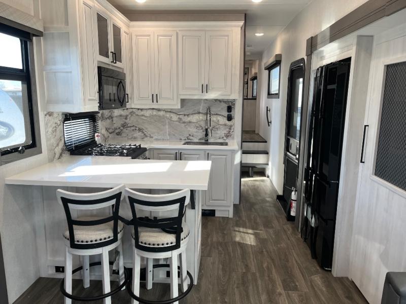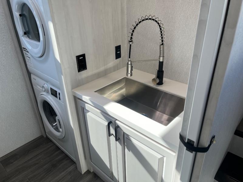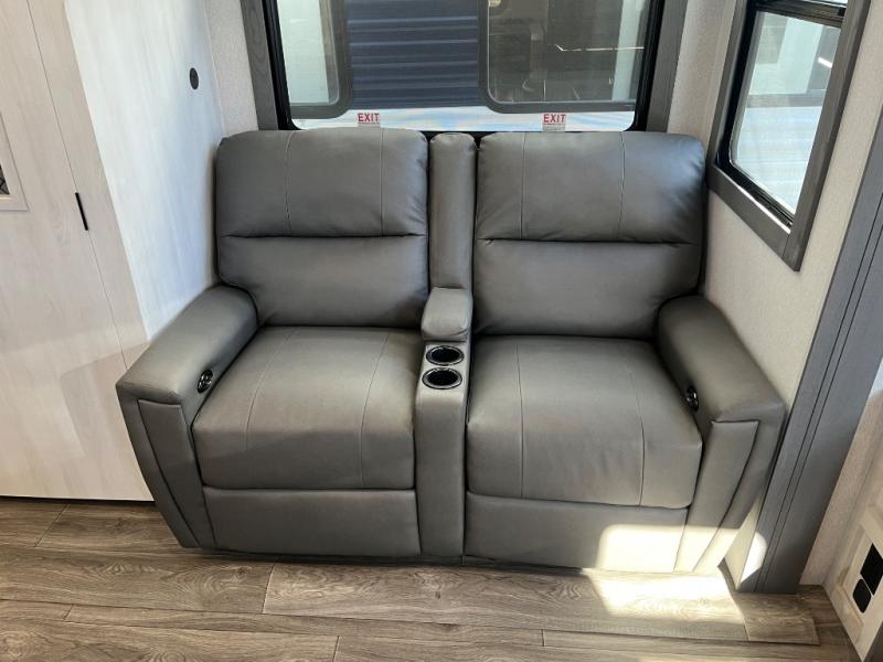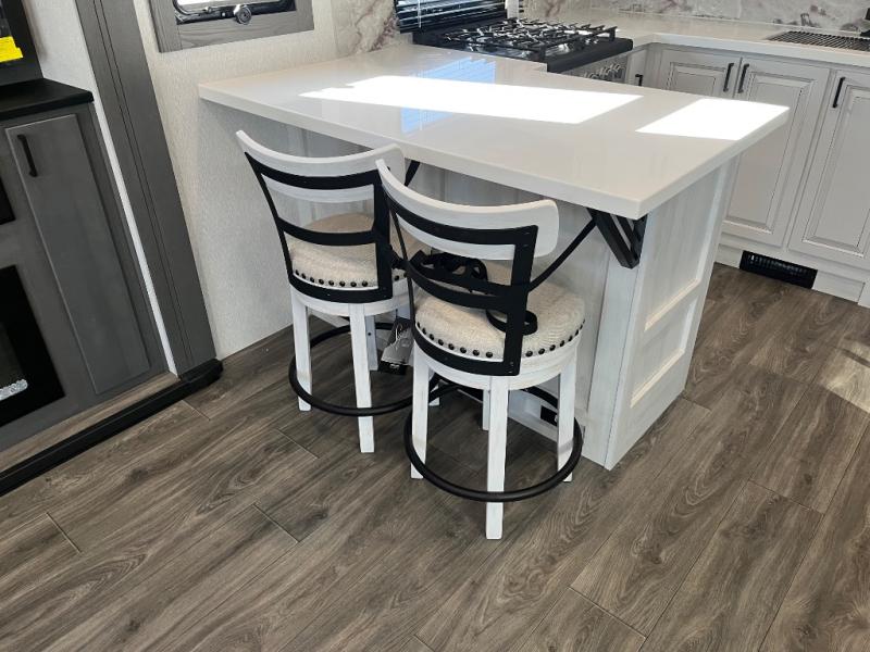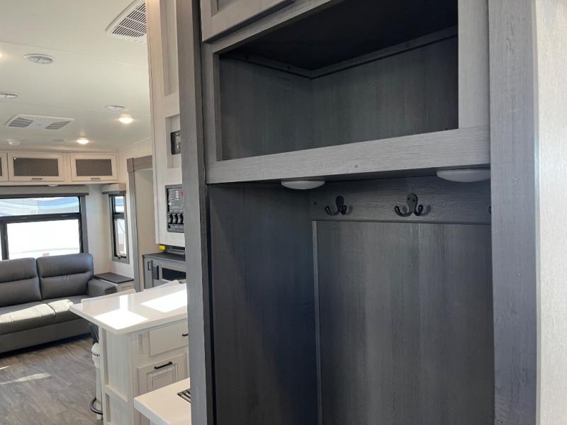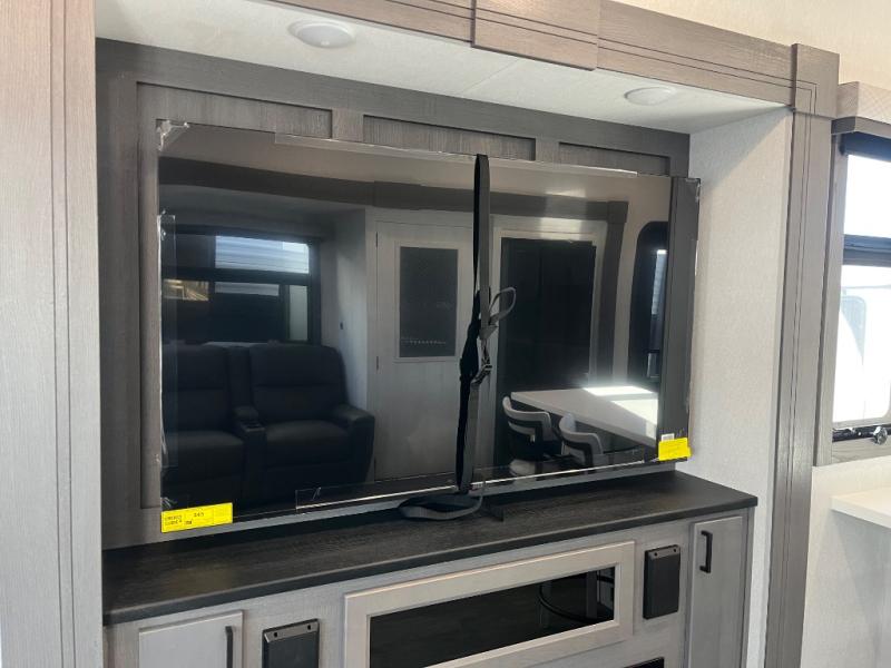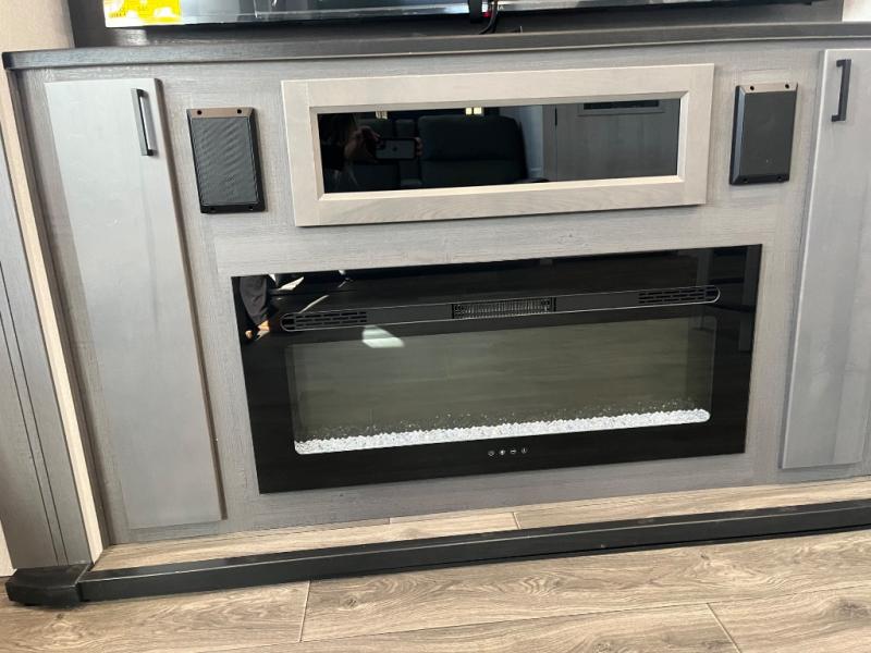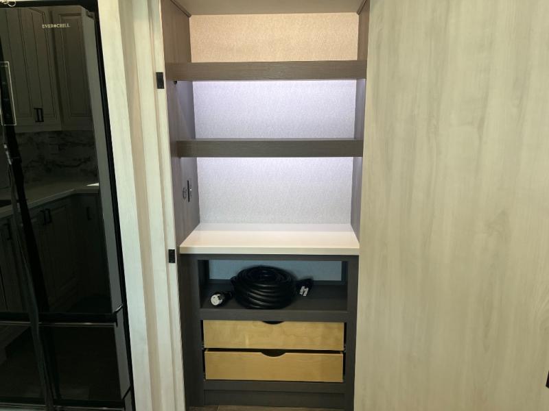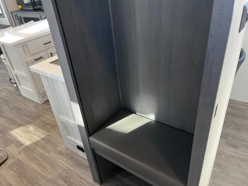 Head to the lake in this spacious fifth wheel for four! You will love the front private bedroom with a king bed slide out, sliding dresser top with hidden storage, and front closet to keep your clothes organized. The full bath is right next to the bedroom for easy access at night, and you're going to love having the utility room in this unit. There is stackable washer and dryer prep, a desk or laundry table, plus a sink with a mirror, making this room multi-functional! A full kitchen includes a u-shaped counter, a four burner range and an over-the-range microwave, plus a 16 cu. ft. refrigerator and walk-in pantry with a coffee bar and shelves. There is also a breakfast bar with seating here where you can visit with the chef while dinner is being made. Last but not least, the rear living area will be a favorite place to hang out with theater seating, a rear 78" EZ out sofa, and a TV with a fireplace!