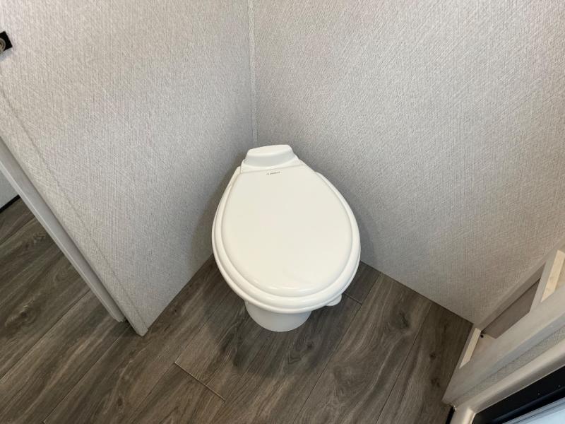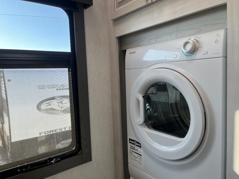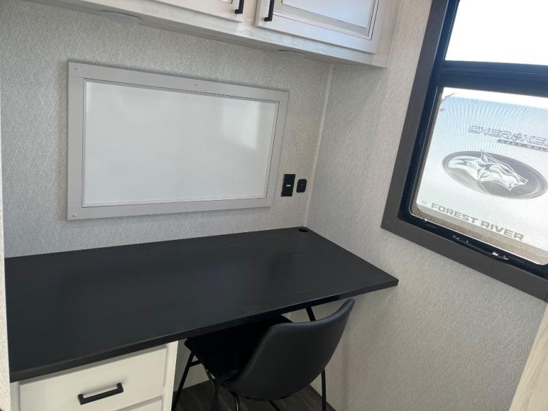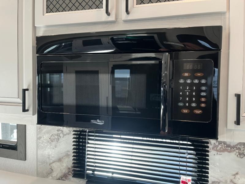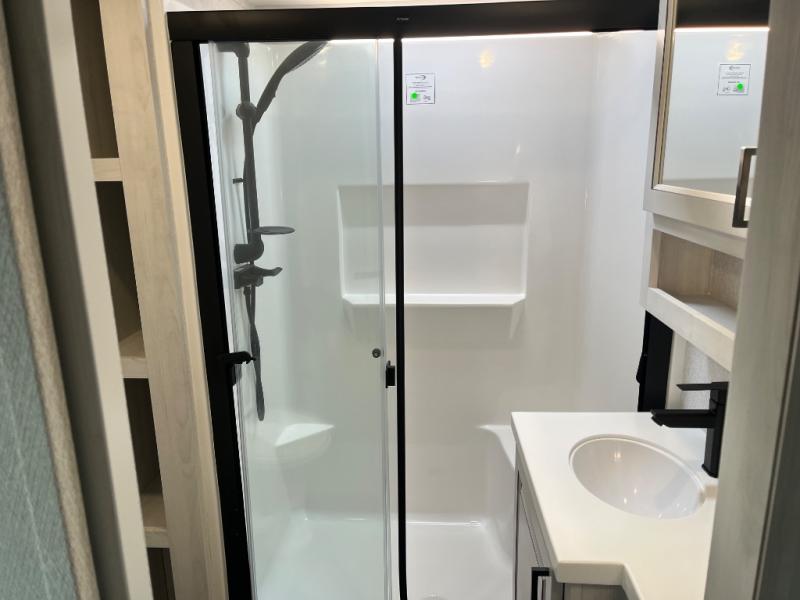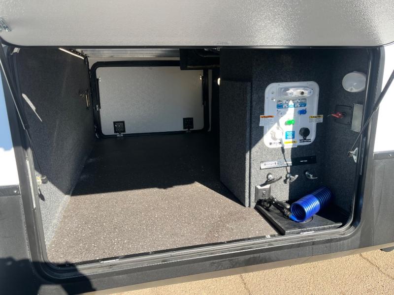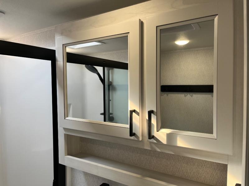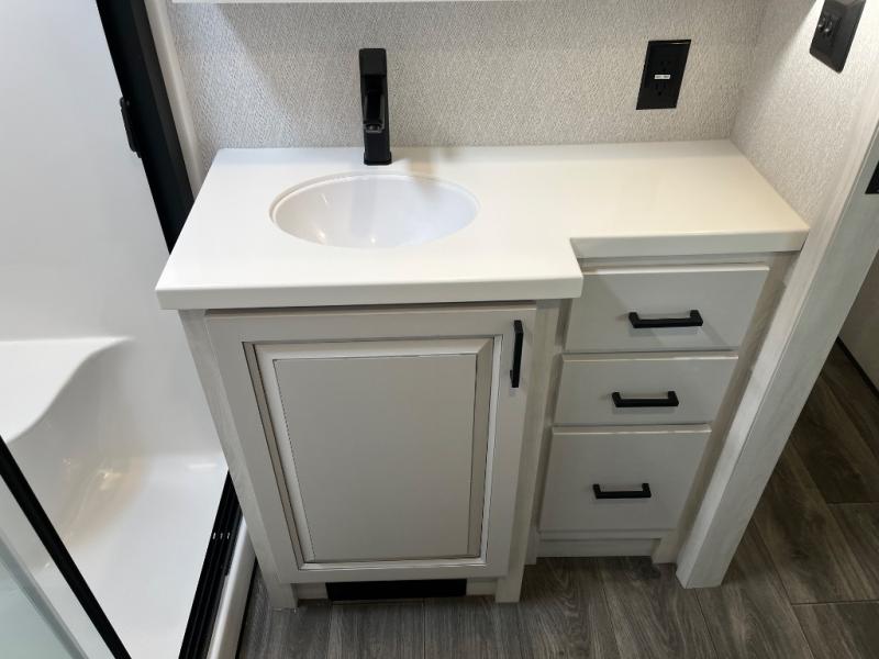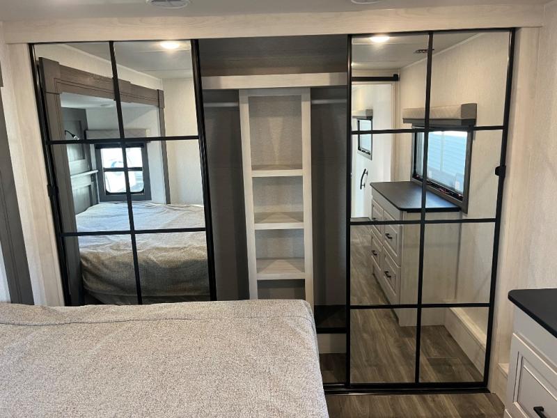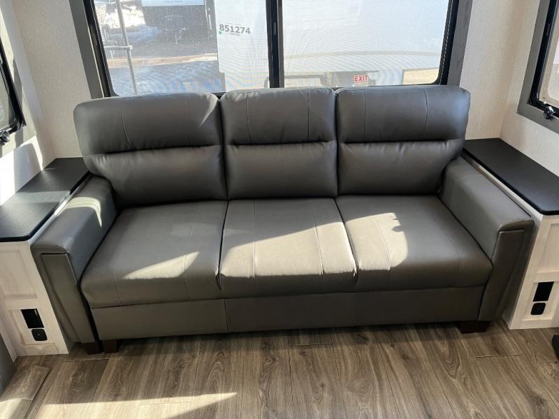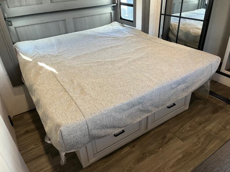 Head to the lake in this spacious fifth wheel for four! You will love the front private bedroom with a king bed slide out, sliding dresser top with hidden storage, and front closet to keep your clothes organized. The full bath is right next to the bedroom for easy access at night, and you're going to love having the utility room in this unit. There is stackable washer and dryer prep, a desk or laundry table, plus a sink with a mirror, making this room multi-functional! A full kitchen includes a u-shaped counter, a four burner range and an over-the-range microwave, plus a 16 cu. ft. refrigerator and walk-in pantry with a coffee bar and shelves. There is also a breakfast bar with seating here where you can visit with the chef while dinner is being made. Last but not least, the rear living area will be a favorite place to hang out with theater seating, a rear 78" EZ out sofa, and a TV with a fireplace!