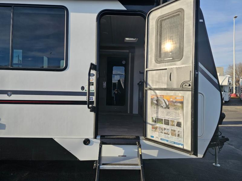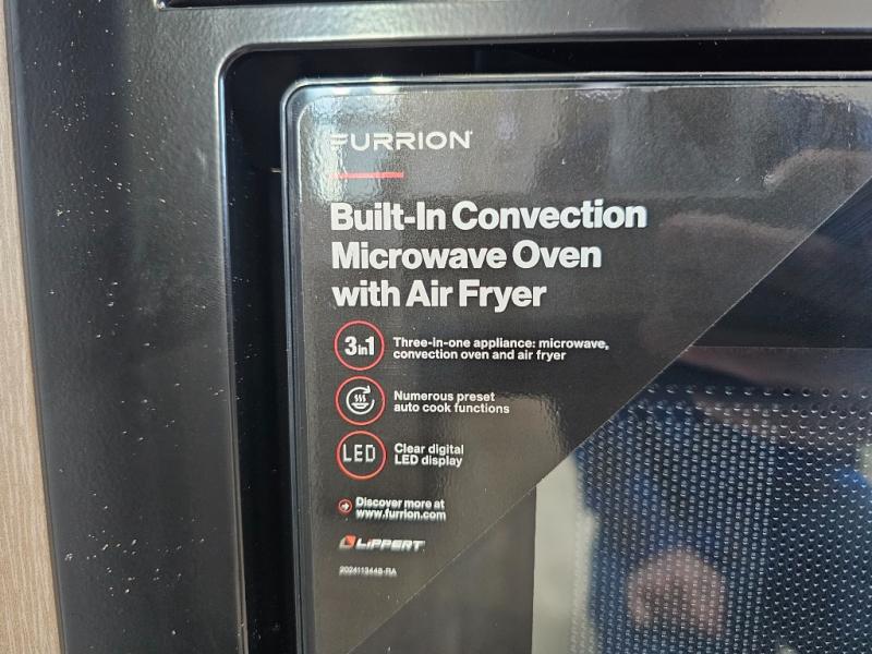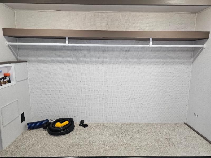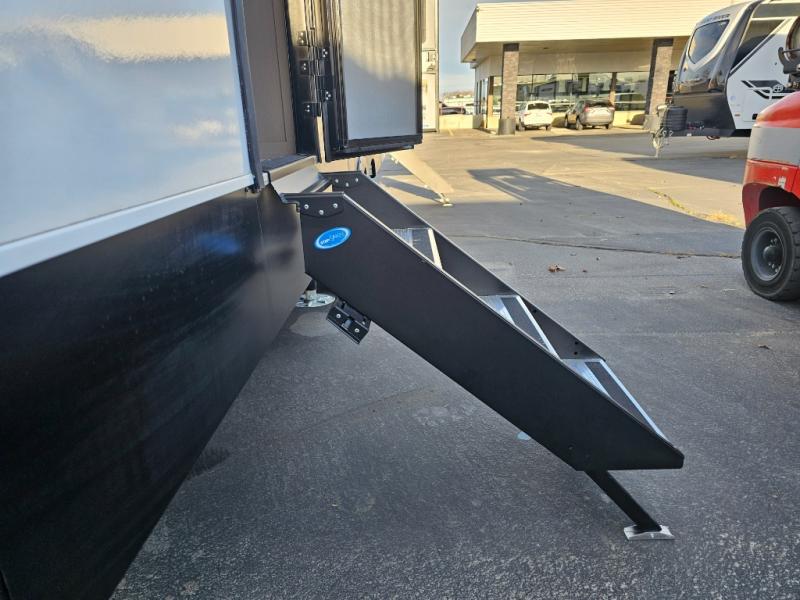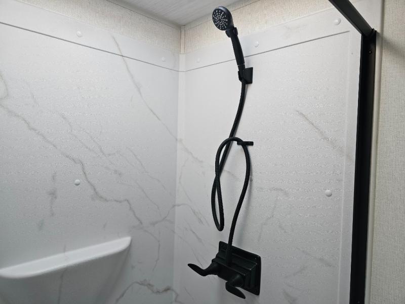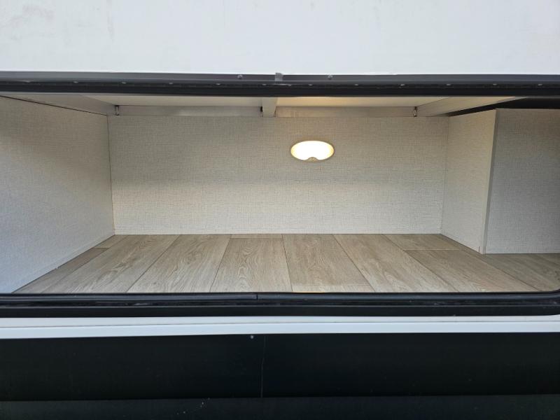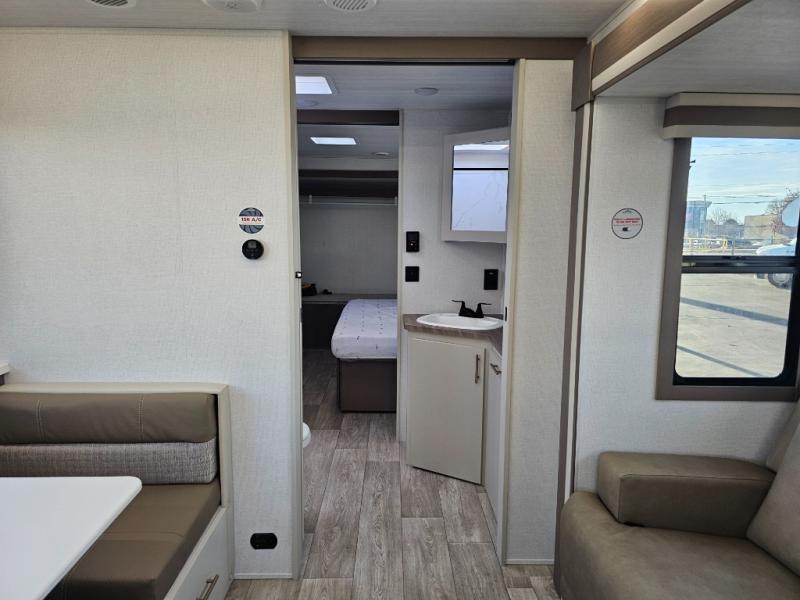 As you step into this travel trailer, you’re greeted by a fully equipped front kitchen featuring a three-burner range, generous counter space, and a sleek 10.7 cu. ft. black-glass refrigerator housed in the slide out giving you everything you need to prepare meals with ease. The slide out also includes a tri-fold sofa that provides a comfortable place to relax and can convert into extra sleeping space when needed. Between the sofa and refrigerator, a convenient pantry keeps all your dry goods organized. Across the way, the booth dinette offers the perfect spot to share meals, play games, or unwind while enjoying the telescoping 50" TV after a full day of adventure. Moving through the center of the trailer, the walk-through bathroom features a 30" x 36" shower with a skylight, a linen closet for towels and toiletries, and a porcelain foot-flush toilet so you can freshen up without relying on campsite facilities. At the rear, the private bedroom provides a spacious retreat with a king bed housed in its own slide out for added comfort, along with a dresser and a large rear wardrobe to keep clothing and gear neatly stored. For added convenience, the bedroom also includes its own second entry door.