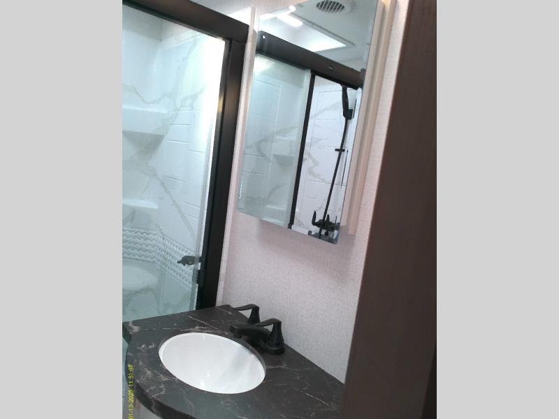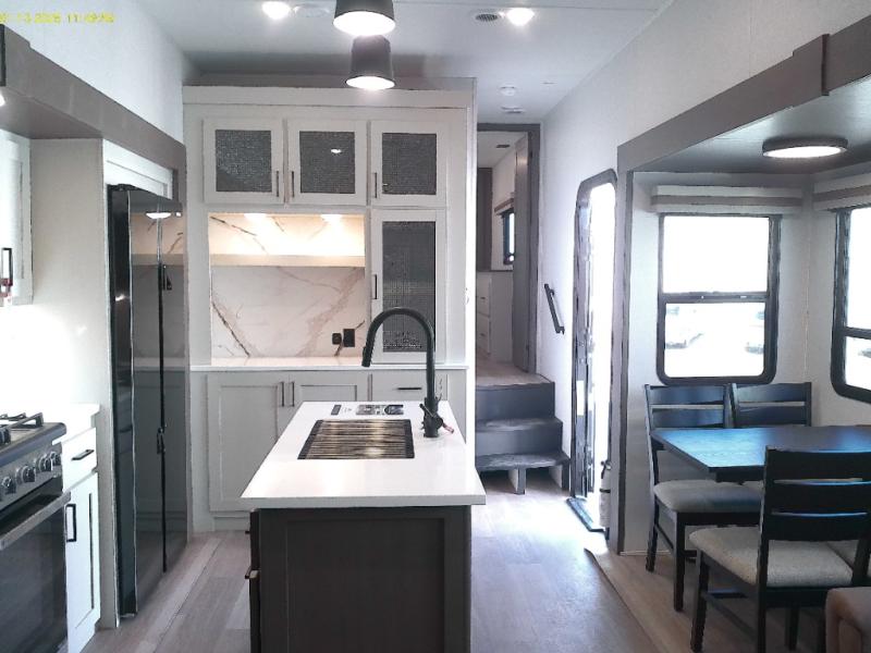 At the front of this Blackthorn model, you’ll find the main bedroom featuring a comfortable king bed with storage underneath for all your camping gear, as well as a wardrobe and dresser to keep your clothes organized. Just next door is one of two full bathrooms, fully equipped with a shower, toilet, sink, and a linen closet for extra toiletries and towels. Moving into the heart of the unit, the spacious main living area opens up with dual opposing slide-outs, one side featuring a free-standing dinette and theater seating, perfect for meals and relaxing. Across, the second slide houses a 50-inch TV with an entertainment center and cozy fireplace, a hidden pantry behind for storing dry goods and snacks, a 4-burner range, and a 16-cu. ft. fridge. A large kitchen island sits at the center, offering additional counter space for meal prep. At the rear, the second bedroom is designed to comfortably accommodate guests with a fold-down bunk, a hide-a-bed sofa, and a loft area above. This space also includes a built-in desk and a second full bathroom, plus a separate entry door for added convenience and privacy.