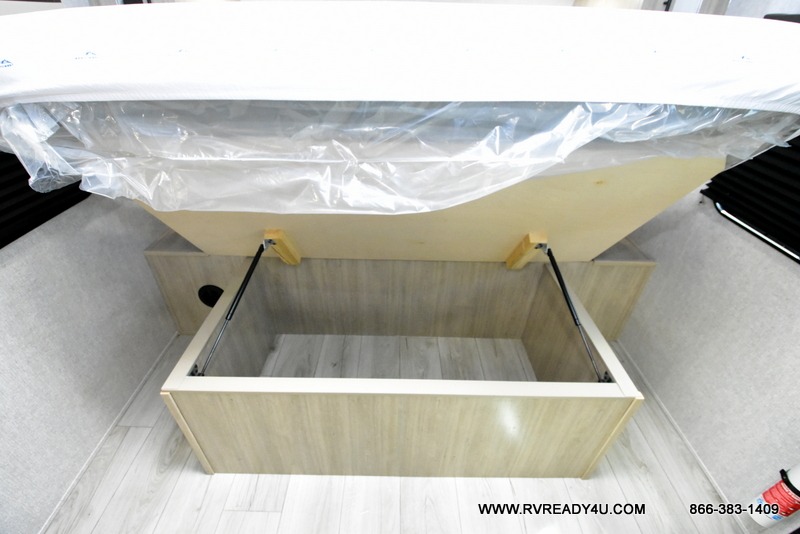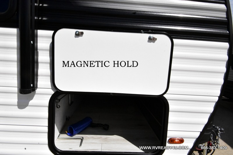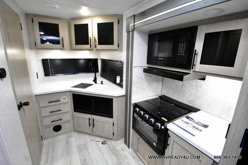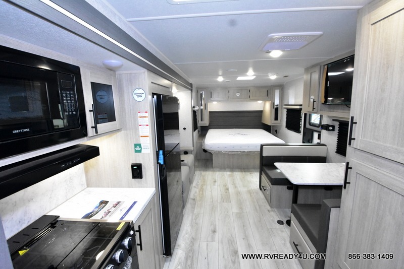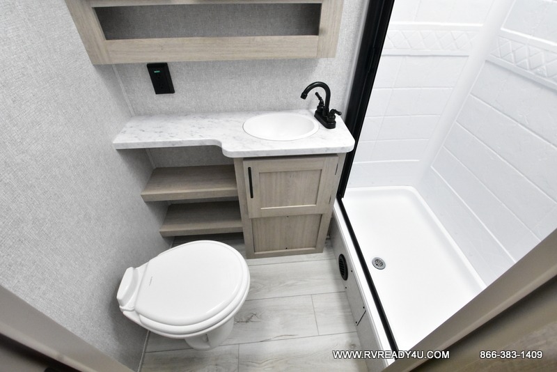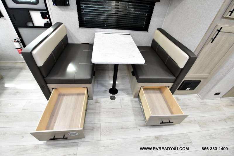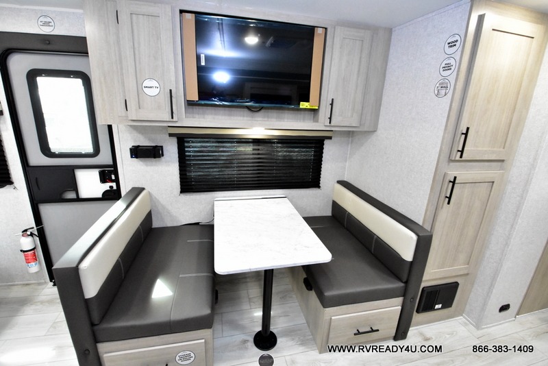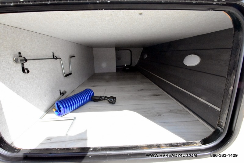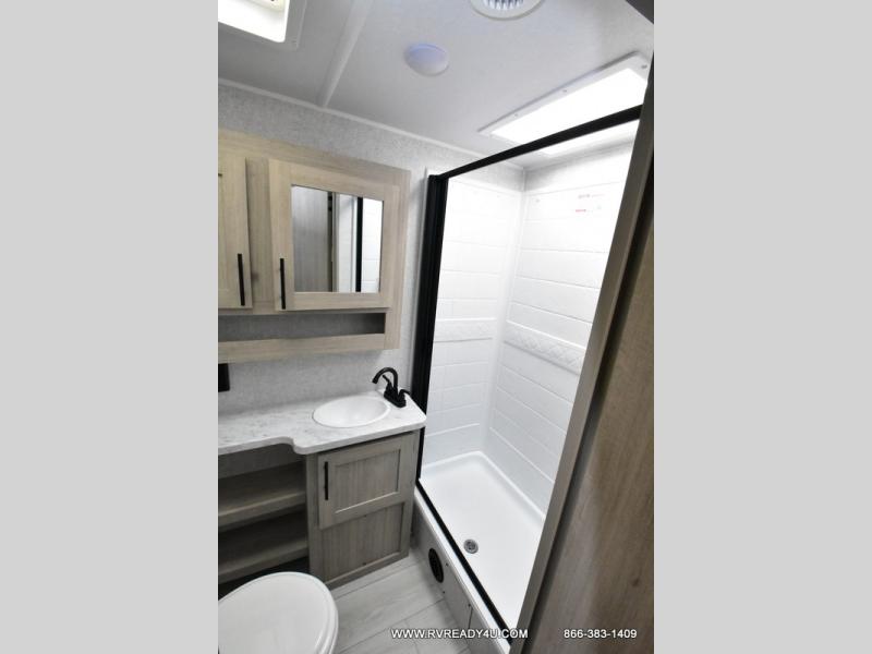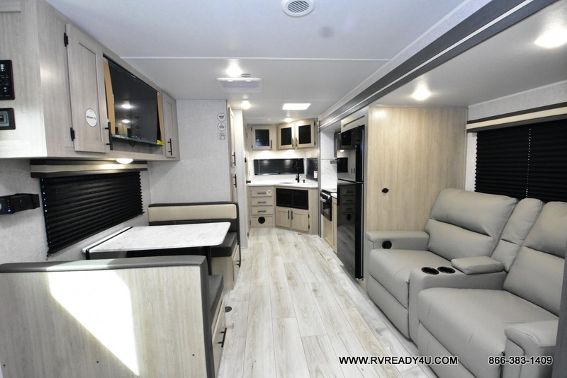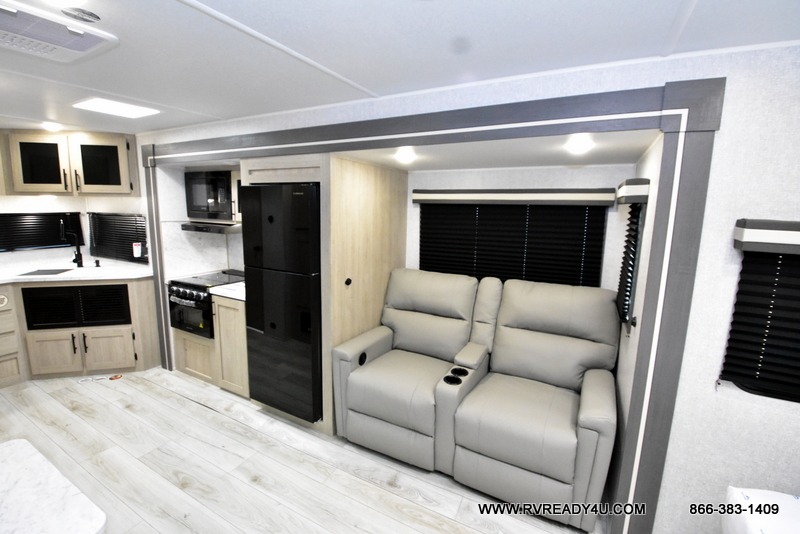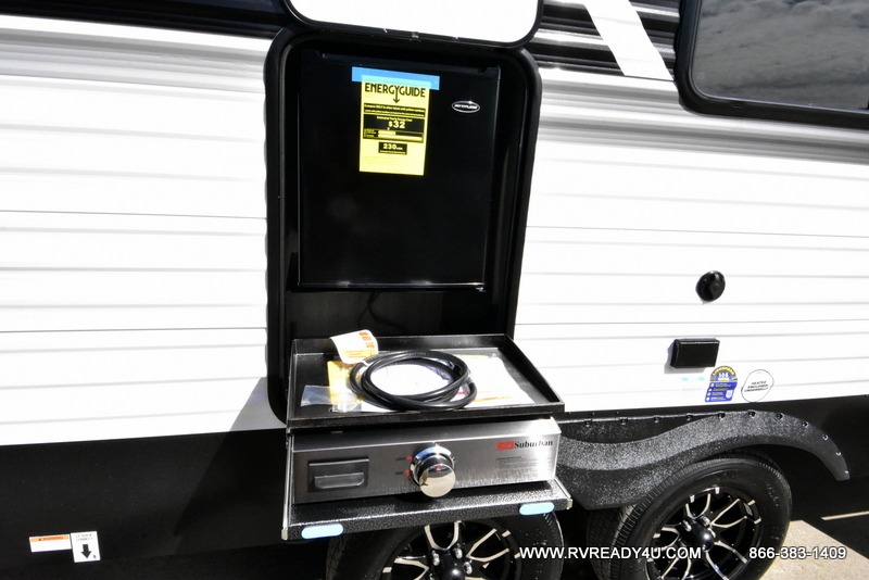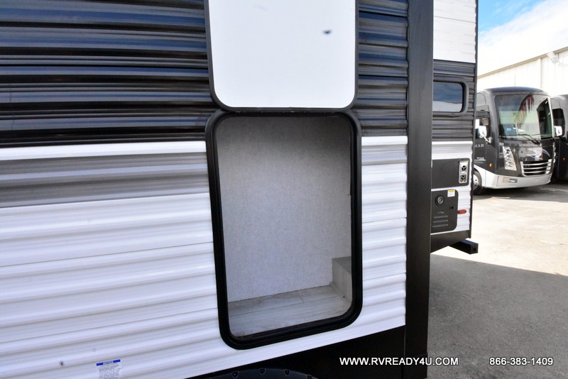 Head to the lake in this travel trailer with a large slide out for more space and comfort! Once you arrive, you can put out the 18' power awning, unload the pass-through storage, and make lunch on the outdoor kitchen with a pull-out griddle and refrigerator. The booth dinette inside can be used as dining space, and there is storage underneath here for added convenience. A jiffy sofa within the slide can be switched out for an optional theater seat if you don't need the extra sleeping space. You will also find a full interior kitchen in the rear corner, and the full bath in the other rear corner is sure to come in handy. When you're ready for some shut-eye, the king bed in the front bedroom will feel just like home. There are also dual wardrobes and nightstands to keep your things tidy!