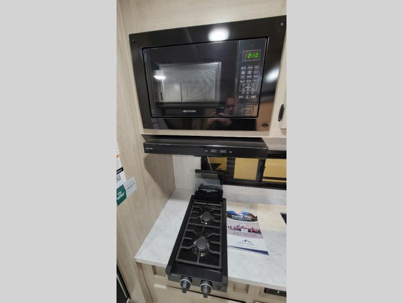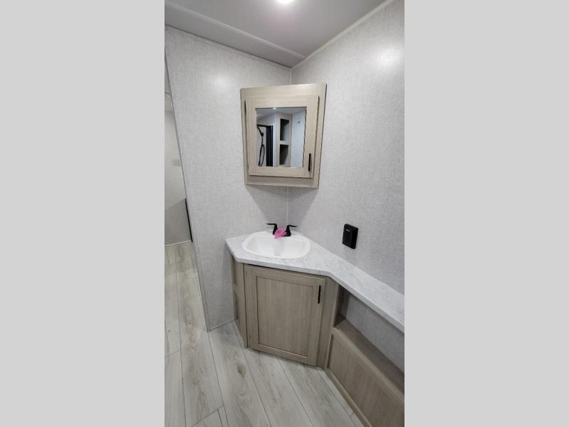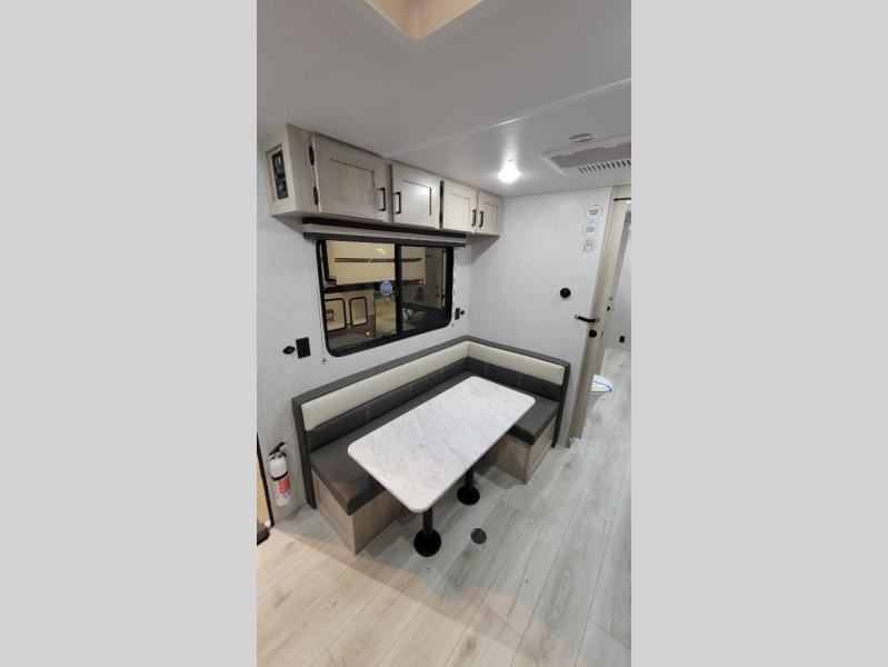 There is much to love in this travel trailer! Starting with the rear private bunkhouse which has a set of double bunk beds with storage underneath and a bunk over a booth dinette with storage underneath it too. The front king bed also has storage underneath it, as well as wardrobes and nightstands on either side of it for your clothes and books. The chef can prepare their best home cooked meals in the fully equipped kitchen, and everyone can enjoy them at the L-shaped dinette with storage underneath for boardgames to play after dinner. The walk-through bathroom makes it easy for all to access the 30" x 36" shower, and you even have an outside shower to rinse the mud off of your feet before entering inside!