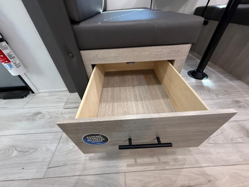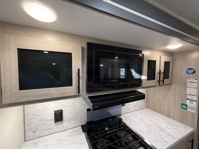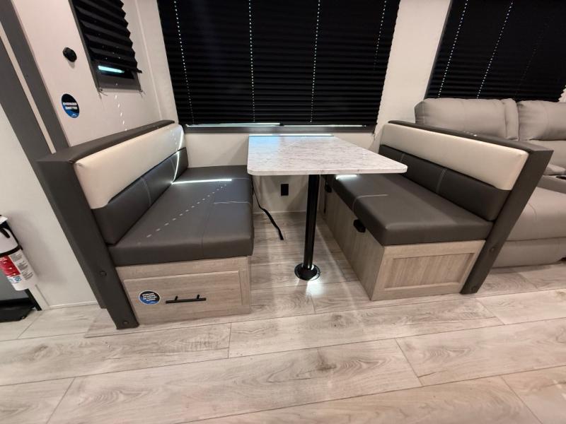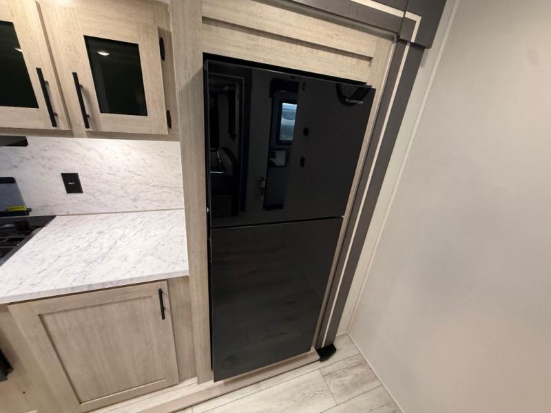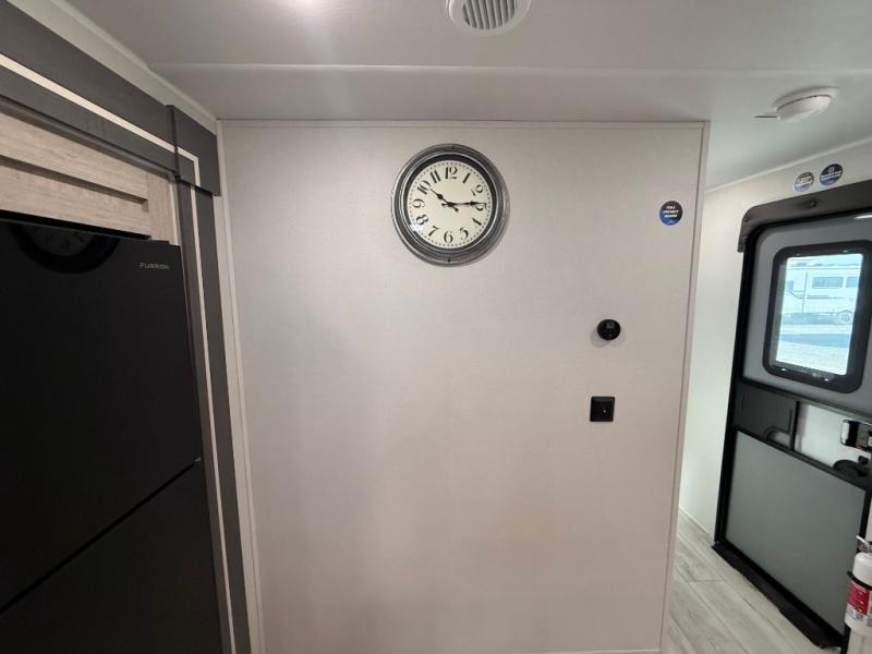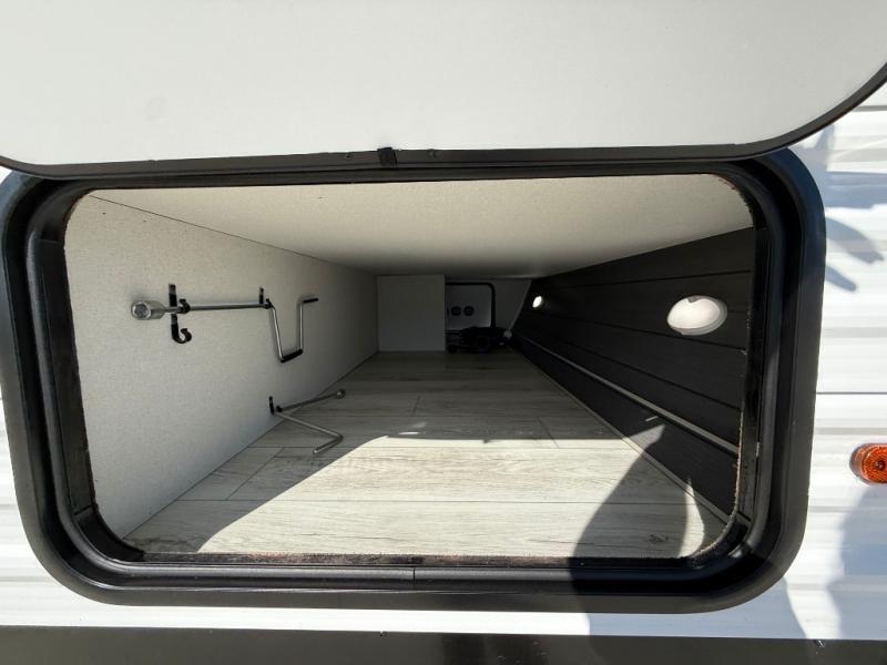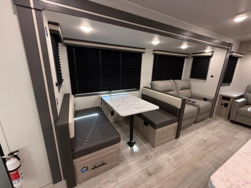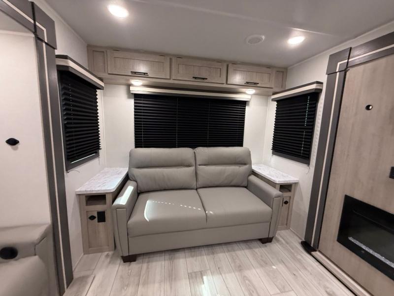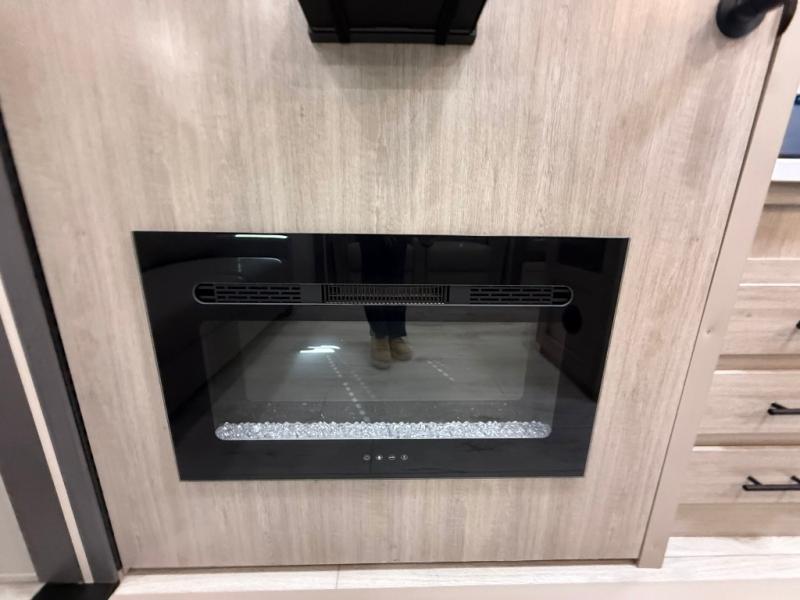 Camping in this double slide out travel trailer will be easier than ever! Once you arrive at your destination, set up the power awning, unload the pass-through storage, and head inside to make lunch in the full kitchen. There is a kitchen island for more prep space, along with a 10.7 cu. ft. 12V refrigerator, three burner range, and microwave oven. You'll find comfortable seating space on the booth dinette, jiffy sofa, and dual lounge chairs, and the fireplace is sure to make your space feel more like home. There is also hidden storage behind the fireplace for pantry items, board games, and more! Up front, a full bath and front private bedroom will let you freshen up before a great night's rest on the king bed!