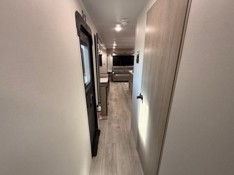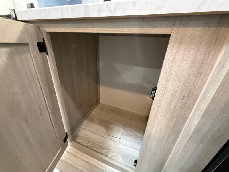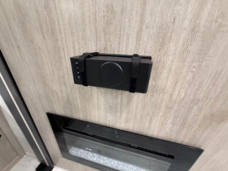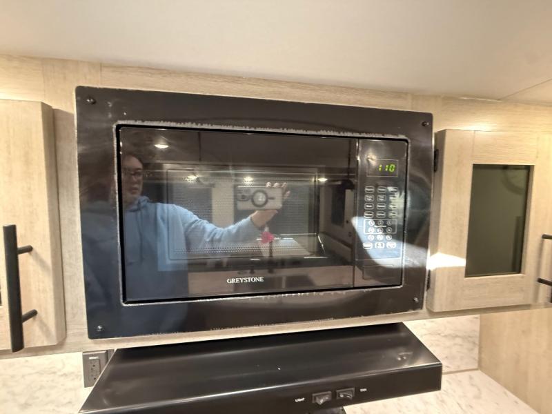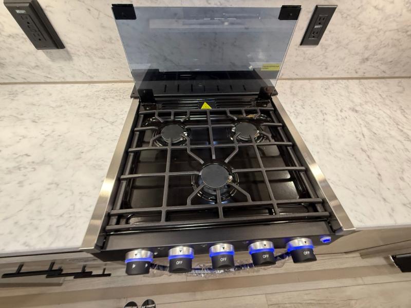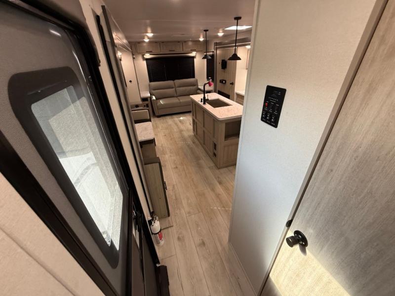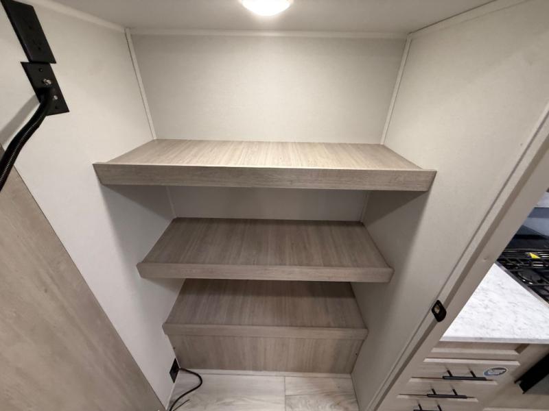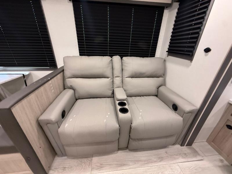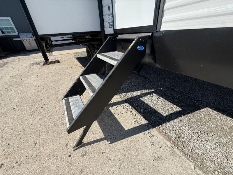 Camping in this double slide out travel trailer will be easier than ever! Once you arrive at your destination, set up the power awning, unload the pass-through storage, and head inside to make lunch in the full kitchen. There is a kitchen island for more prep space, along with a 10.7 cu. ft. 12V refrigerator, three burner range, and microwave oven. You'll find comfortable seating space on the booth dinette, jiffy sofa, and dual lounge chairs, and the fireplace is sure to make your space feel more like home. There is also hidden storage behind the fireplace for pantry items, board games, and more! Up front, a full bath and front private bedroom will let you freshen up before a great night's rest on the king bed!