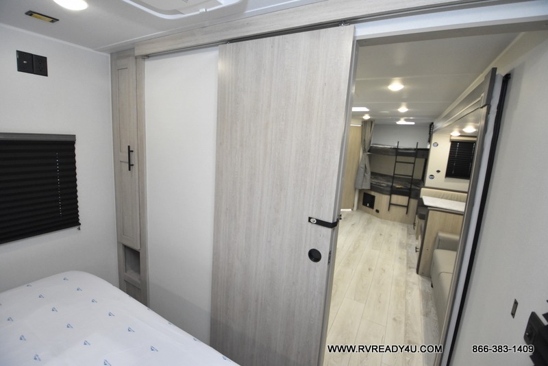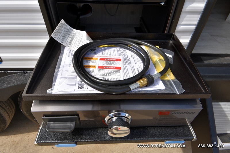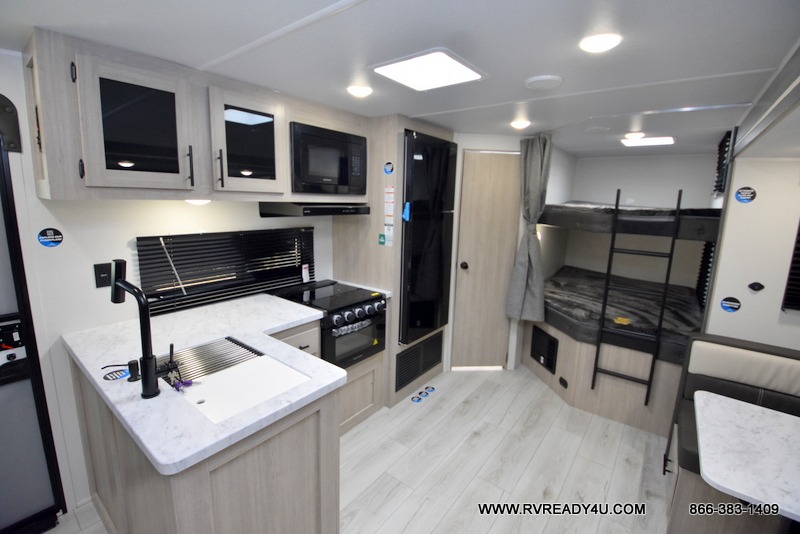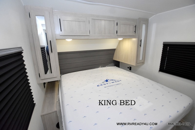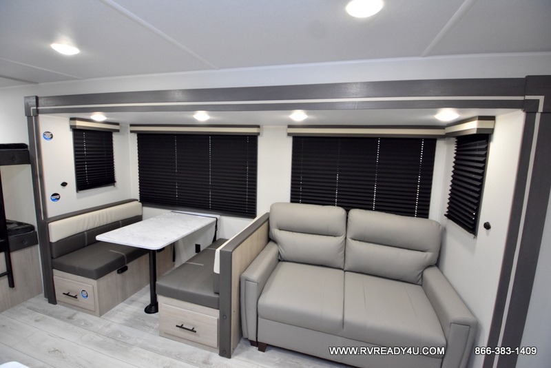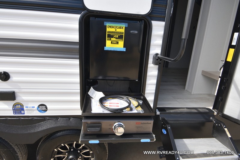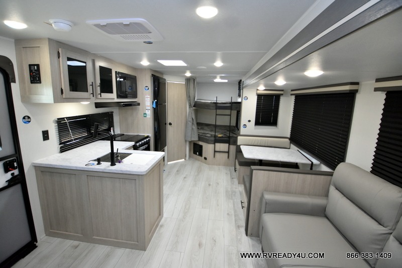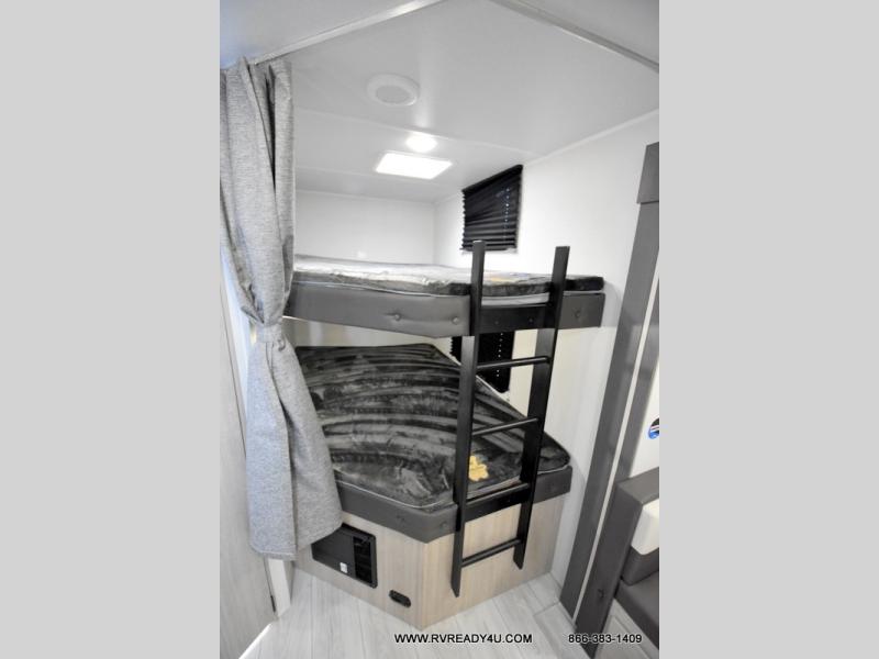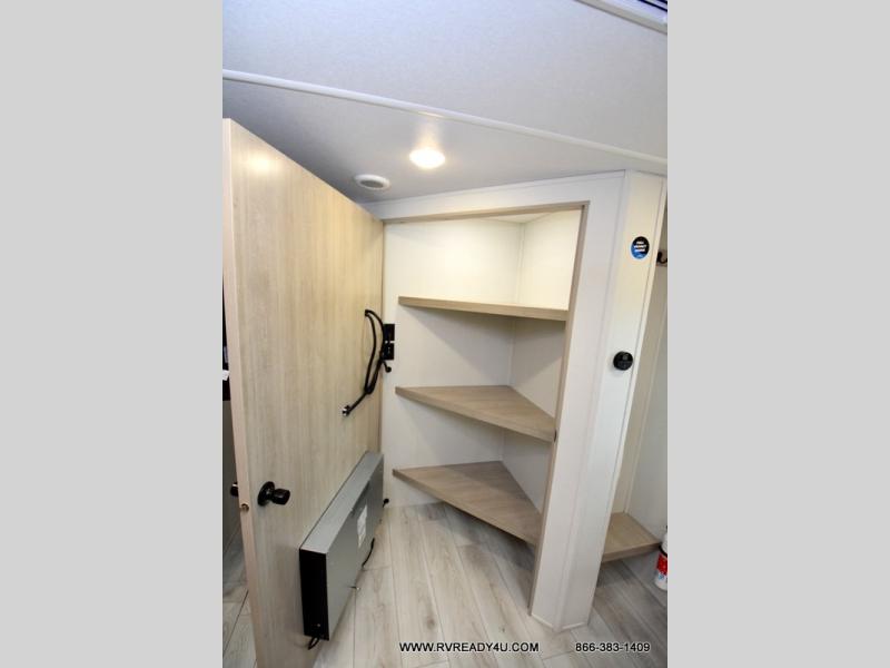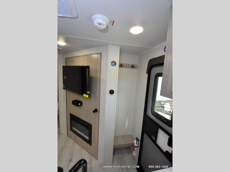 Pack your bags and hitch up this travel trailer for a fun family adventure! You will get a good night's rest on the front king bed in the front private bedroom, and the kids can sleep on the double bunk beds with storage. You could even transform the booth dinette with storage underneath it and the jiffy sofa which can be switched out for the optional theater seat or optional tri-fold sofa. The entertainment center has a fireplace for a cozy evening indoors and a hidden pantry behind it for all of your movie night snacks. With dual entry doors, it will be easy to enter and exit this unit especially from the rear corner bathroom which has one of the entry/exit doors to the unit. Enjoy cooking breakfast outside at the outdoor kitchen complete with a pull-out griddle and fridge!