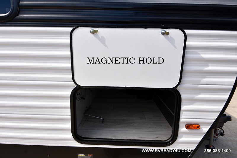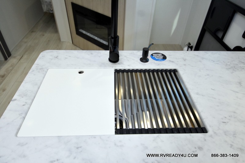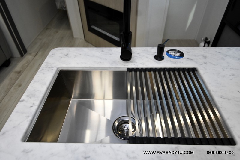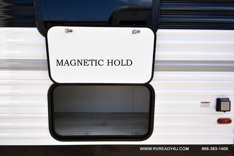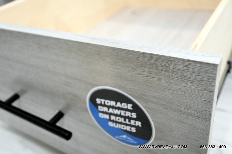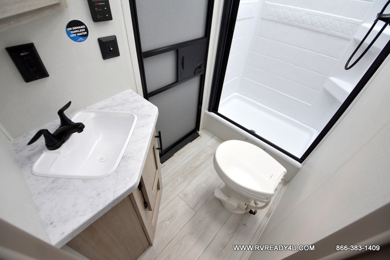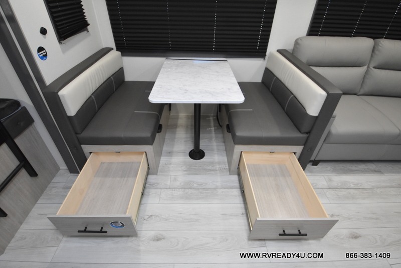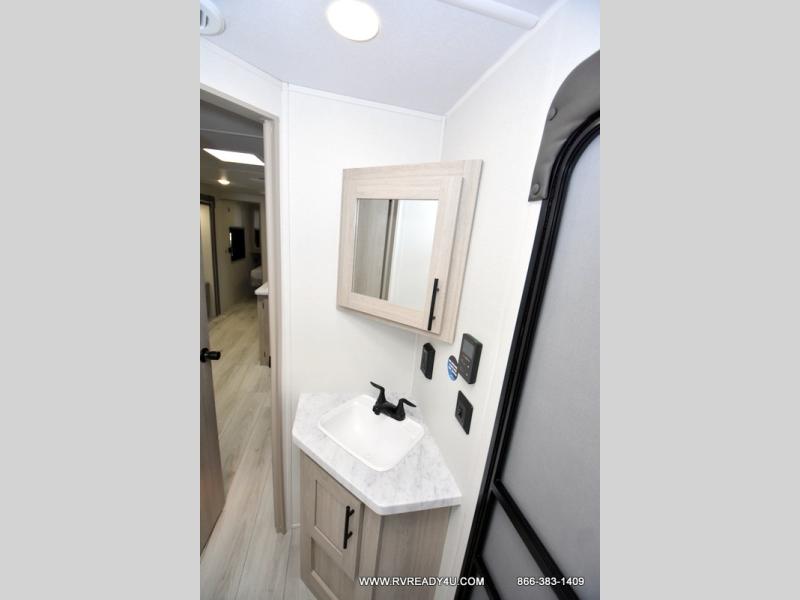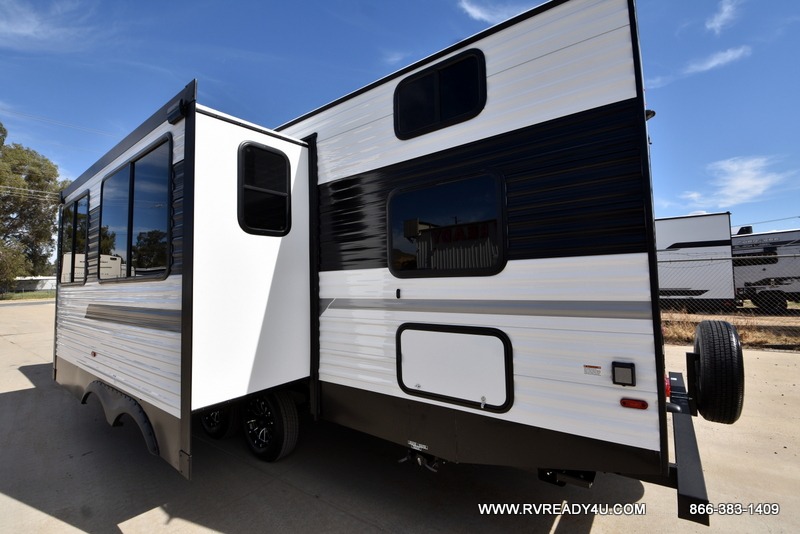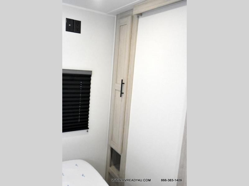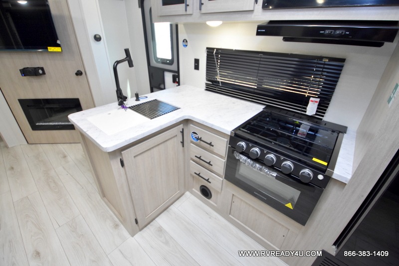 Pack your bags and hitch up this travel trailer for a fun family adventure! You will get a good night's rest on the front king bed in the front private bedroom, and the kids can sleep on the double bunk beds with storage. You could even transform the booth dinette with storage underneath it and the jiffy sofa which can be switched out for the optional theater seat or optional tri-fold sofa. The entertainment center has a fireplace for a cozy evening indoors and a hidden pantry behind it for all of your movie night snacks. With dual entry doors, it will be easy to enter and exit this unit especially from the rear corner bathroom which has one of the entry/exit doors to the unit. Enjoy cooking breakfast outside at the outdoor kitchen complete with a pull-out griddle and fridge!