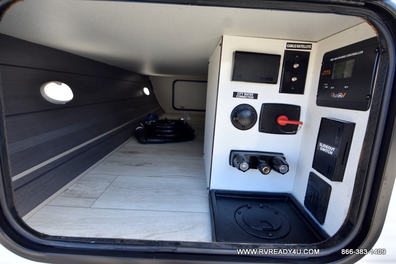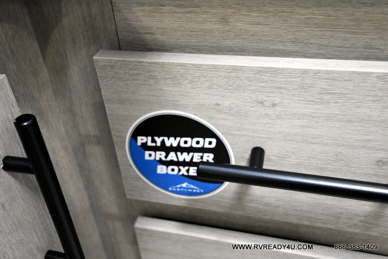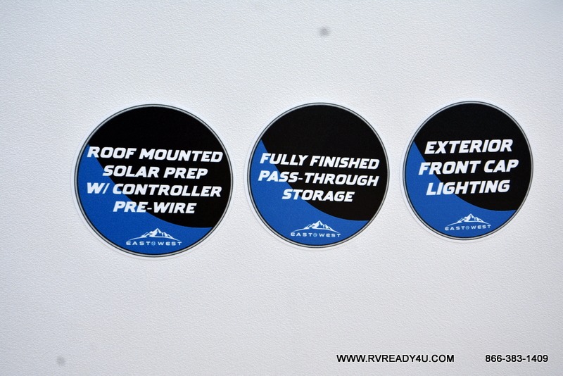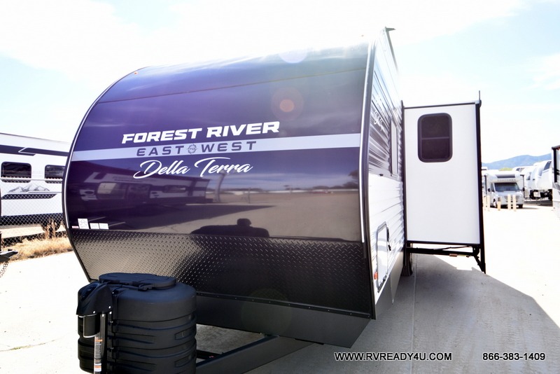 Each Della Terra travel trailer by EAST TO WEST is constructed with an enclosed and heated underbelly and enclosed holding tanks for added protection against the elements. There is also a power tongue jack with an LED light for easy set up and a power awning with LED lights you can rest under after you've unpacked. The Explore Comfort Package comes seamless pressed countertops, kitchen backsplash, window valance package with black night shades, and many more comforts. You will also appreciate the Adventure Outdoor Package with backup camera prep and solar prep, a tankless water heater, an RV grill quick disconnect, and a universal docking station with battery disconnect.