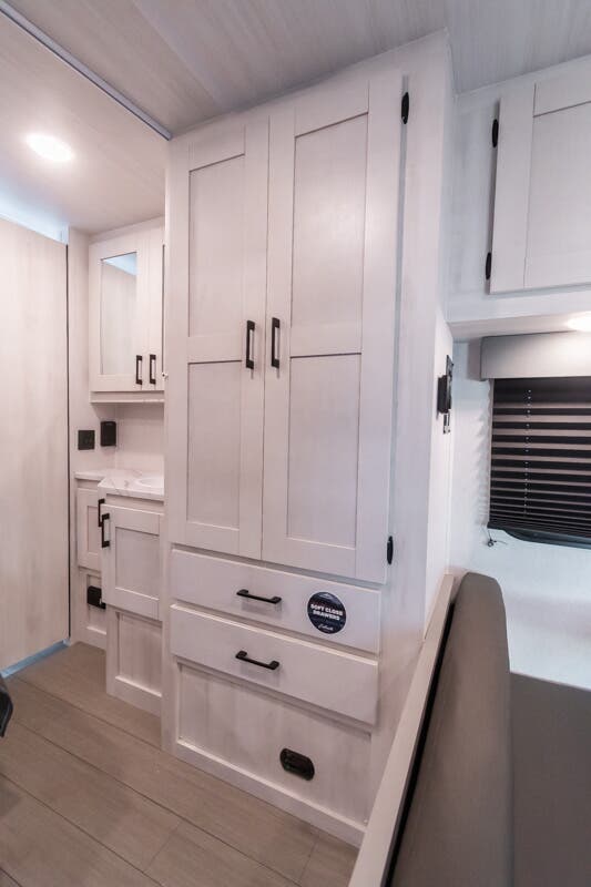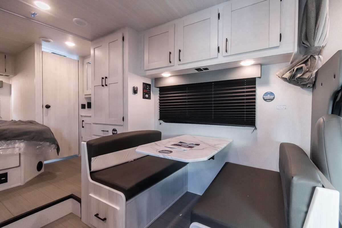 You're going to love traveling and camping in this coach that can sleep five to six each night. The convection microwave and 10.7 cu. ft. 12V refrigerator will let you cook and store food, and the booth dinette provides a place to dine together. A private bath includes a shower and toilet, with the sink just outside this room so two people can freshen up at once. You will sleep soundly each night on the rear corner queen bed with overhead storage for your belongings, while the little ones take the 60" x 80" bunk over cab!