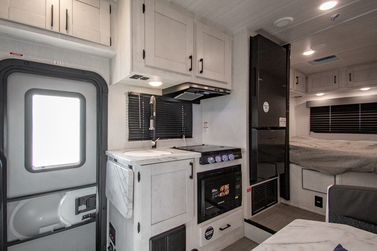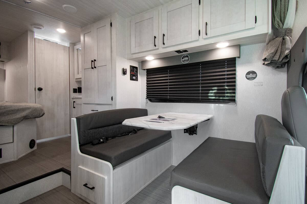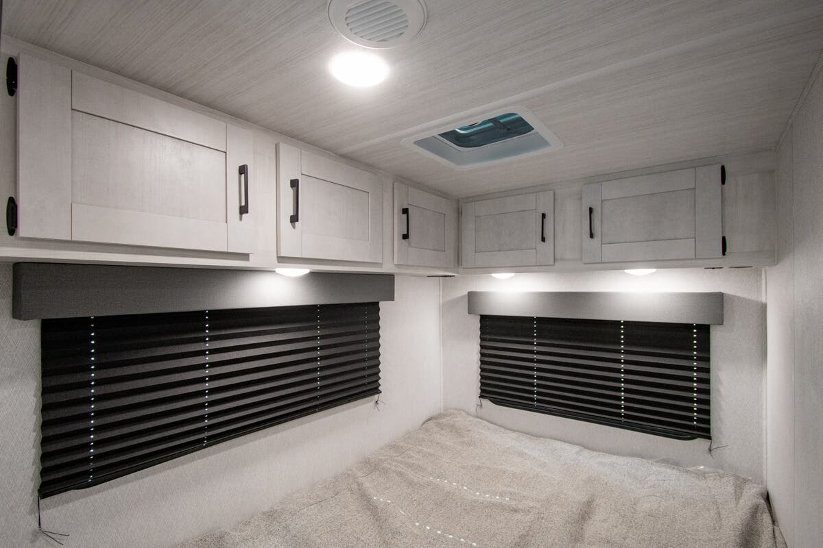 You're going to love traveling and camping in this coach that can sleep five to six each night. The convection microwave and 10.7 cu. ft. 12V refrigerator will let you cook and store food, and the booth dinette provides a place to dine together. A private bath includes a shower and toilet, with the sink just outside this room so two people can freshen up at once. You will sleep soundly each night on the rear corner queen bed with overhead storage for your belongings, while the little ones take the 60" x 80" bunk over cab!