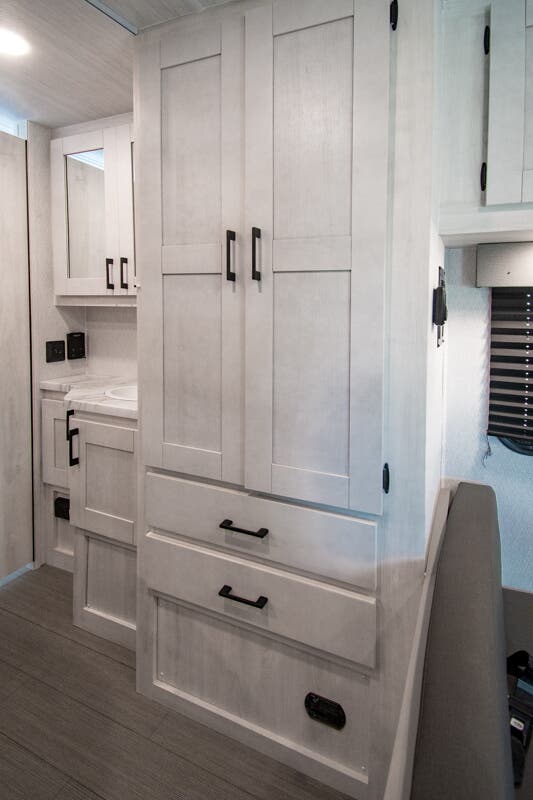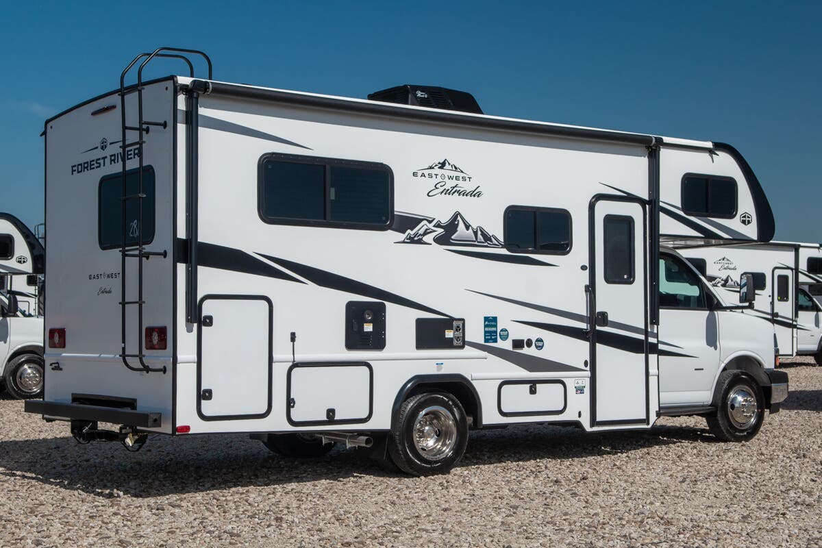 With any Entrada Class C gas motorhome from EAST TO WEST, the construction consists of a one-piece painted fiberglass front cap, a TPO roof membrane, and 2" Azdel composite sidewalls for added durability. There are rotocast exterior storage compartments with slam latch doors, along with an exterior LP Quick Connect, and a power awning with an LED light strip. You will also find rear and sideview cameras to help make maneuvering and parking your RV easier than ever. Inside, you'll feel right at home with soft close hardwood cabinet doors and drawers, a high-altitude tankless water heater, plus a 12V smart TV and USB ports to keep your electronics charged up!