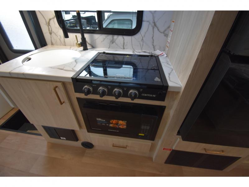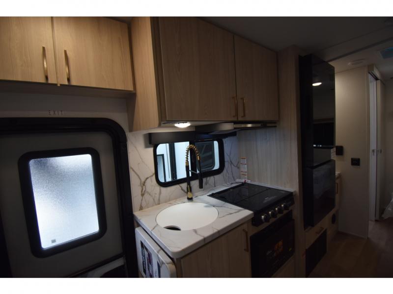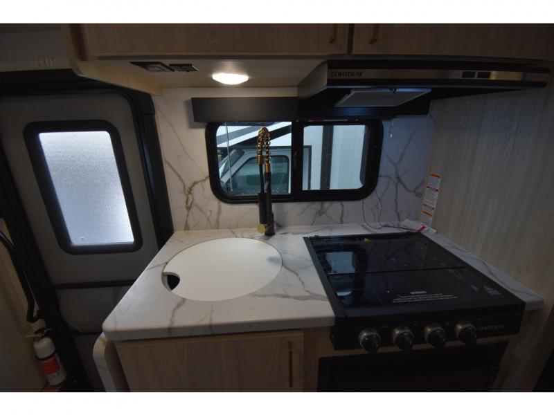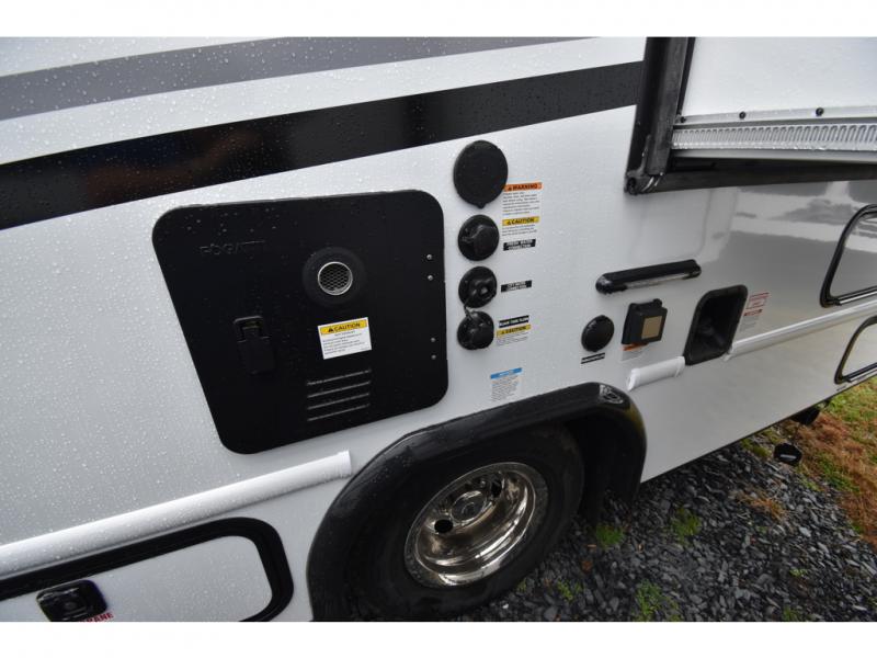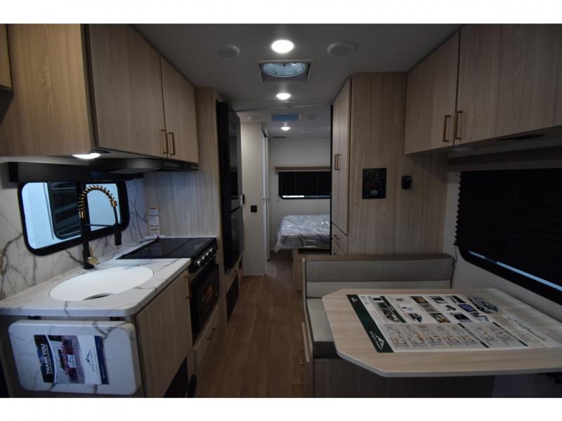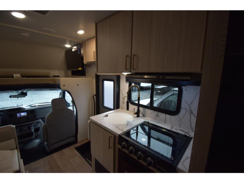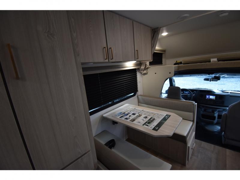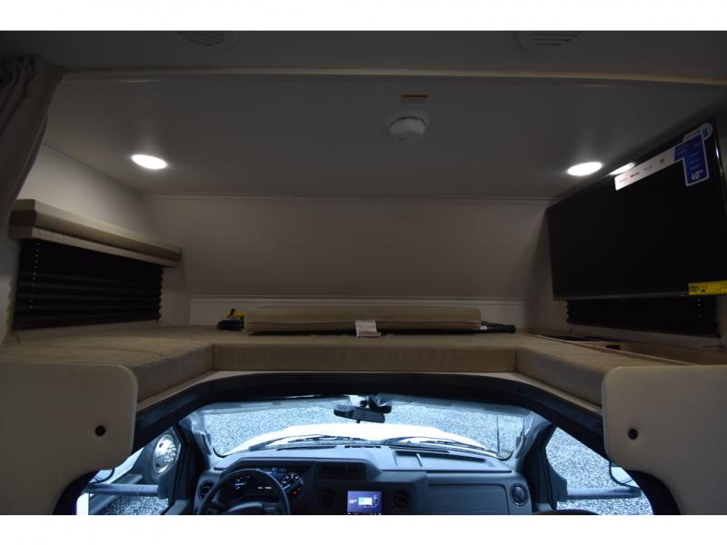 With any Entrada Class C gas motorhome from EAST TO WEST, the construction consists of a one-piece painted fiberglass front cap, a TPO roof membrane, and 2" Azdel composite sidewalls for added durability. There are rotocast exterior storage compartments with slam latch doors, along with an exterior LP Quick Connect, and a power awning with an LED light strip. You will also find rear and sideview cameras to help make maneuvering and parking your RV easier than ever. Inside, you'll feel right at home with soft close hardwood cabinet doors and drawers, a high-altitude tankless water heater, plus a 12V smart TV and USB ports to keep your electronics charged up!