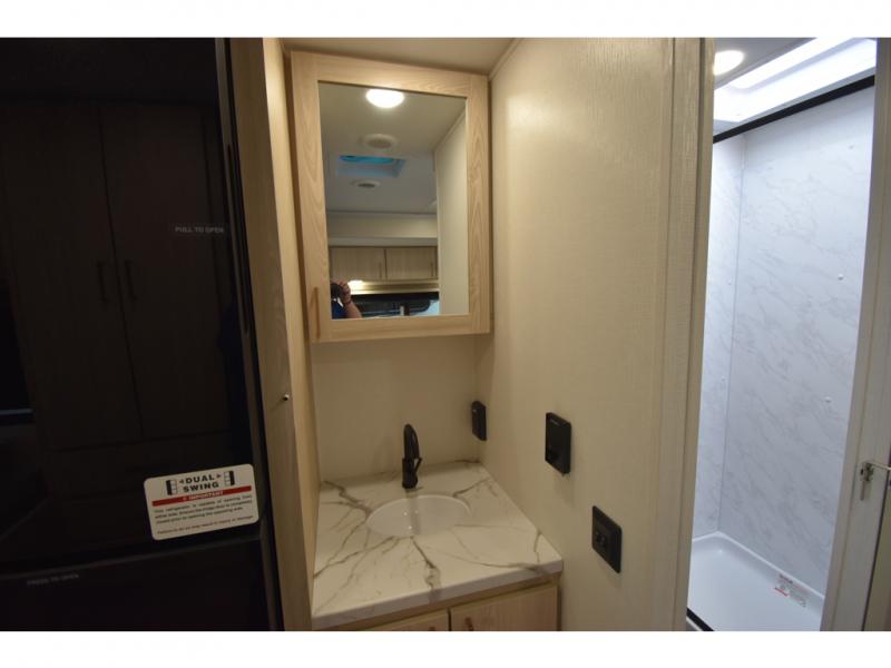 The journey will be oh-so enjoyable when you use this Entrada Class C gas motorhome to explore! You will be able to create meals each day that you are on the road because the kitchen has everything you will need, like a convection microwave, a round sink, a cooktop, a flip-up countertop, and a 10.7-cubic foot refrigerator. There is even a pantry/wardrobe for you to use to store spices, chips, or canned goods. Across from the queen bed slide, you'll find a private bath so you can get cleaned up in the morning, and the vanity with a medicine cabinet is located just outside the bathroom so that someone can brush their teeth while another is showering.