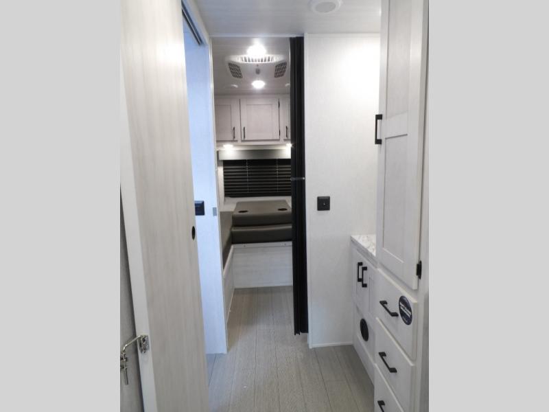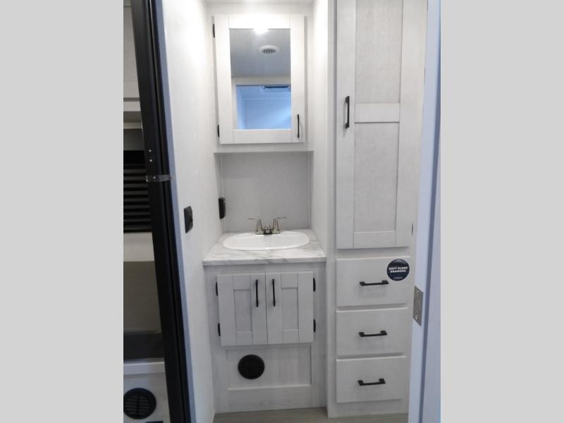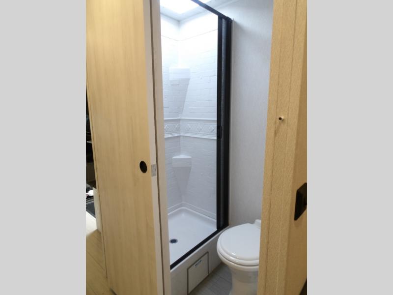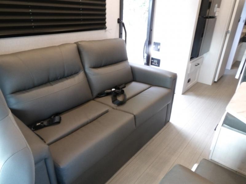 This coach is perfect for traveling with a friend or honey since there are two twin beds that can convert to a king-size bed if you choose! There is a 62" sofa and 42" x 68" booth dinette in the main living area that can double as seating and sleeping space, plus there is a bunk over cab for the little ones. Once you are fully rested, head to the kitchen to prepare a delicious breakfast feast with the convection microwave and cooktop. Use the double sink to clean up, and the 10.7-cubic foot refrigerator to keep your perishables fresh. You can even add some extra prep space to this area by using the countertop extension.