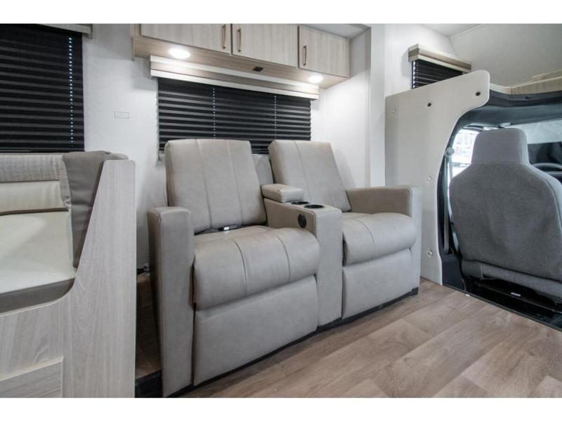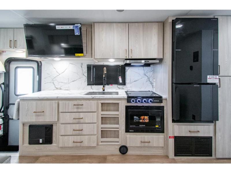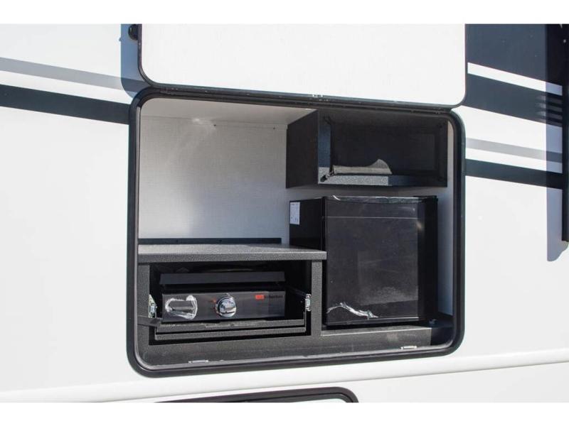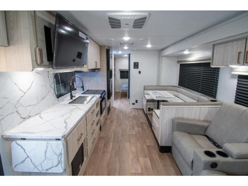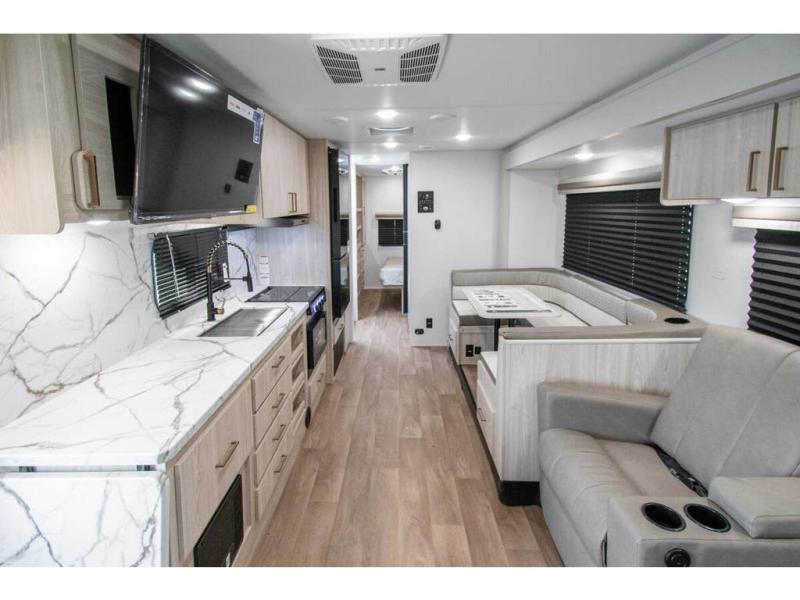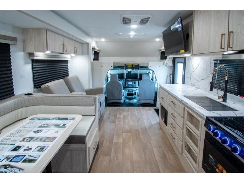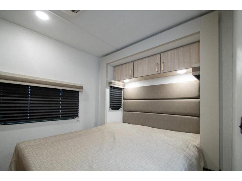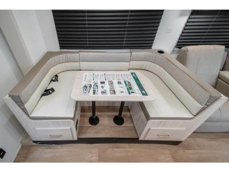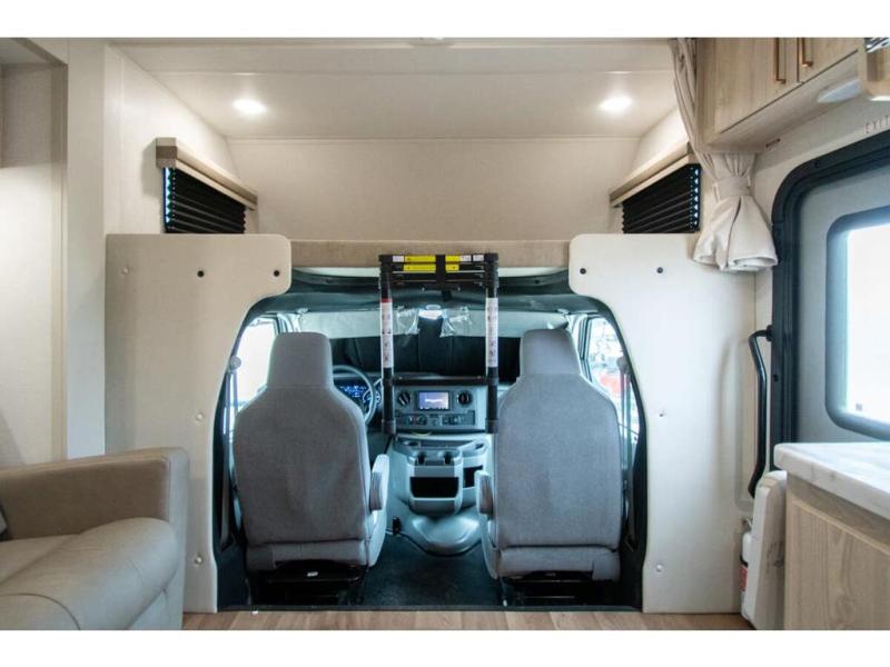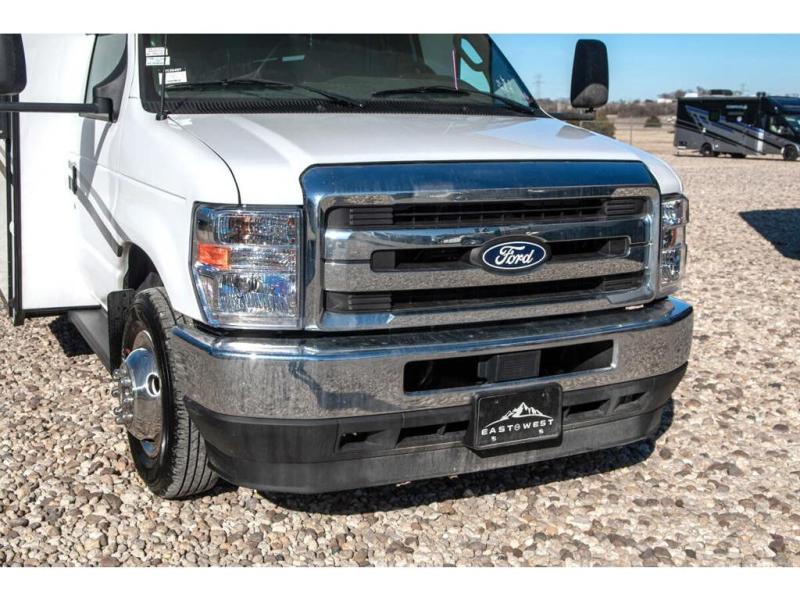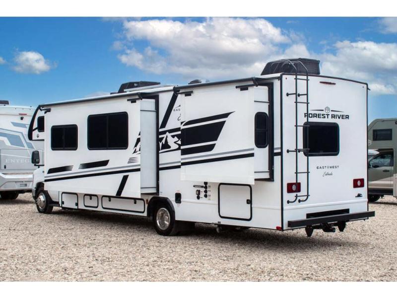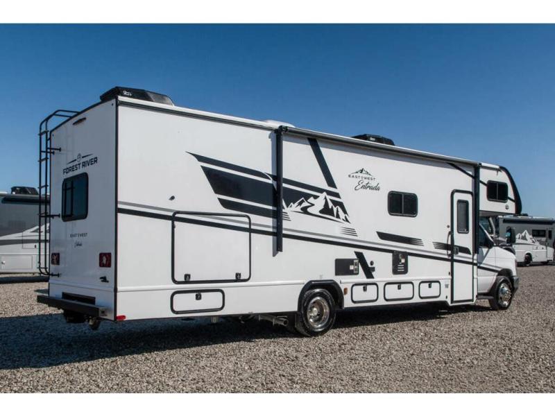With any Entrada Class C gas motorhome from EAST TO WEST, the construction consists of a one-piece painted fiberglass front cap, a TPO roof membrane, and 2" Azdel composite sidewalls for added durability. There are rotocast exterior storage compartments with slam latch doors, along with an exterior LP Quick Connect, and a power awning with an LED light strip. You will also find rear and sideview cameras to help make maneuvering and parking your RV easier than ever. Inside, you'll feel right at home with soft close hardwood cabinet doors and drawers, a high-altitude tankless water heater, plus a 12V smart TV and USB ports to keep your electronics charged up!