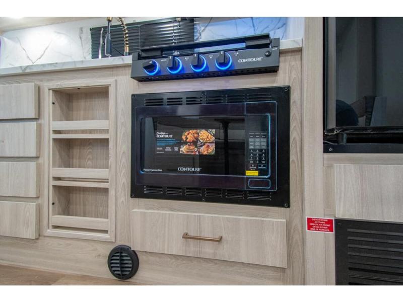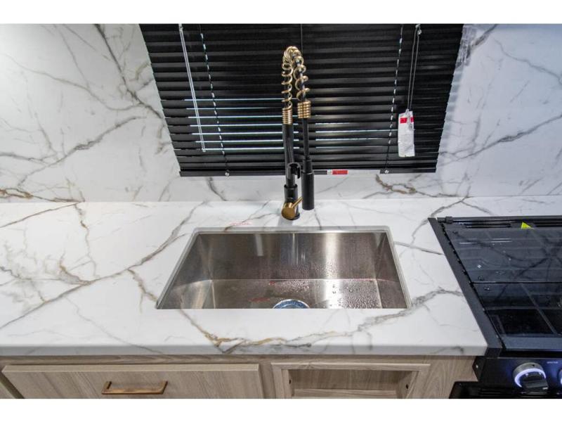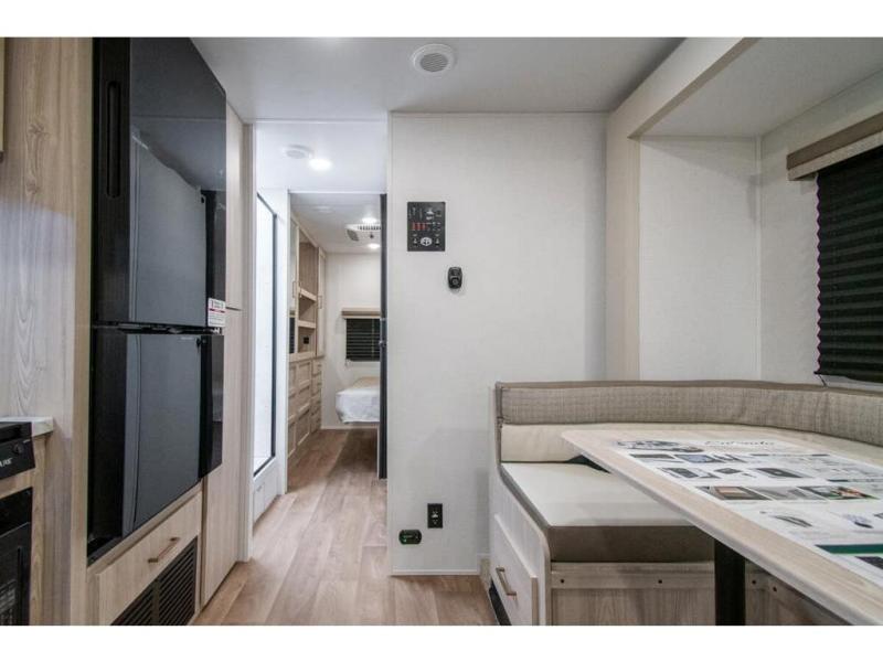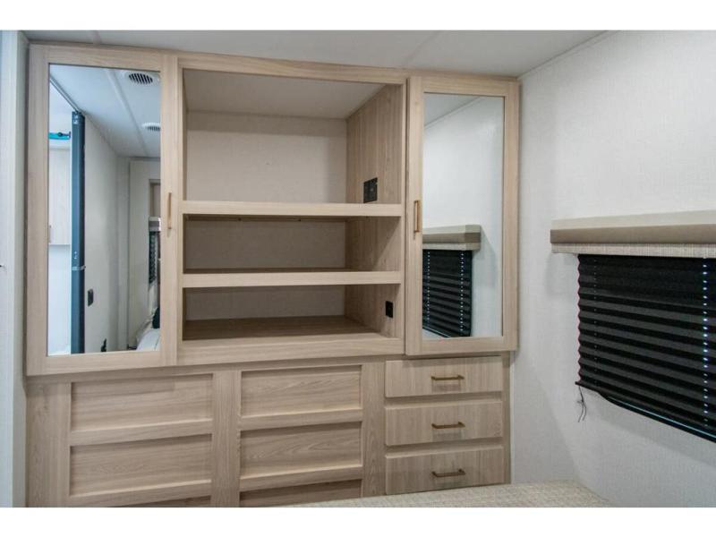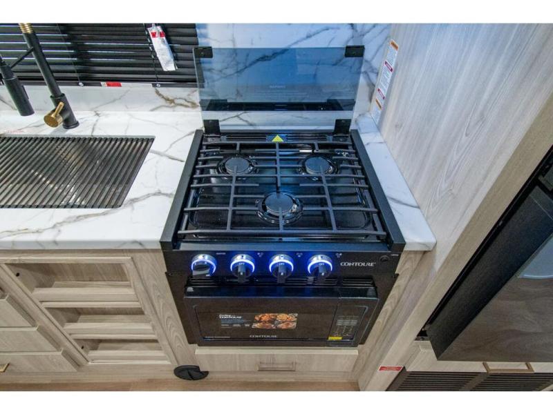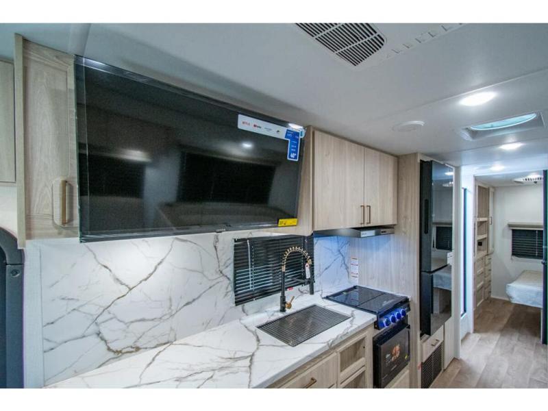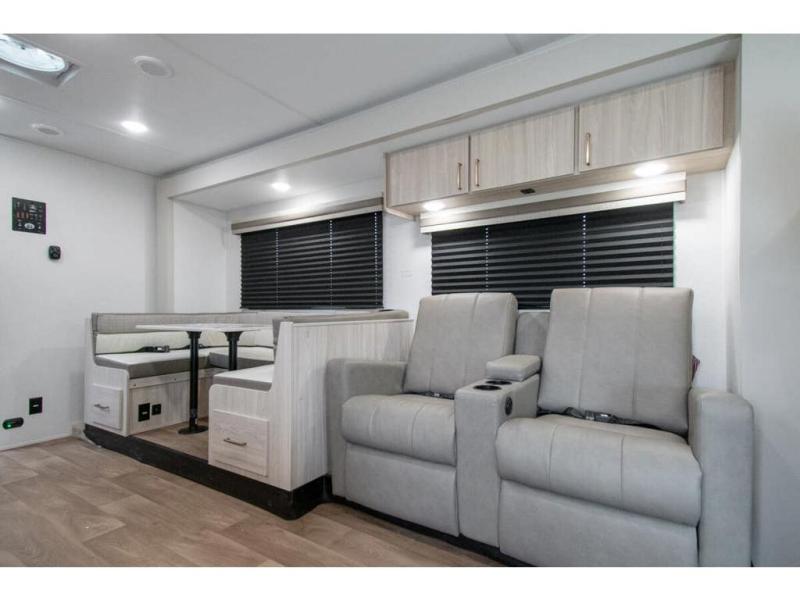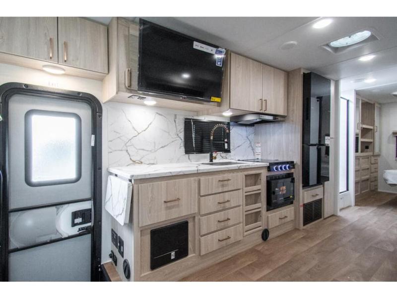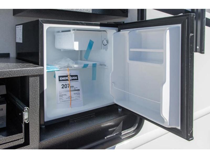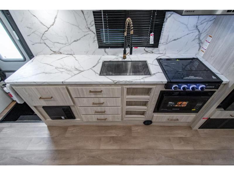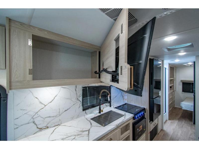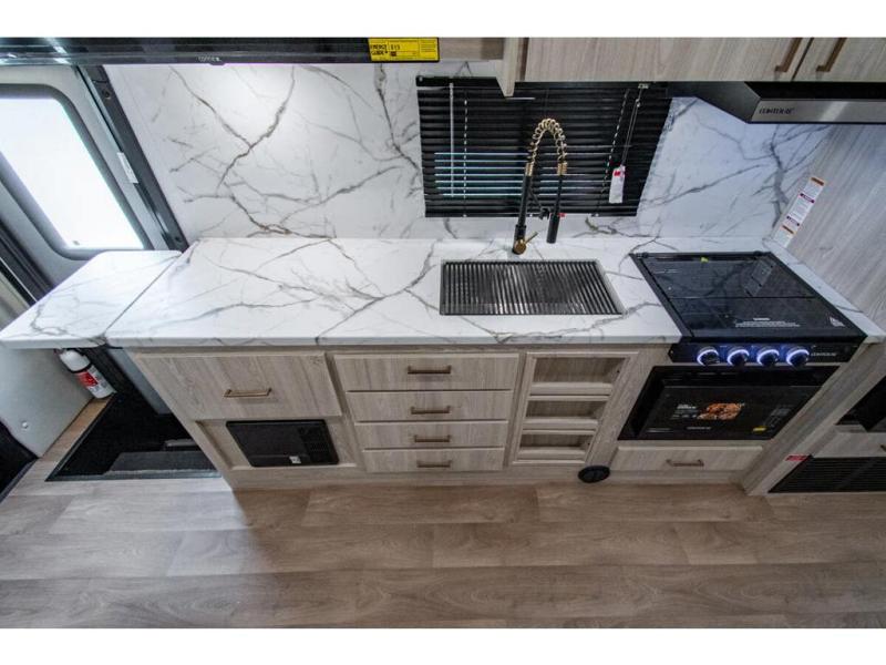 With any Entrada Class C gas motorhome from EAST TO WEST, the construction consists of a one-piece painted fiberglass front cap, a TPO roof membrane, and 2" Azdel composite sidewalls for added durability. There are rotocast exterior storage compartments with slam latch doors, along with an exterior LP Quick Connect, and a power awning with an LED light strip. You will also find rear and sideview cameras to help make maneuvering and parking your RV easier than ever. Inside, you'll feel right at home with soft close hardwood cabinet doors and drawers, a high-altitude tankless water heater, plus a 12V smart TV and USB ports to keep your electronics charged up!