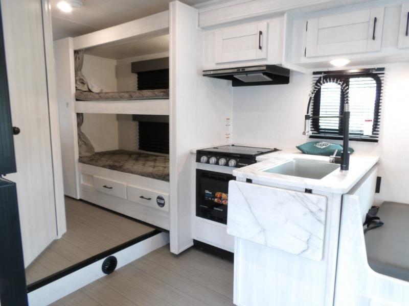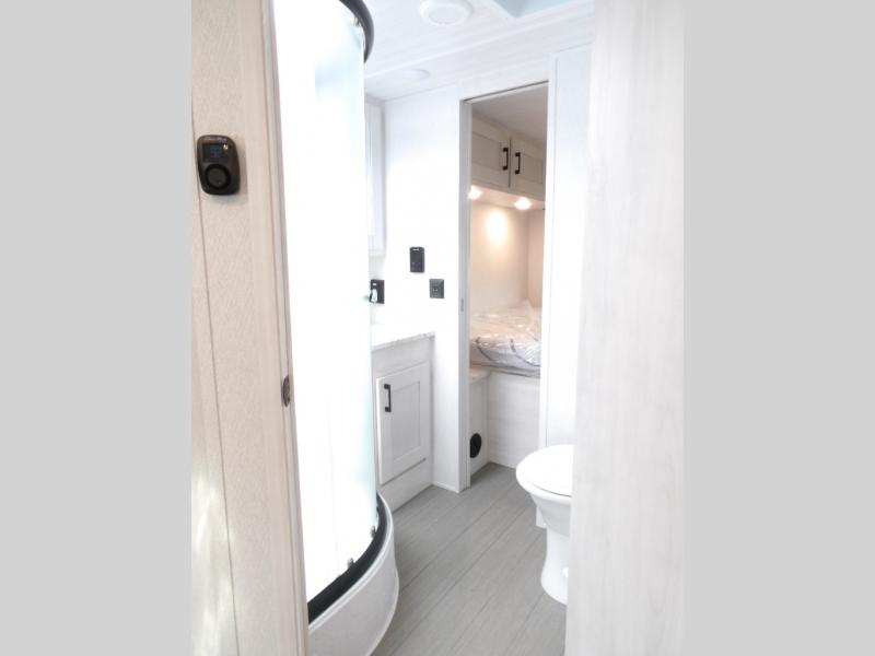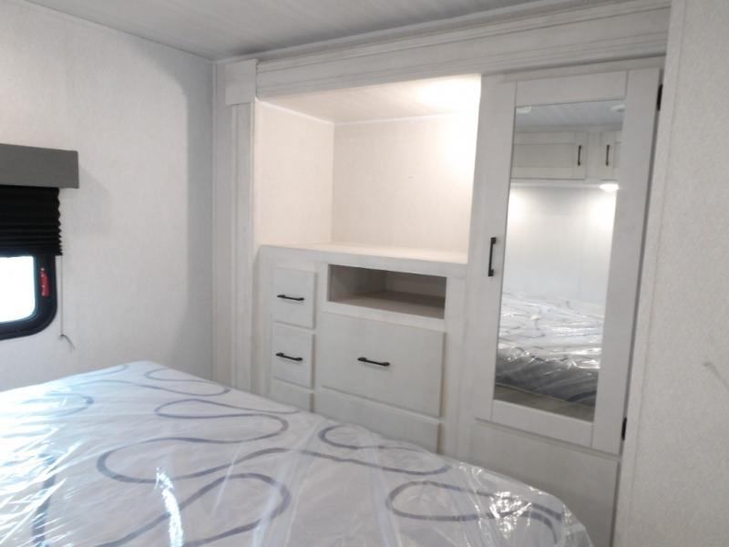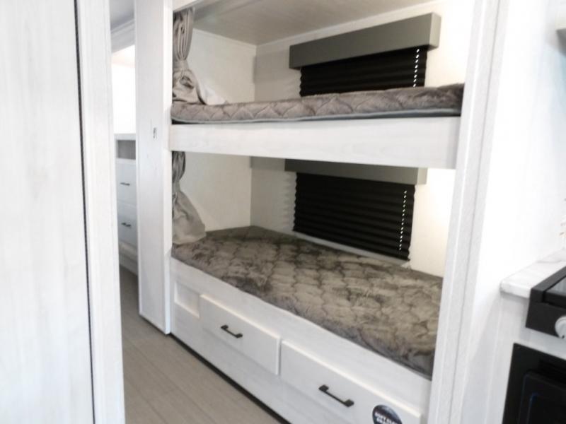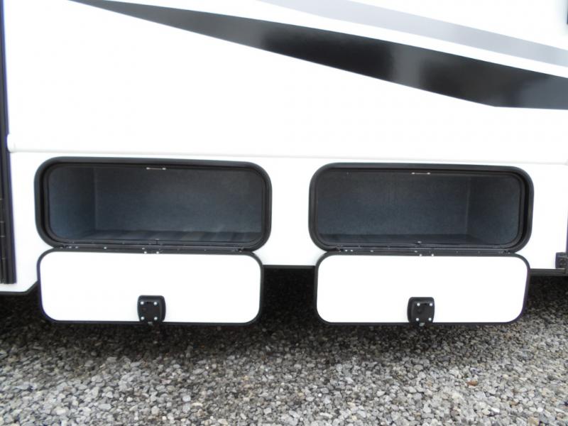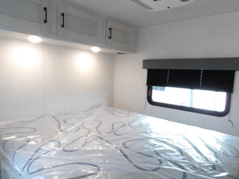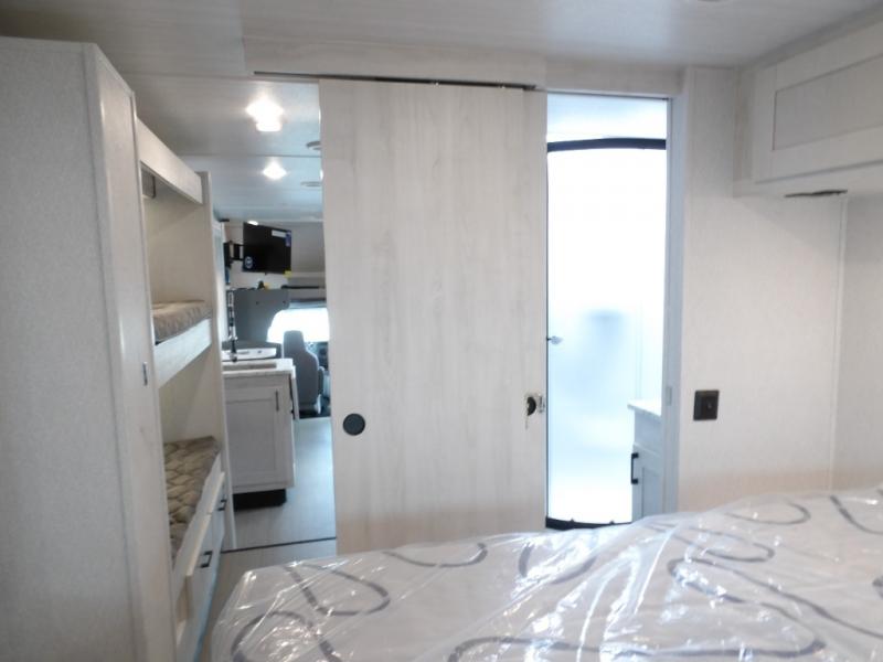 This Entrada Class C gas motorhome has quite a lot of class and comfort! Every inch of this coach has added living space because of the full-wall slide on the driver's side, and this slide adds extra room for additions like the bunk beds. Not only is there a set of bunks on the slide, but there is also a bunk above the cab if someone else wants to spend the night on a bunk bed. You will have a great night's rest on the queen bed in the rear master suite, and since this bedroom gives you a private entrance into the dual-entry bathroom, you won't have to go far in the middle of the night. This coach also has great entertainment with a 40" 12V, and there is a space prepped in the bedroom if you decide to add another.