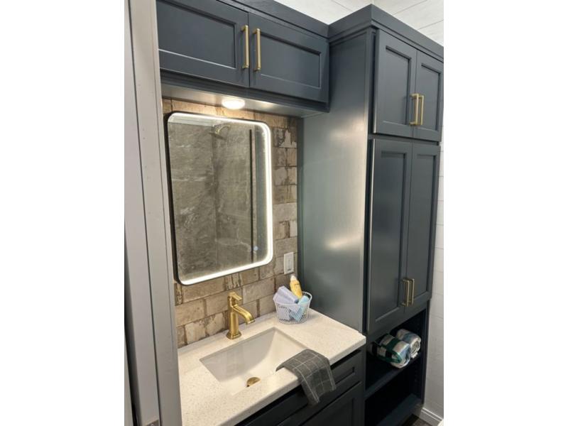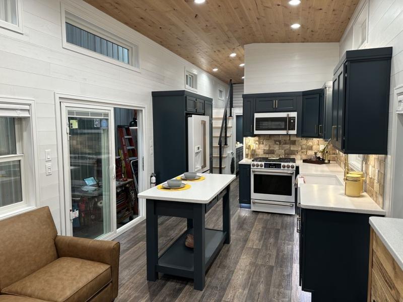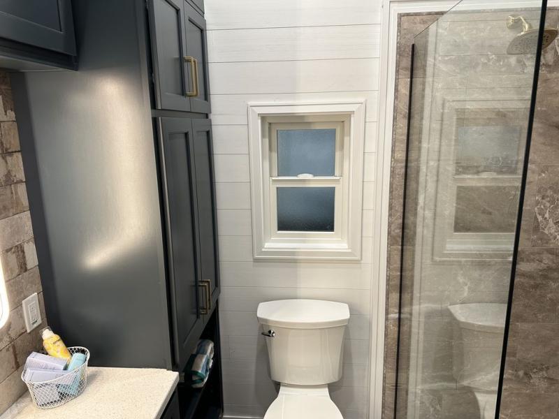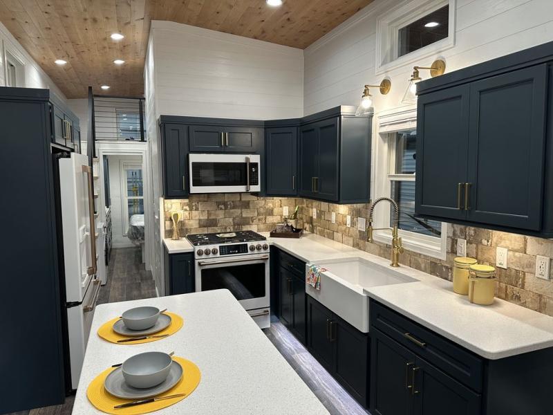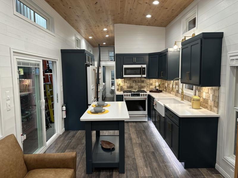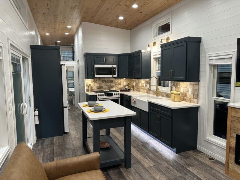 Elevation's park models are the home away from home you need! Built with premium vinyl siding and a standing seam metal roof, these models have a maximum square footage of 400 square feet for efficient space. A 6' vinyl patio door with built-in blinds and shed dormers provide visual interest as well as an open airy feeling. You will love the real hardwood trim package, solid surface countertops throughout, the Kohler industrial kitchen faucet, and high-end staggered cabinetry. There are also LG Smart TVs in the living room and bedroom, full-height tile or stone backsplash, a Serta mattress, and many more interior comforts. Each unit can be customized with a wide variety of colors, window designs, bathroom layouts, and other personalized modifications to the floorplan.