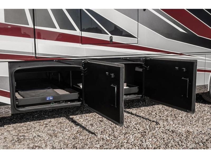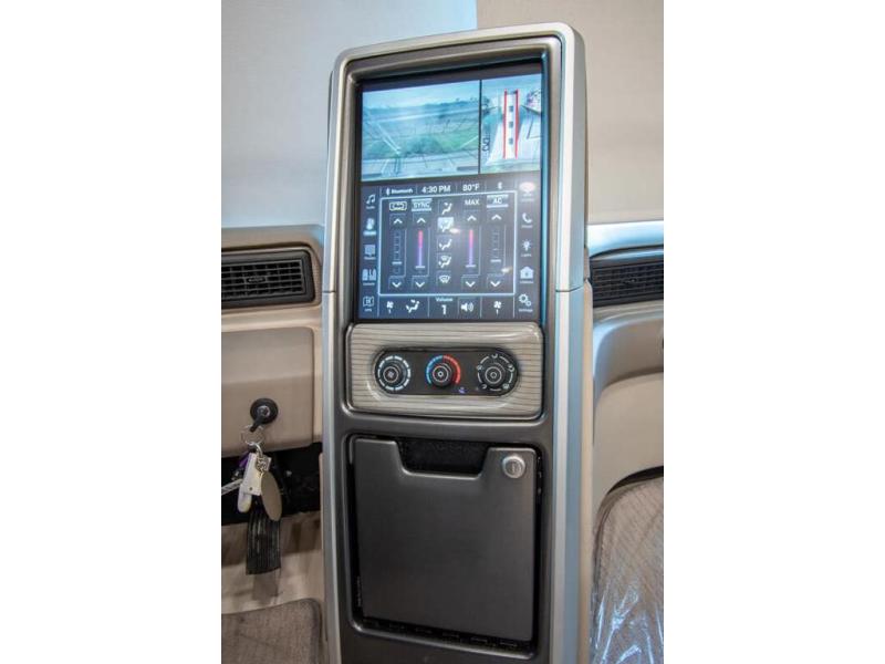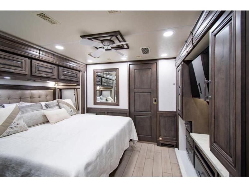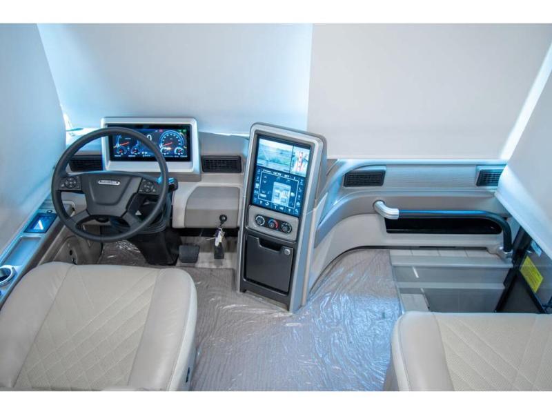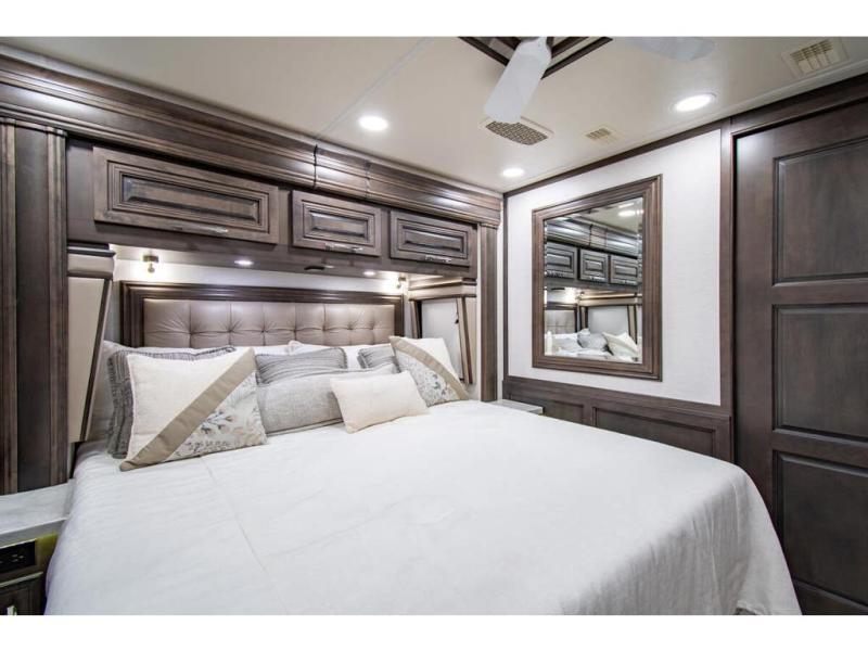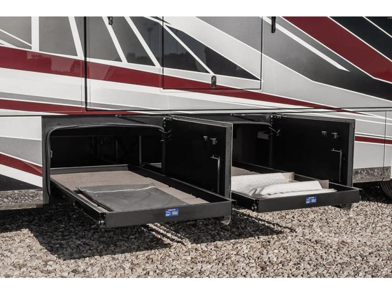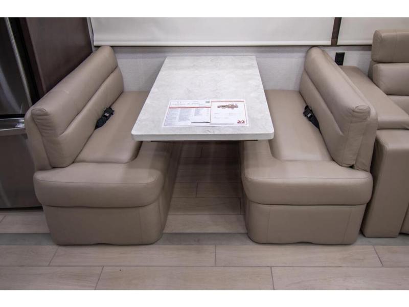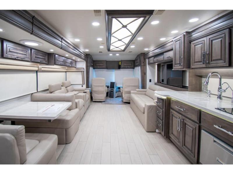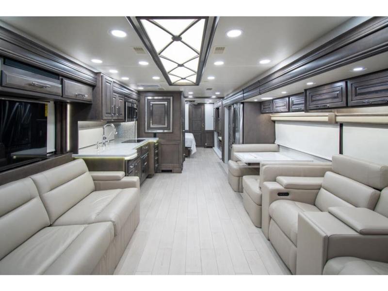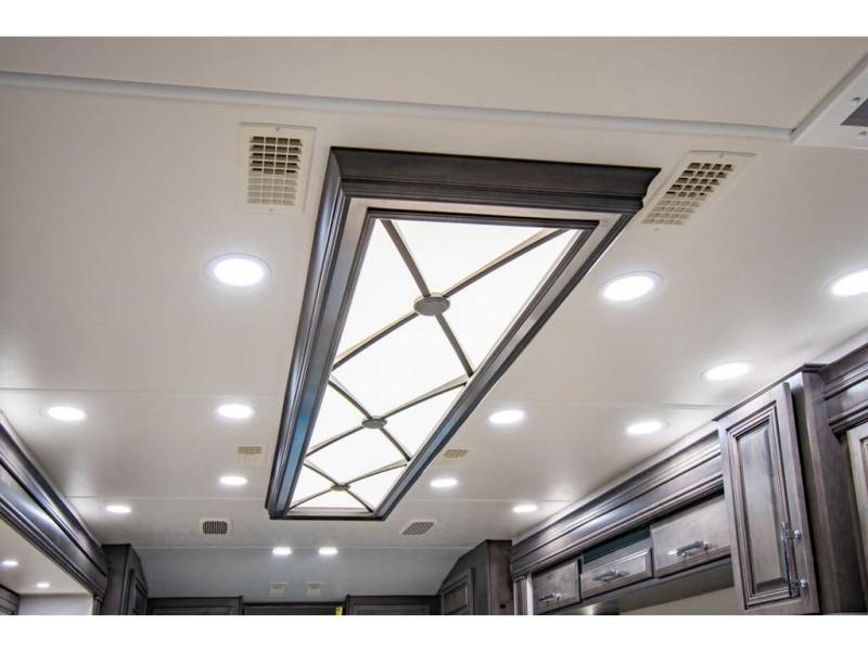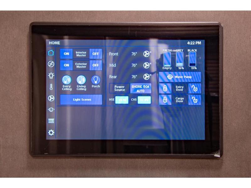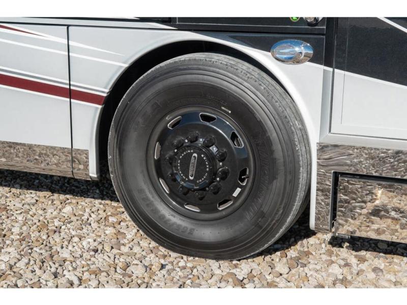 With any Anthem Class A diesel motorhome by Entegra Coach, setting up camp has never been easier with the 15-inch digital dash displaying an integrated 360-degree surround view system with fourteen smart radar sensors and six HD cameras plus the Valid air leveling system. Each roof is constructed with arched aluminum trusses filled with batt insulation and reflective Flexfoil topped with plywood decking then one-piece fiberglass, exterior walls with Aluma-Tru welded tubular aluminum studs, insulated front and rear caps, and X-Bridge bracing welded into the chassis frame. The interior provides the Firefly multiplex system with 10-inch VegaTouch touchscreen for complete integration of the coach controls with remote monitoring and control from the available mobile app, a decorative ceiling feature with integrated accent lighting, powered solar day and blackout night shades, and Aire-Secure travel locks for all pocket doors!