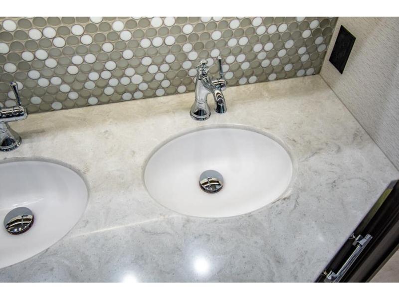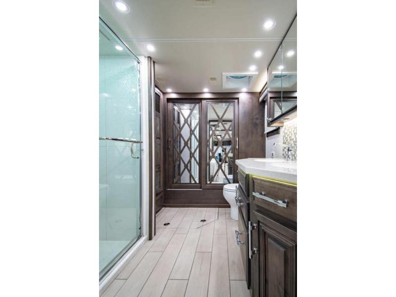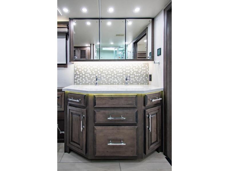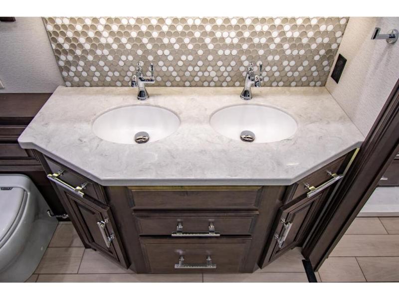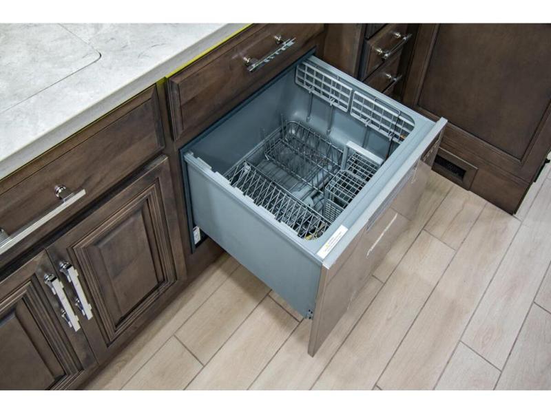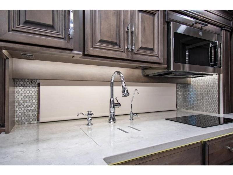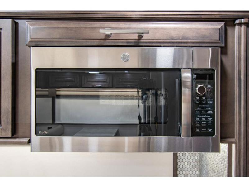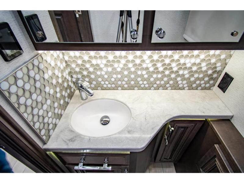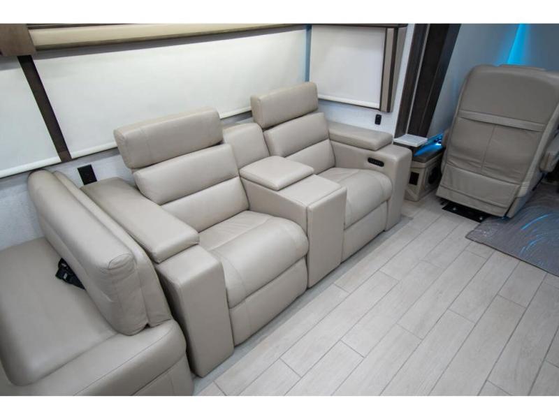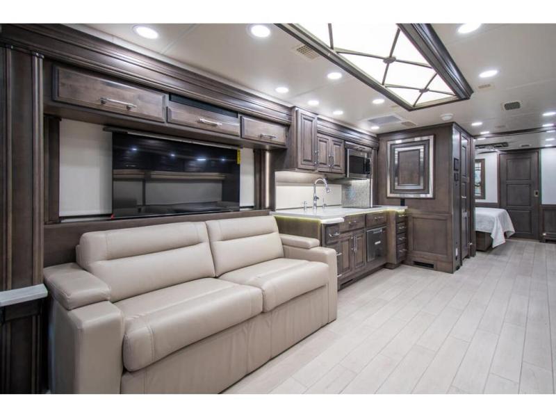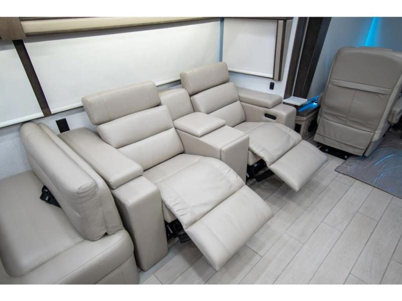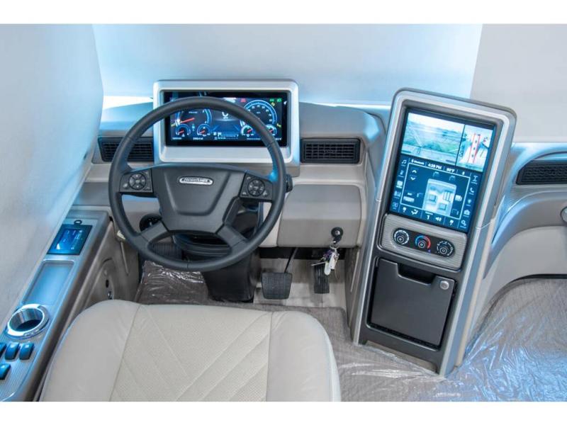 With any Anthem Class A diesel motorhome by Entegra Coach, setting up camp has never been easier with the 15-inch digital dash displaying an integrated 360-degree surround view system with fourteen smart radar sensors and six HD cameras plus the Valid air leveling system. Each roof is constructed with arched aluminum trusses filled with batt insulation and reflective Flexfoil topped with plywood decking then one-piece fiberglass, exterior walls with Aluma-Tru welded tubular aluminum studs, insulated front and rear caps, and X-Bridge bracing welded into the chassis frame. The interior provides the Firefly multiplex system with 10-inch VegaTouch touchscreen for complete integration of the coach controls with remote monitoring and control from the available mobile app, a decorative ceiling feature with integrated accent lighting, powered solar day and blackout night shades, and Aire-Secure travel locks for all pocket doors!