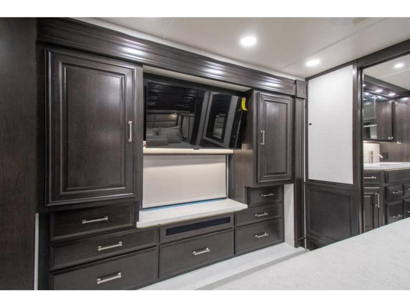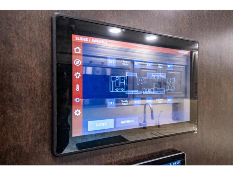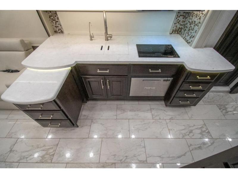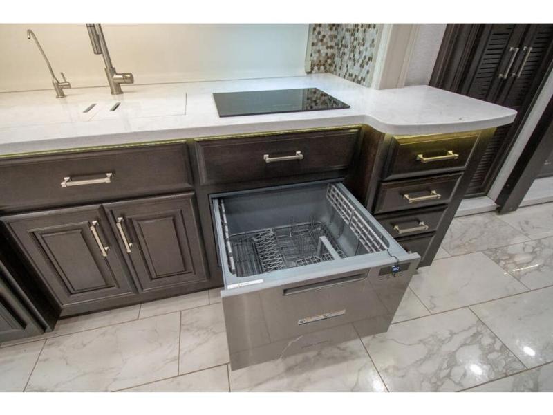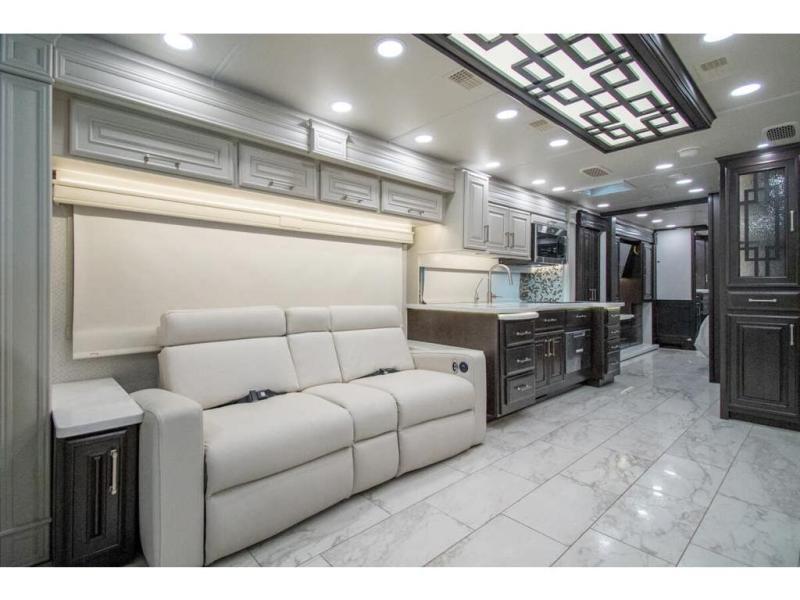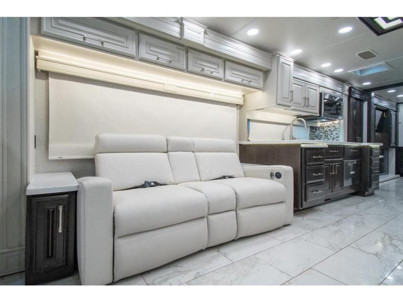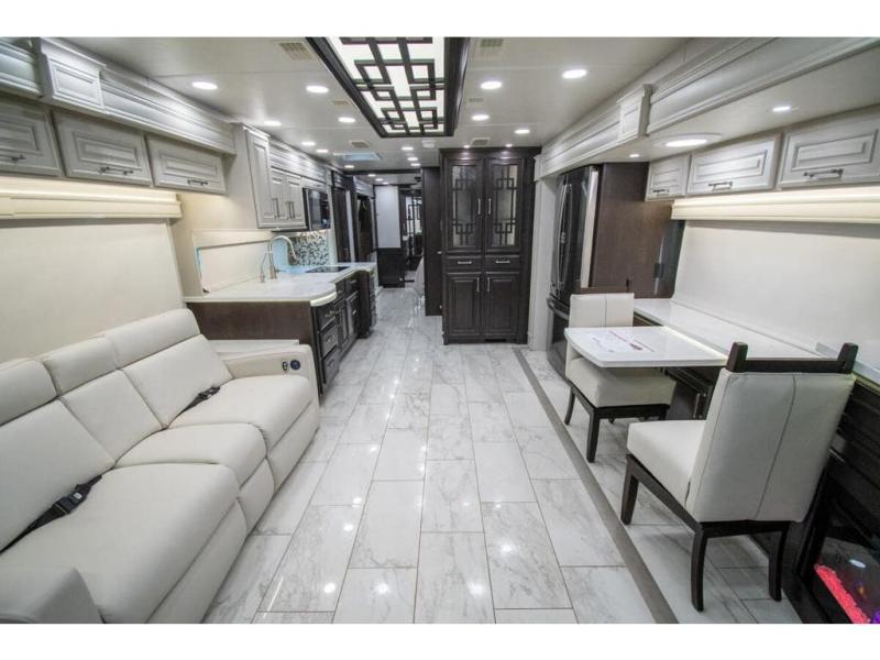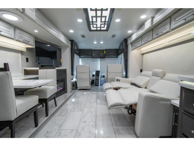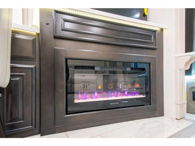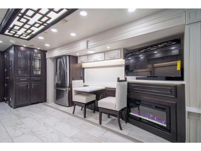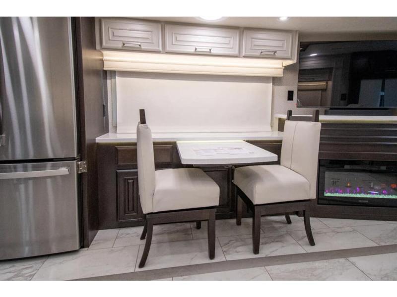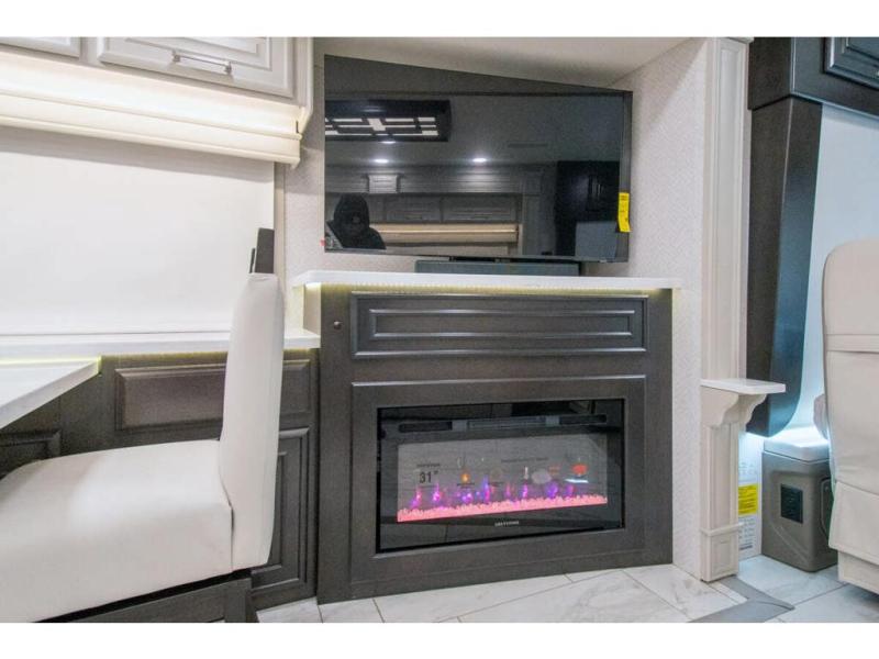 Summers spent at the campground can be spent in luxury with this spacious Aspire coach! There are four slides, plus a bath and a half that will be perfect if you have guests. The living area will feel just like home with its 100" 3-seat power reclining sofa, fireplace, and 50" TV, and there is a free-standing dinette to dine together. Making meals while you're away from home is easy in the kitchen with a two burner induction cooktop, a convection microwave, plus a pantry and a residential refrigerator for food storage. You will love the king bed slide out that features a gel memory foam mattress, two wardrobes to store your clothes, plus your own 43" TV with drawers below. And your evenings can be spent outdoors with the exterior entertainment center and dual Girard awnings with LED lights!