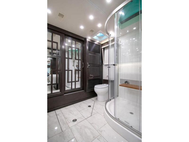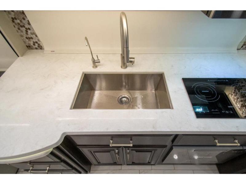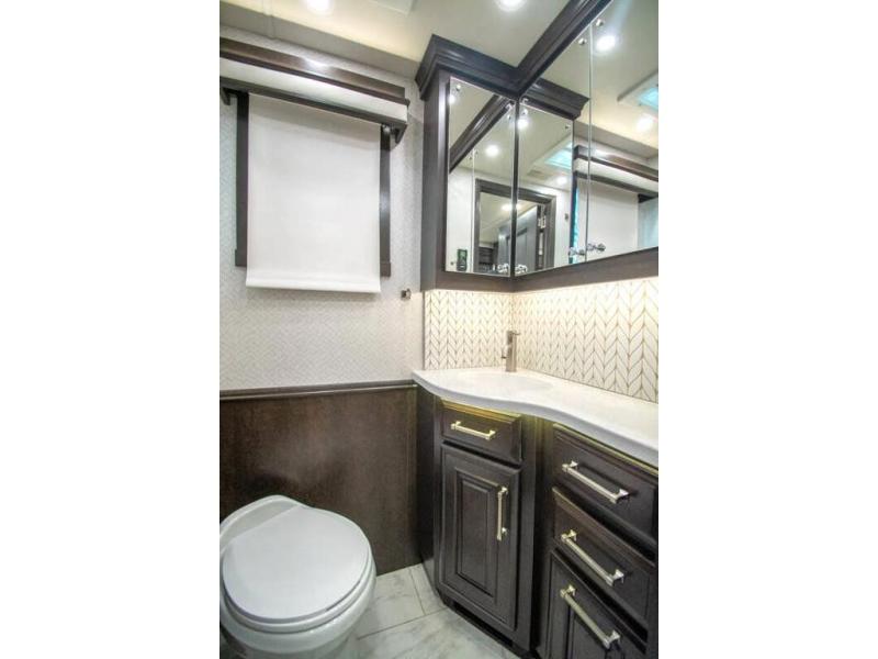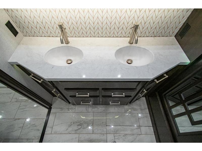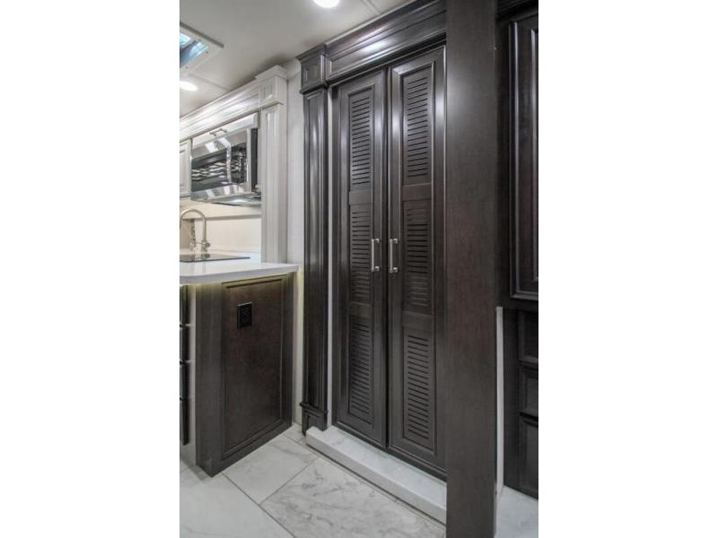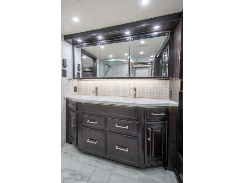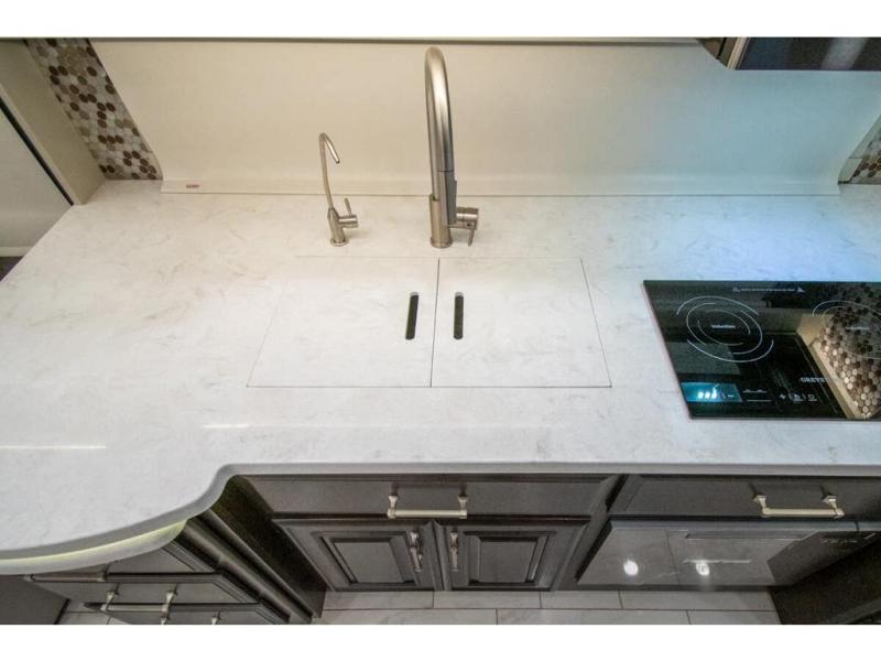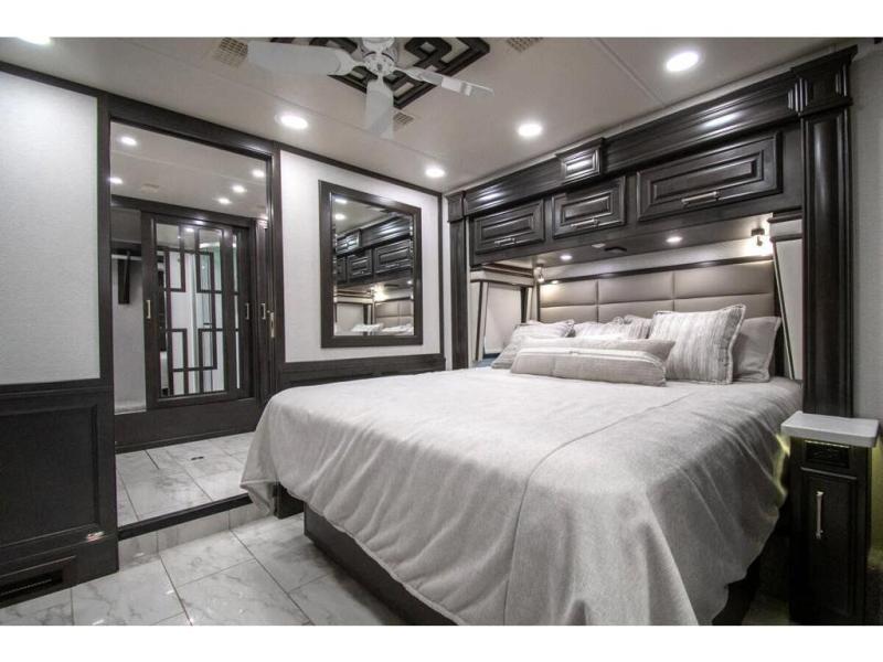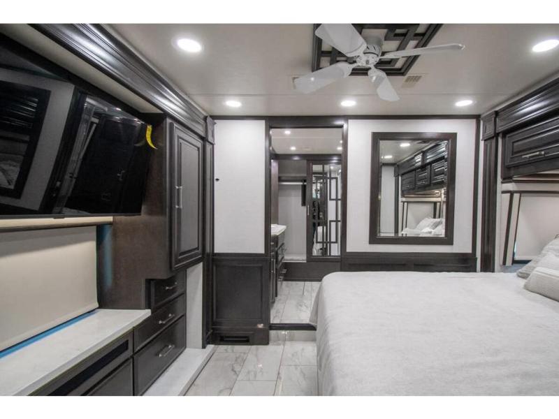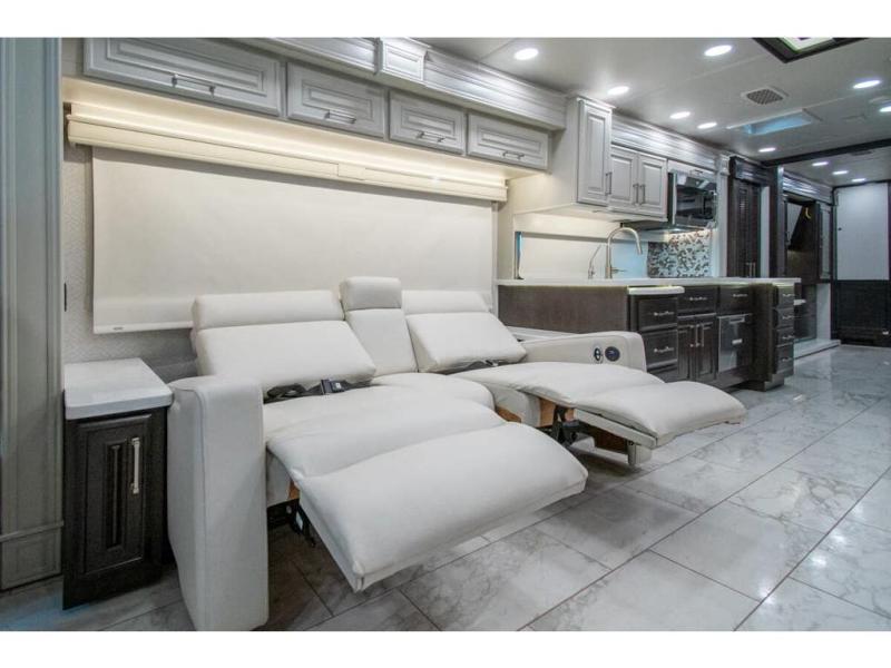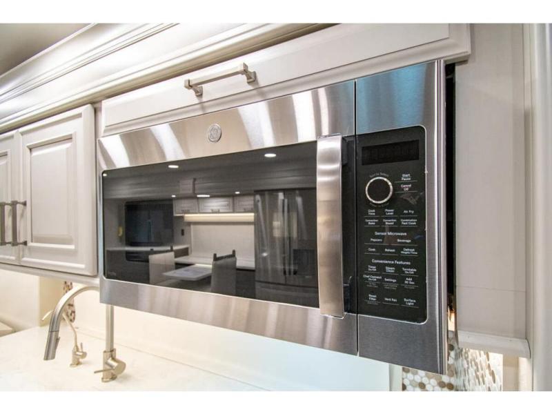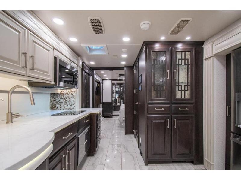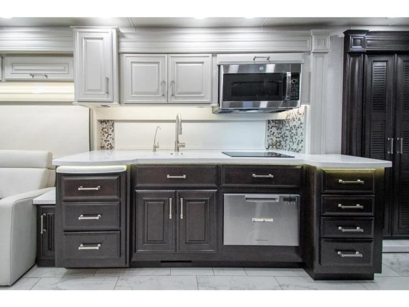 Summers spent at the campground can be spent in luxury with this spacious Aspire coach! There are four slides, plus a bath and a half that will be perfect if you have guests. The living area will feel just like home with its 100" 3-seat power reclining sofa, fireplace, and 50" TV, and there is a free-standing dinette to dine together. Making meals while you're away from home is easy in the kitchen with a two burner induction cooktop, a convection microwave, plus a pantry and a residential refrigerator for food storage. You will love the king bed slide out that features a gel memory foam mattress, two wardrobes to store your clothes, plus your own 43" TV with drawers below. And your evenings can be spent outdoors with the exterior entertainment center and dual Girard awnings with LED lights!