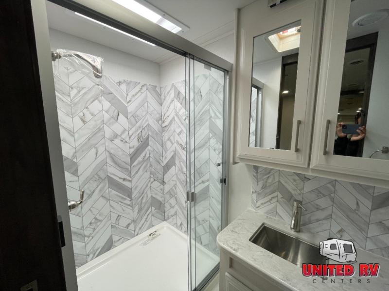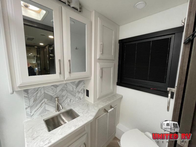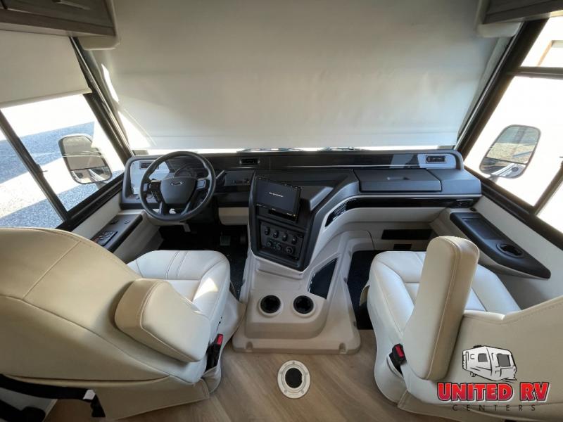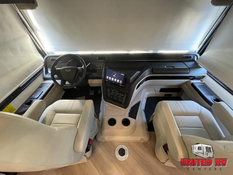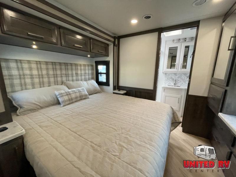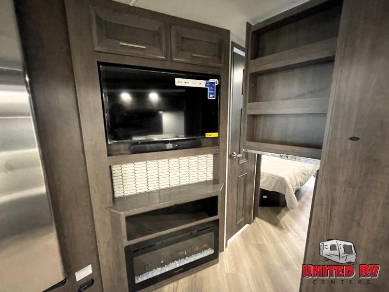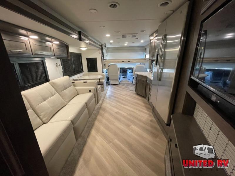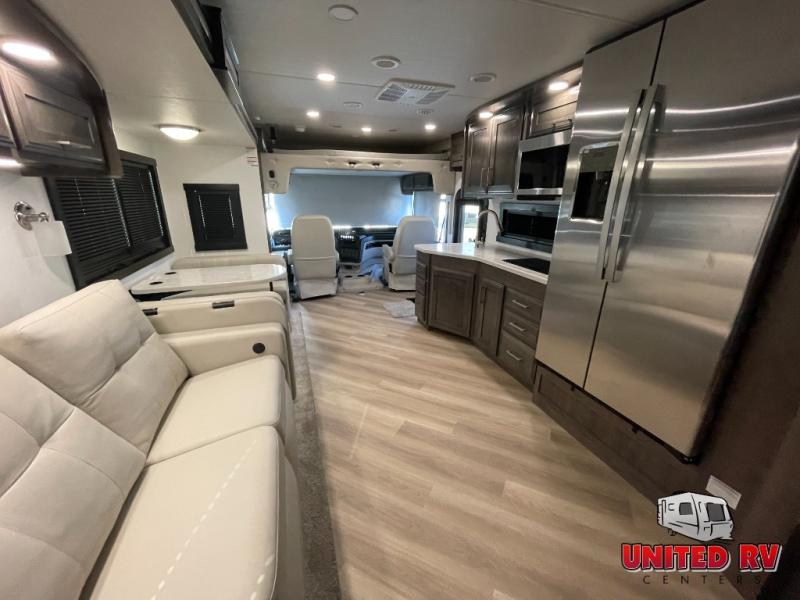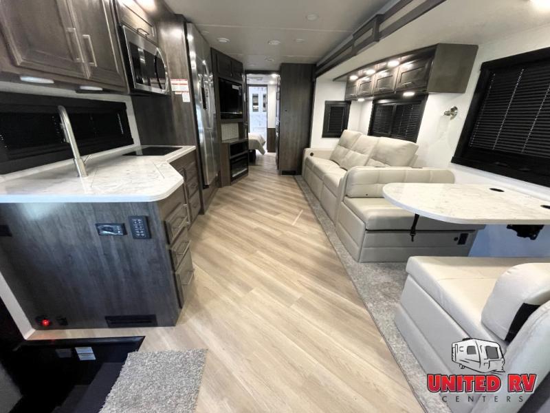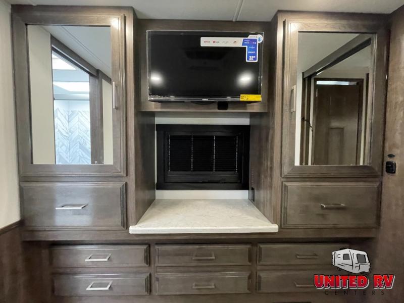 Whether you seek adventure or relaxation, this coach will get you there in comfort and style! There are driver and passenger seats that swivel for more seating once at your destination, a 39" Smart LED HD TV with a fireplace below, and an exterior Smart LED HD TV to watch the big game. You will love the power reclining sofa when visiting with other RVers, and the booth dinette offers a great place to dine and work. The furniture also provides sleeping space if needed, and you can add the drop down overhead bunk option to sleep even more guests. The rear full bathroom offers you a shower, medicine cabinet, linen storage and a space saving sliding door into the bedroom with a king bed slide, clothing storage and a space to add a washer/dryer combo option. And the cook will have full amenities including a residential refrigerator to hold all the cold items.