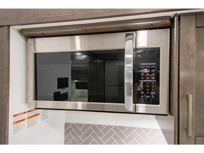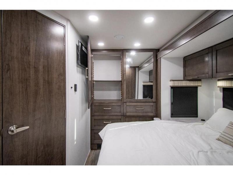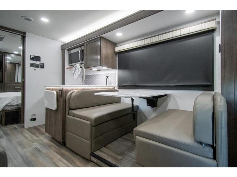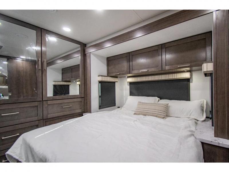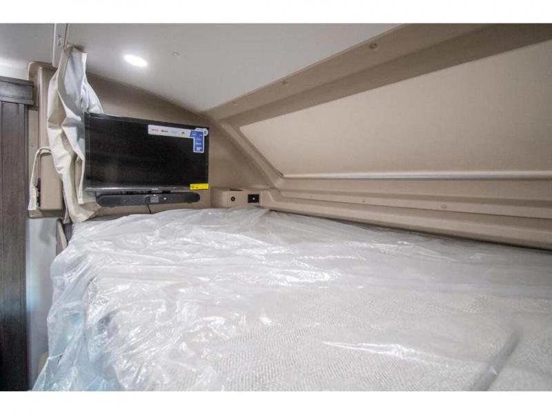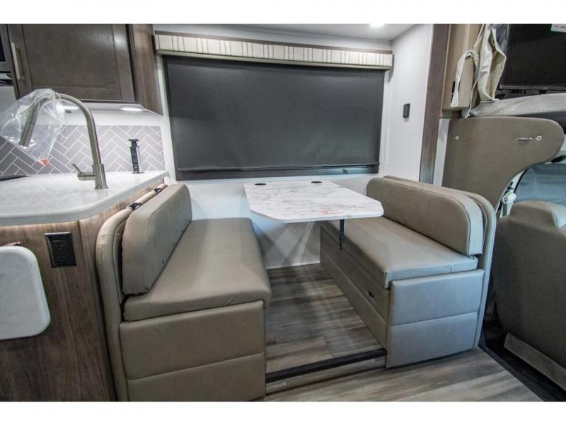 You can bring a few guests to join in on the fun with this motorhome! The bunk over cab and 66" x 76" king bed offer comfortable places to sleep, plus you can transform the booth dinette and the sofa into extra sleeping spaces if needed. Everyone can freshen up each morning with the 30" x 36" shower in the rear corner bathroom, and keep their bellies full with a Furrion all-in-one cooktop and oven plus a residential microwave. There is even a countertop extension to make meal prepping easier. Take the fun outside and watch movies on the exterior LED HD Smart TV while staying protected by the 18' electric awning with LED lights!