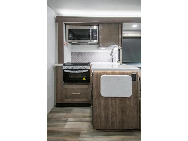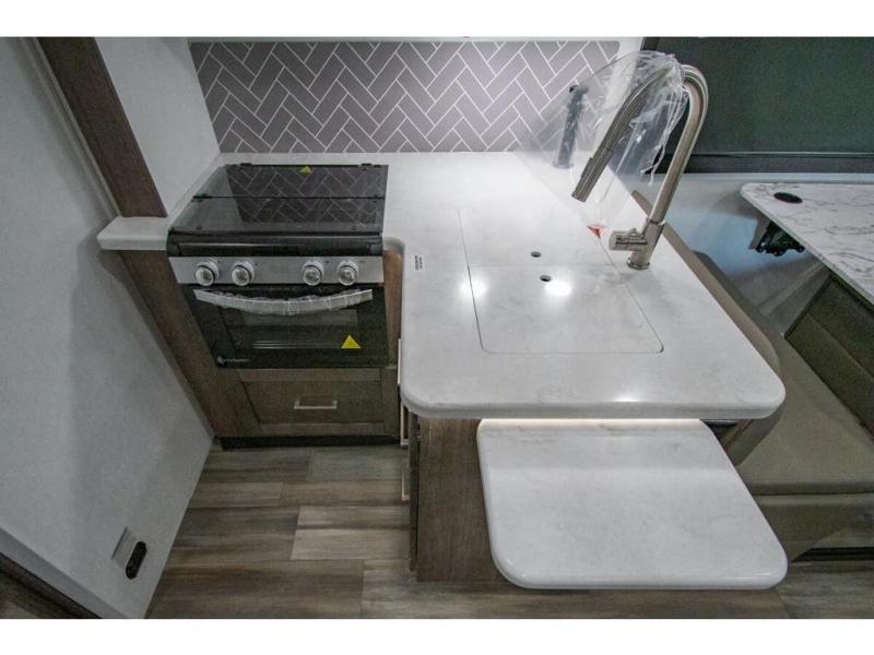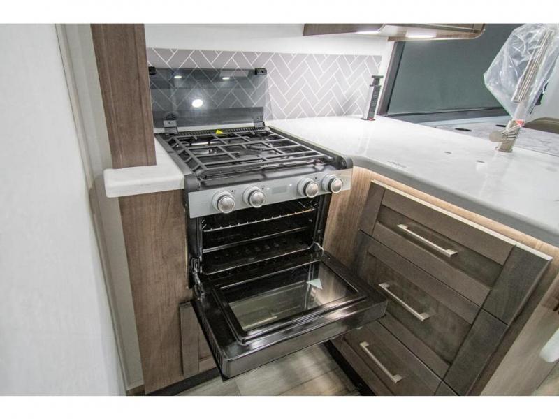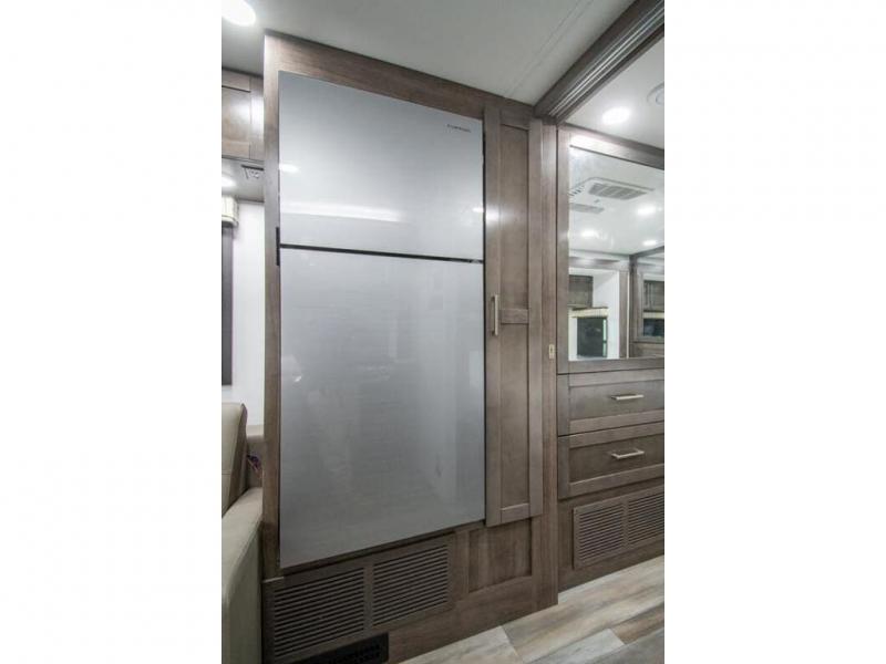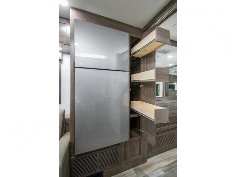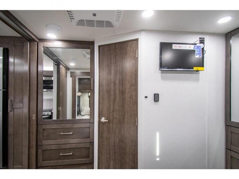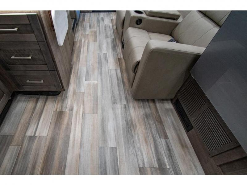 You can bring a few guests to join in on the fun with this motorhome! The bunk over cab and 66" x 76" king bed offer comfortable places to sleep, plus you can transform the booth dinette and the sofa into extra sleeping spaces if needed. Everyone can freshen up each morning with the 30" x 36" shower in the rear corner bathroom, and keep their bellies full with a Furrion all-in-one cooktop and oven plus a residential microwave. There is even a countertop extension to make meal prepping easier. Take the fun outside and watch movies on the exterior LED HD Smart TV while staying protected by the 18' electric awning with LED lights!
