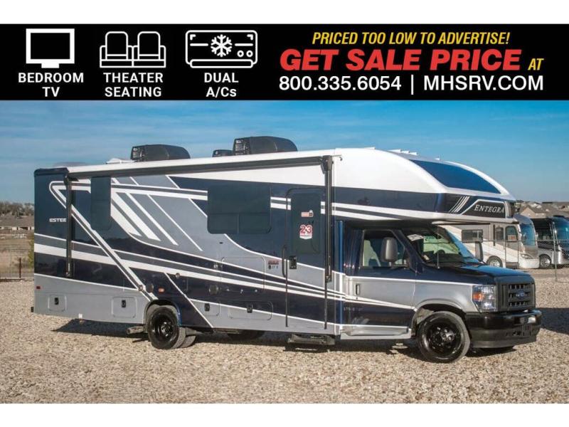 Make one of these Entegra Coach Esteem Class C gas motorhomes your own! The interior design includes solid-surface countertops that pair well with the many technological upgrades. The fully custom-molded ABS surround in the cab area features its signature panoramic window and power shade for a beautiful view while you drive and provide privacy at night. They also come with E-Z Drive Elite which has a computer-balanced driveshaft, Koni FSD shocks, Hellwig helper springs, and a heavy-duty rear stabilizer bar for a smooth ride. Automatic leveling jacks will make set-up a breeze and the electric awning with LED lights will create an outdoor living space where you can relax after unpacking. Inside, you'll enjoy hardwood cabinet doors and drawer fronts, blackout night roller shades, and high-intensity recessed LED ceiling lights to keep your space well lit. There is also a JBL audio system and a BMPRO total coach control system to easily manage your unit's functions!