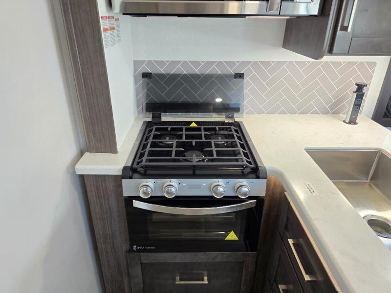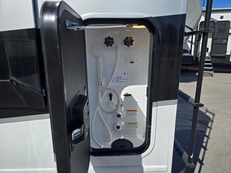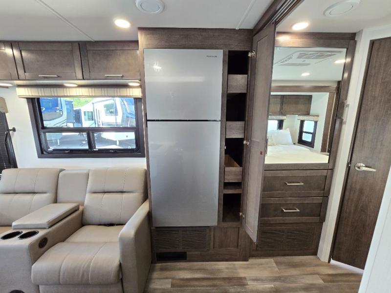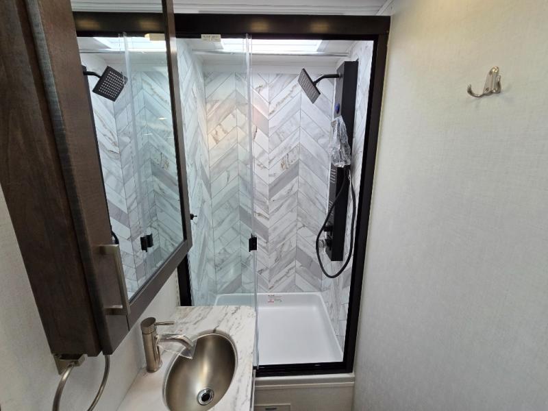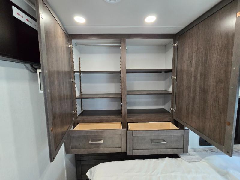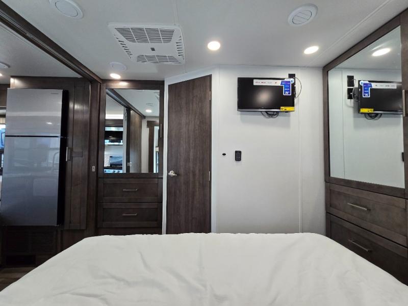 You can bring a few guests to join in on the fun with this motorhome! The bunk over cab and 66" x 76" king bed offer comfortable places to sleep, plus you can transform the booth dinette and the sofa into extra sleeping spaces if needed. Everyone can freshen up each morning with the 30" x 36" shower in the rear corner bathroom, and keep their bellies full with a Furrion all-in-one cooktop and oven plus a residential microwave. There is even a countertop extension to make meal prepping easier. Take the fun outside and watch movies on the exterior LED HD Smart TV while staying protected by the 18' electric awning with LED lights!