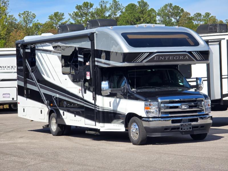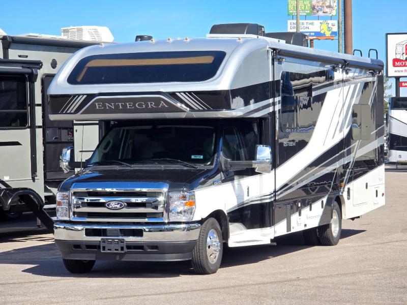 Make one of these Entegra Coach Esteem Class C gas motorhomes your own! The interior design includes solid-surface countertops that pair well with the many technological upgrades. The fully custom-molded ABS surround in the cab area features its signature panoramic window and power shade for a beautiful view while you drive and provide privacy at night. They also come with E-Z Drive Elite which has a computer-balanced driveshaft, Koni FSD shocks, Hellwig helper springs, and a heavy-duty rear stabilizer bar for a smooth ride. Automatic leveling jacks will make set-up a breeze and the electric awning with LED lights will create an outdoor living space where you can relax after unpacking. Inside, you'll enjoy hardwood cabinet doors and drawer fronts, blackout night roller shades, and high-intensity recessed LED ceiling lights to keep your space well lit. There is also a JBL audio system and a BMPRO total coach control system to easily manage your unit's functions!