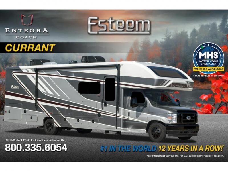 Make one of these Entegra Coach Esteem Class C gas motorhomes your own! The interior design includes solid-surface countertops that pair well with the many technological upgrades. The fully custom-molded ABS surround in the cab area features its signature panoramic window and power shade for a beautiful view while you drive and provide privacy at night. They also come with E-Z Drive Elite which has a computer-balanced driveshaft, Koni FSD shocks, Hellwig helper springs, and a heavy-duty rear stabilizer bar for a smooth ride. Automatic leveling jacks will make set-up a breeze and the electric awning with LED lights will create an outdoor living space where you can relax after unpacking. Inside, you'll enjoy hardwood cabinet doors and drawer fronts, blackout night roller shades, and high-intensity recessed LED ceiling lights to keep your space well lit. There is also a JBL audio system and a BMPRO total coach control system to easily manage your unit's functions!