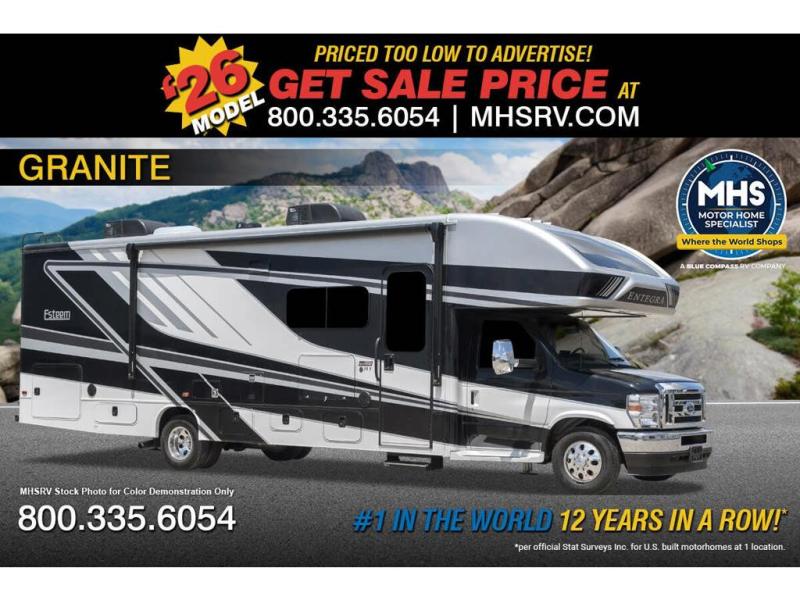 Make one of these Entegra Coach Esteem Class C gas motorhomes your own! The interior design includes solid-surface countertops that pair well with the many technological upgrades. The fully custom-molded ABS surround in the cab area features its signature panoramic window and power shade for a beautiful view while you drive and provide privacy at night. They also come with E-Z Drive Elite which has a computer-balanced driveshaft, Koni FSD shocks, Hellwig helper springs, and a heavy-duty rear stabilizer bar for a smooth ride. Automatic leveling jacks will make set-up a breeze and the electric awning with LED lights will create an outdoor living space where you can relax after unpacking. Inside, you'll enjoy hardwood cabinet doors and drawer fronts, blackout night roller shades, and high-intensity recessed LED ceiling lights to keep your space well lit. There is also a JBL audio system and a BMPRO total coach control system to easily manage your unit's functions!