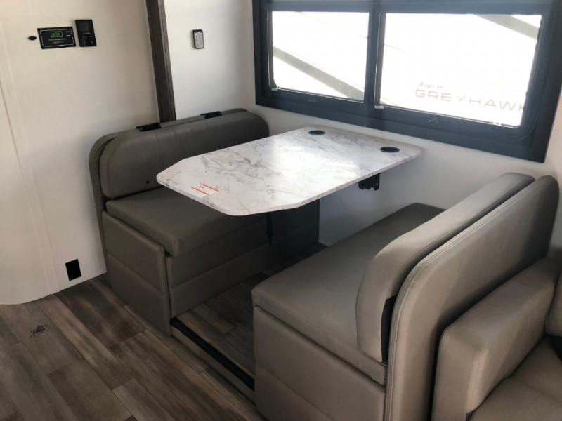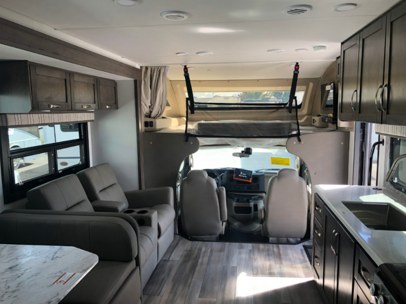 Enjoy a home on wheels with this motorhome! The rear private bedroom has a 60" x 74" queen bed slide to lay your head on at night and dual wardrobes opposite to keep your clothes looking their best. Add the optional TV if you enjoy watching a movie in bed. The separated bathroom makes it easy for one person to freshen up in the 30" x 36" shower while another uses the private toilet and sink. Prepare your best home cooked meals with the Furrion all-in-one cooktop and oven then enjoy them at the booth dinette. The tri-fold sofa offers a comfortable place to relax but it can be switched out for the an optional theater sofa instead. There is also a bunk over cab for more to join in on the fun!