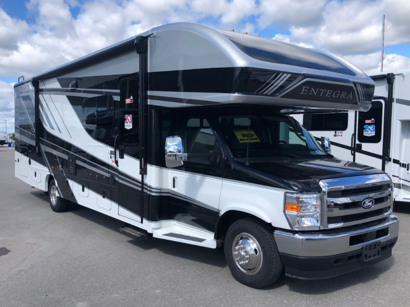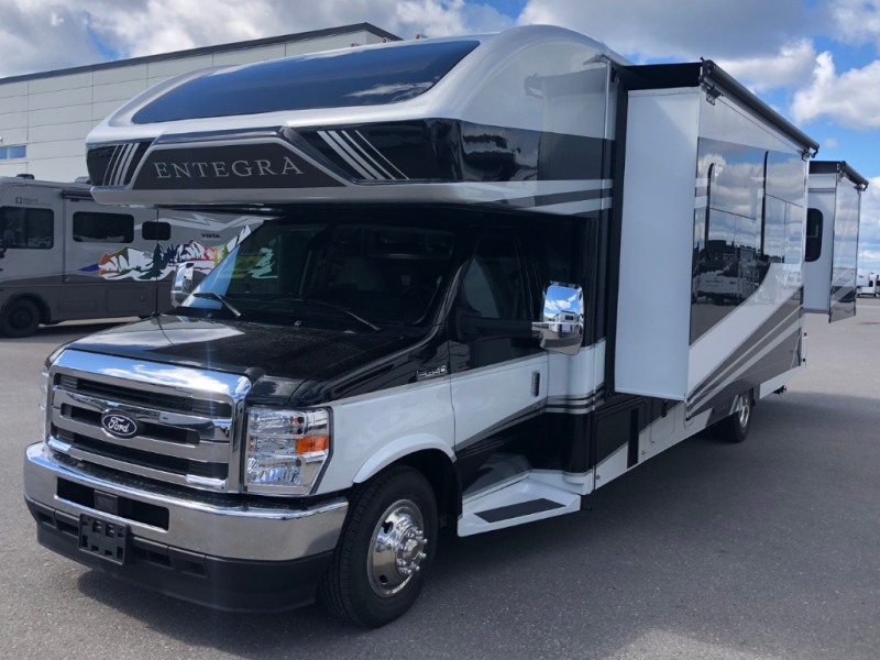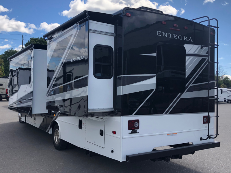 Make one of these Entegra Coach Esteem Class C gas motorhomes your own! The interior design includes solid-surface countertops that pair well with the many technological upgrades. The fully custom-molded ABS surround in the cab area features its signature panoramic window and power shade for a beautiful view while you drive and provide privacy at night. They also come with E-Z Drive Elite which has a computer-balanced driveshaft, Koni FSD shocks, Hellwig helper springs, and a heavy-duty rear stabilizer bar for a smooth ride. Automatic leveling jacks will make set-up a breeze and the electric awning with LED lights will create an outdoor living space where you can relax after unpacking. Inside, you'll enjoy hardwood cabinet doors and drawer fronts, blackout night roller shades, and high-intensity recessed LED ceiling lights to keep your space well lit. There is also a JBL audio system and a BMPRO total coach control system to easily manage your unit's functions!